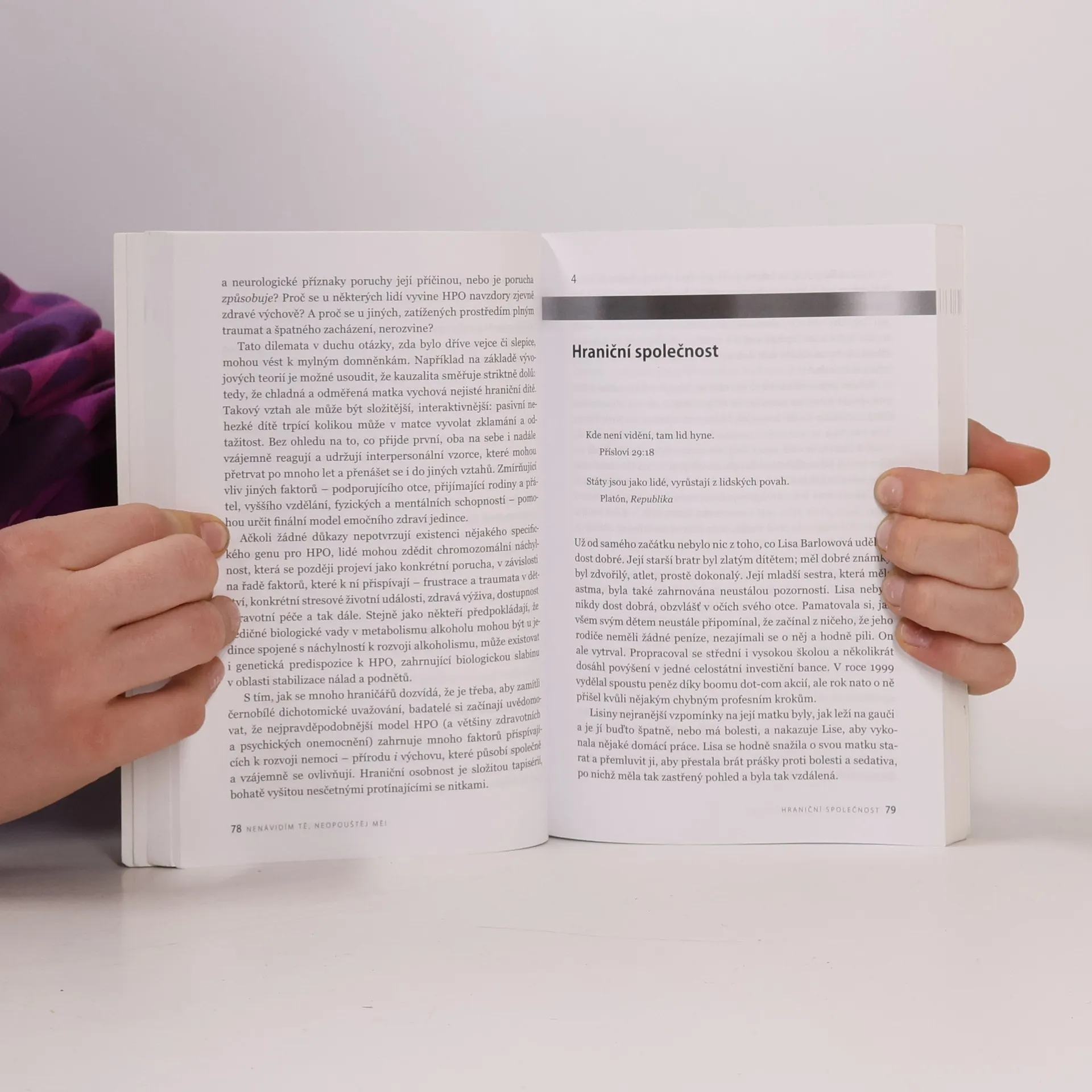 Zvládání hraniční poruchy osobnosti. Pro člověka s hraniční poruchou osobnosti je život jako nekonečná horská dráha bez jasného cíle. Pro jeho blízké, ti kteří s ním žijí, milují ho nebo ho ohrožují, to může být stejně divoká, beznadějná a frustrující jízda. Změny nálad přicházejí náhle, jsou výbušné a srážejí hraniční osobnost z nebeských výšin radosti do hlubin deprese. V jeden okamžik plni hněvu, za okamžik klidní jako beránci, sami tápou, proč a kam je jejich vnitřní zápas žene. Neschopnost pochopit, co se v daný okamžik stalo, následně vyvolává hlubší sebenenávist a depresi. A přesto, jak tvrdí autoři, existuje účinný přístup k léčbě a zvládání této poruchy, jejíž prognóza je při citlivém přístupu velmi nadějná. Na mnoha příkladech z terapeutické praxe líčí příběhy lidí s touto poruchou, její příznaky, předpokládané kořeny, výskyt a představují strukturovanou metodu komunikace s hraničními osobnostmi.