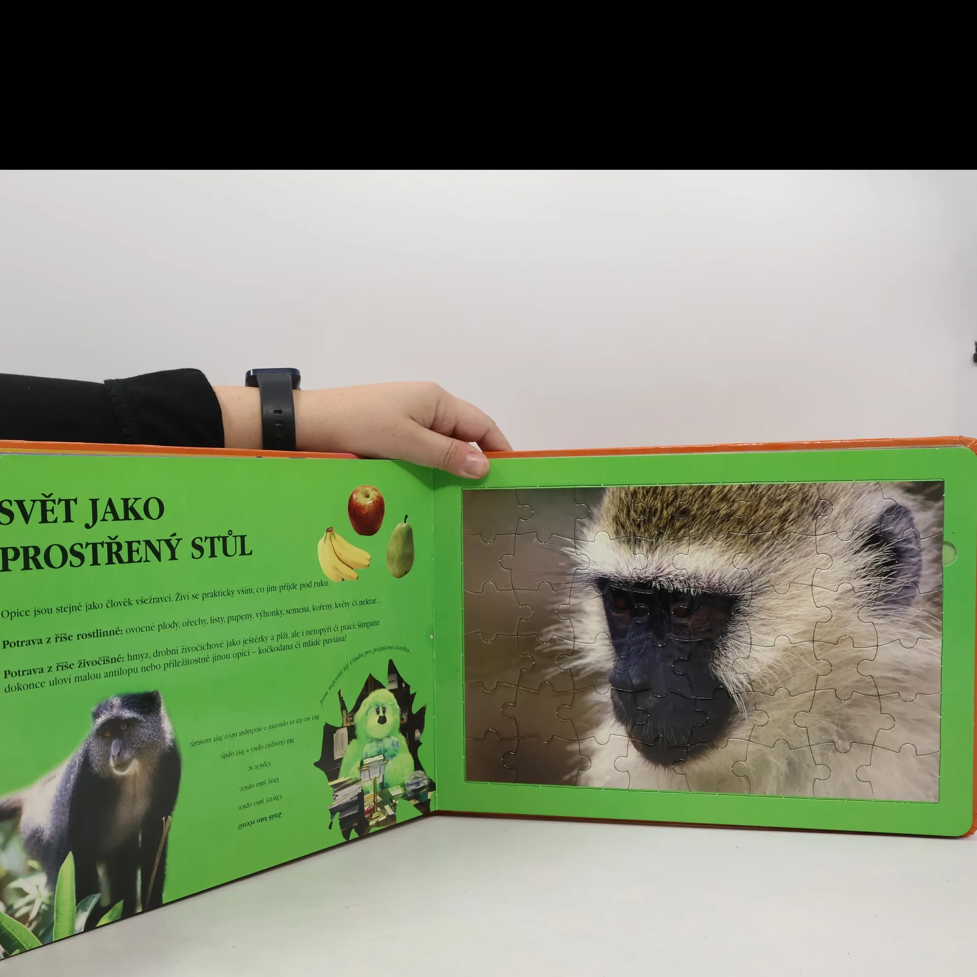 Knížka s pěti 48 dílnými puzzle nabízí krásné fotografie opic. Puzzle skládanky jsou doprovázeny množstvím zajímavých informací, kniha se stává zdrojem zábavy i poučení.