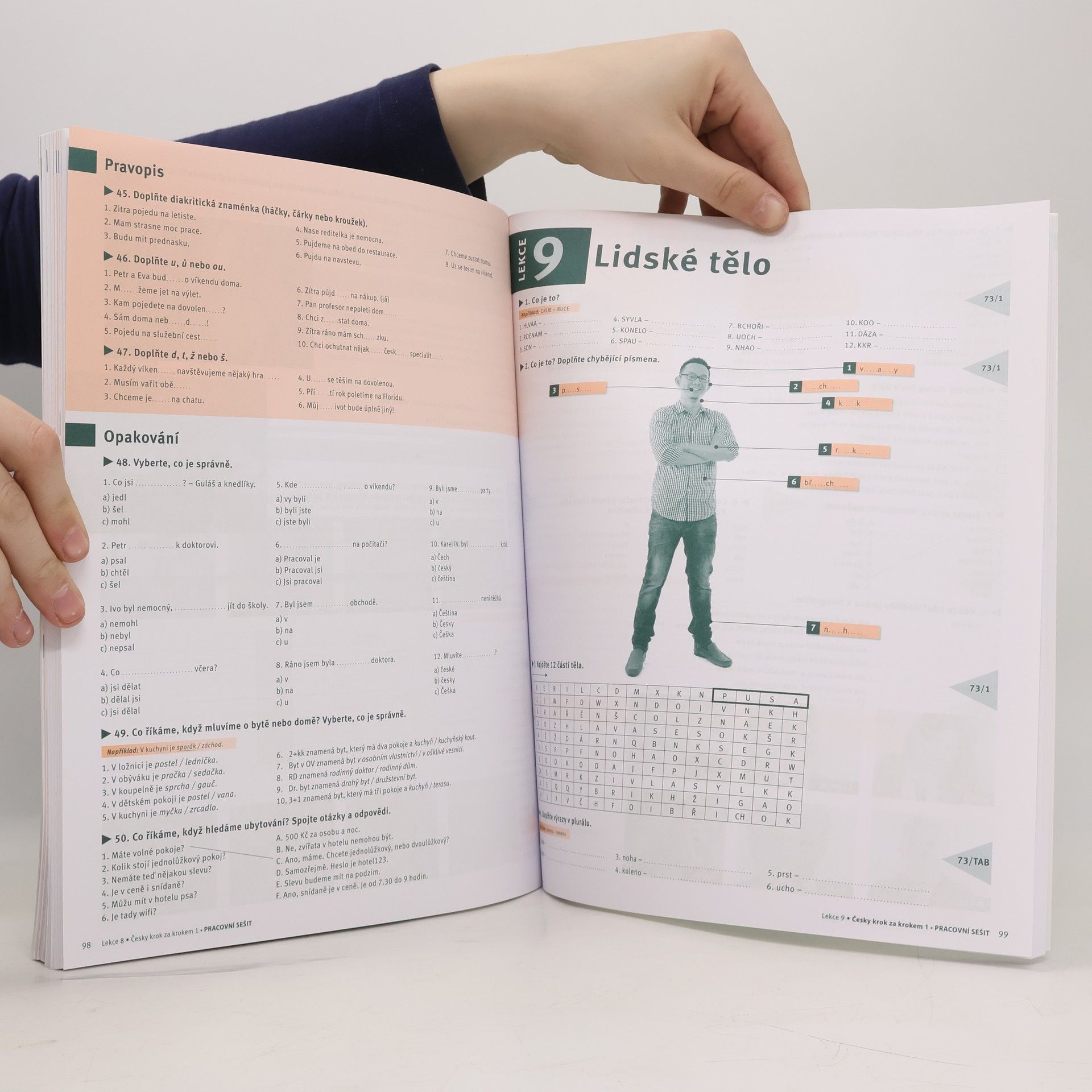 První díl pracovního sešitu doplňuje lekce 1–12 publikace Lídy Holé Česky krok za krokem 1. Přináší množství různých aktivit a úkolů sloužících k procvičení jazykových dovedností, slovní zásoby a gramatických jevů představených v učebnici. Vedle lexikálních a gramatických cvičení nabízí také další texty a komunikační aktivity. Pro snadnou orientaci je u každého cvičení uveden odkaz, které pasáže v učebnici se týká. Zařazena jsou také obtížnější cvičení vhodná pro rychlejší nebo náročnější studenty, jako jsou například studenti ze slovanských zemí, označená znaménkem plus. V závěru každé lekce se nacházejí cvičení na procvičení pravopisu, která vycházejí ze slovní zásoby v dané lekci. Důležitou součástí lekcí jsou také souhrnná opakovací cvičení, v nichž si studenti mohou zopakovat gramatiku a slovní zásobu předchozích lekcí. Všechny úkoly, komentáře i vysvětlení jsou pouze v češtině, pracovní sešit je tedy univerzální ke všem jazykovým verzím učebnice. Texty doprovázejí původní obrázky i dvoubarevné fotografie. Pracovní sešit lze používat nejen jako doplněk v hodinách češtiny, ale i pro samostatnou domácí přípravu či samostudium. Jeho nezbytnou součást proto tvoří klíč ke cvičením zařazený v závěru publikace.