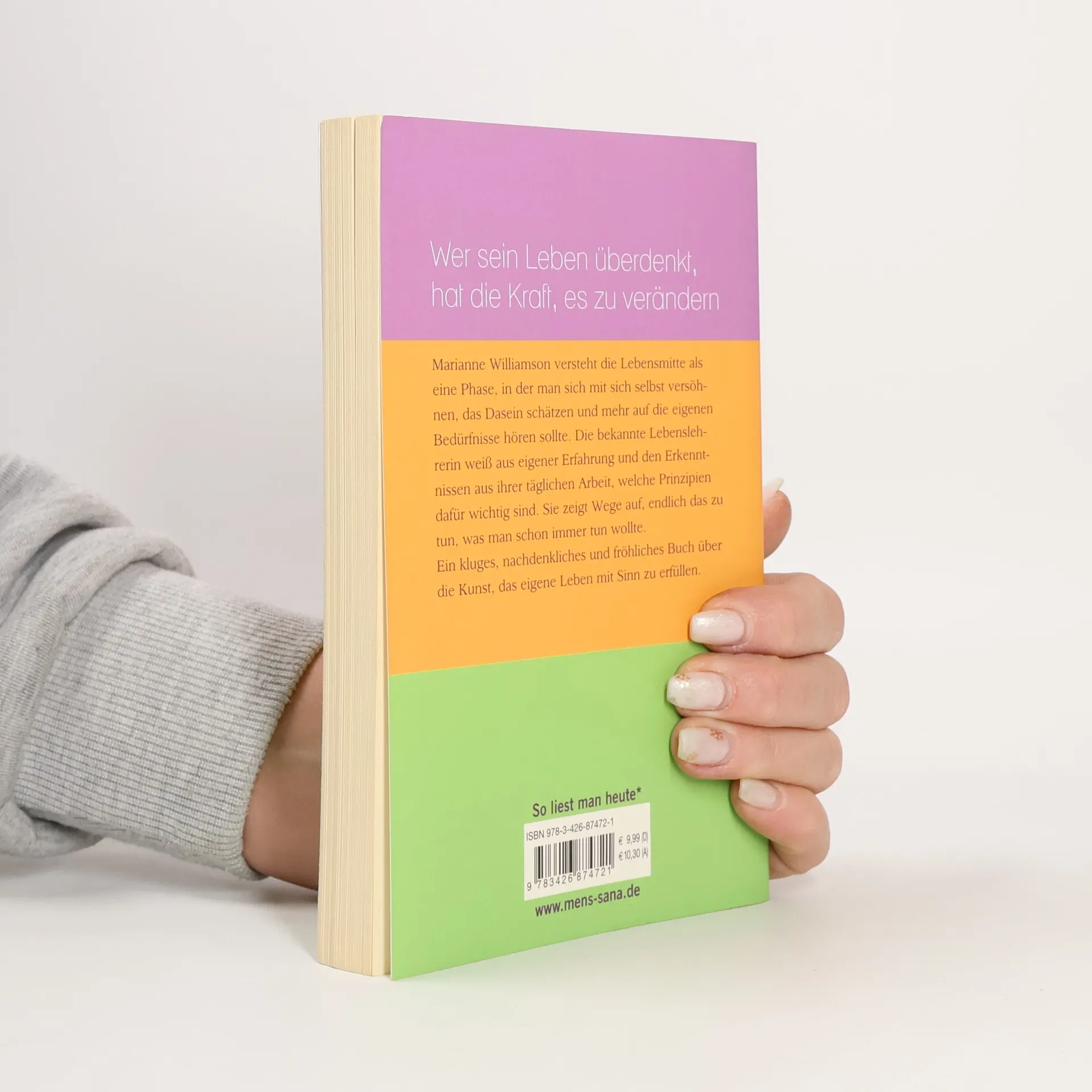 Marianne Williamson, die bekannte spirituelle Lehrerin, versteht die Lebensmitte als eine Phase, in der man sich selbst versöhnen, seinen Visionen folgen und mehr auf die eigenen Bedürfnisse hören sollte. Sie weiß aus eigener Erfahrung und Erlebnissen in ihrer täglichen Arbeit, welche Prinzipien dafür wichtig sind. Und sie zeigt Wege auf, endlich so zu leben, wie man es schon immer tun wollte.