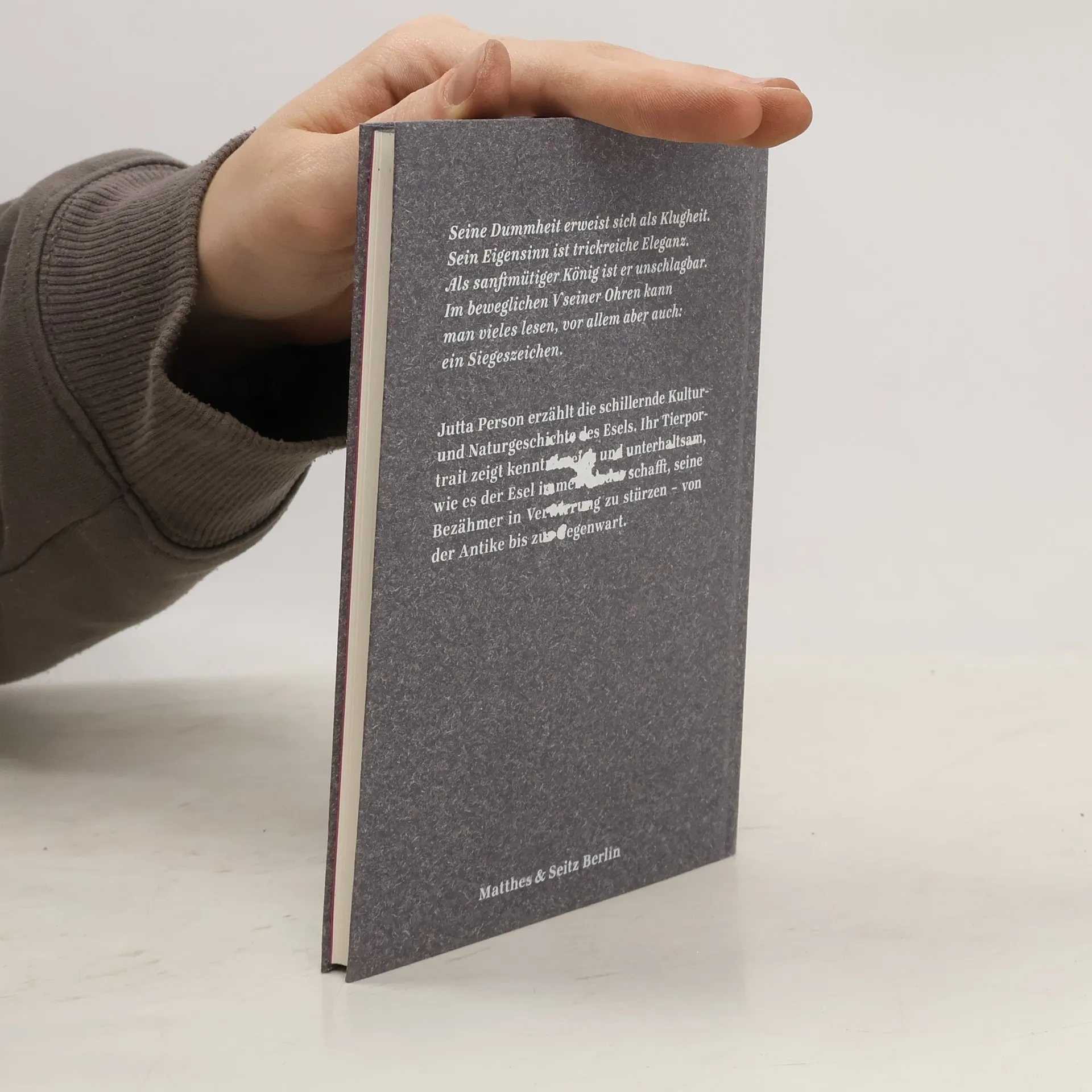 Störrisch, dumm und eigensinnig – die Eigenschaften, die dem Esel zugeschrieben werden, sind wenig schmeichelhaft. Und doch spielt kaum ein Tier in der Kulturgeschichte eine so bedeutende Rolle wie der Esel: Er steht für die geschundene Kreatur; auf ihm reitend zog Jesus in Jerusalem ein; Buridans Esel wurde zum philosophischen Paradigma, weil er vor zwei Heuhaufen verhungerte, zwischen denen er sich nicht entscheiden konnte. Jutta Person erzählt die erstaunlich reiche Geschichte dieses Lastentiers, betreibt eine Charakterologie des Esels, trifft seine Züchter und stellt domestizierte und wilde Eselarten sowie das Maultier vor. Nicht zuletzt zeigt sie, wie klug dieses vermeintlich dumme Tier mit den schönen Augen ist – und wie viel wir von ihm lernen können.