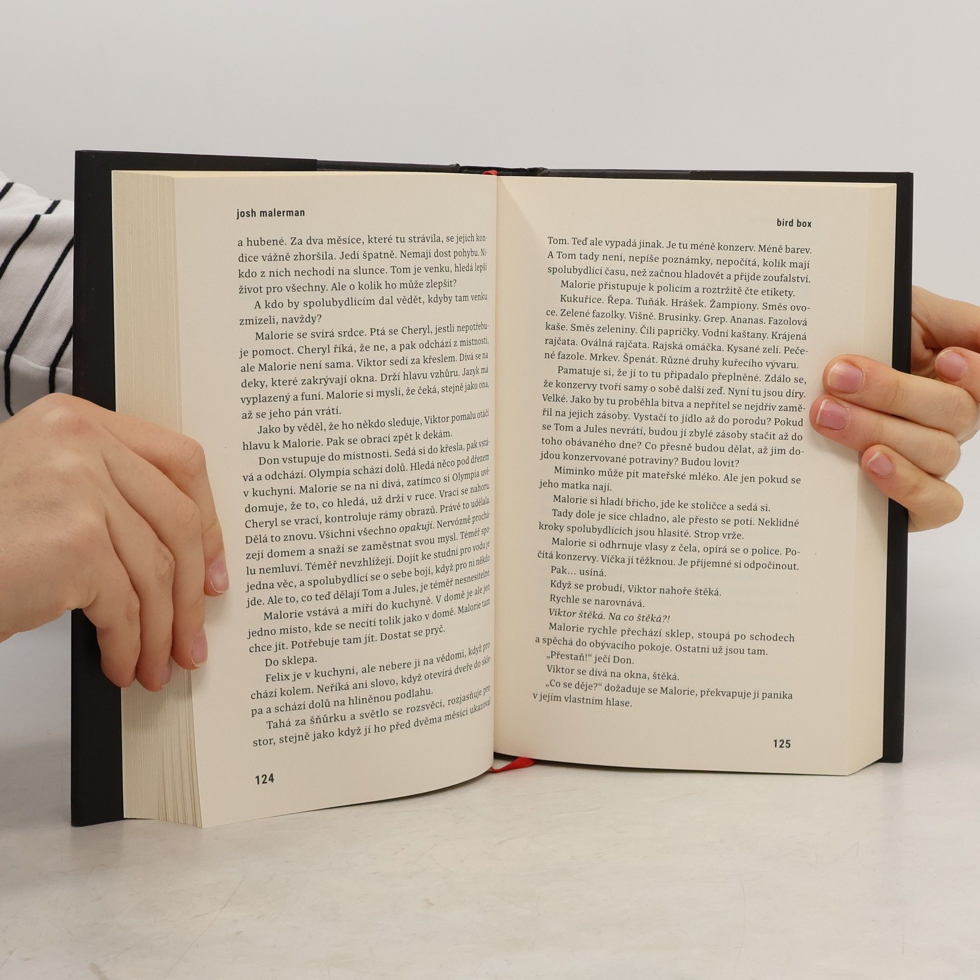 Malorie sleduje silnici před sebou. Snaží se dojet do bezpečí. Nesmí se rozhlédnout. Jediný pohled by ji mohl stát život. Tam venku totiž žijí prazvláštní tvorové. Kdokoli je zahlédne, zešílí. Ublíží svým blízkým. Ublíží sám sobě. Malorie vzhlíží od volantu, vidí domy s okny zakrytými dekami nebo dřevem. Ruku si klade na břicho, ve kterém roste nový život. Je sama. Její sestra je mrtvá. Její rodiče jsou mrtví. Nemá nikoho. Existuje vůbec to místo, to útočiště, které hledá? Napravo se něco pohne, a ona to zahlédne koutkem oka. Nedívá se na to. Zavírá pravé oko. Pták přeletí příliš nízko, málem narazí do čelního skla. Malorie zakřičí, zavře obě oči a otevře je. Když to udělá, zahlédne ulici, kterou hledá. 273 Shillingham. Zavírá oči a dupe na brzdy. Vystupuje, opatrně jde tam, kde si myslí, že jsou vchodové dveře. Má pravdu. Pouští kufr na verandu, osahává cihly, nachází zvonek. Zvoní. Nejdřív žádná odpověď. Začíná si zoufat. Možná to je konec. Jela tak daleko - odvážila se do světa - pro nic? Znovu zvoní na zvonek. A pak znovu. Znovu. Žádná odpověď. Zoufale buší do dveří…