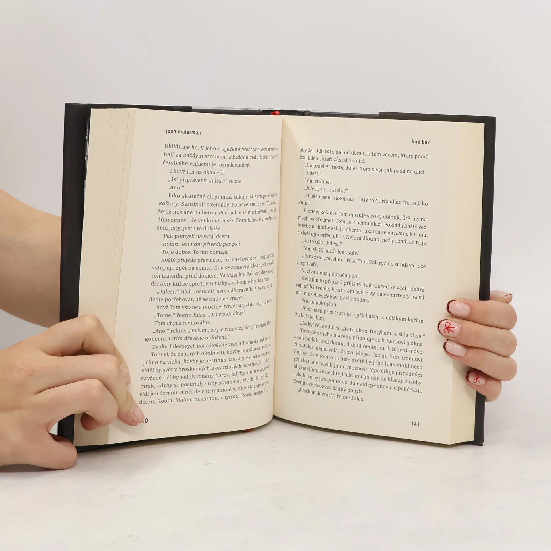 Malorie sleduje silnici před sebou. Snaží se dojet do bezpečí. Nesmí se rozhlédnout. Jediný pohled by ji mohl stát život. Tam venku totiž žijí prazvláštní tvorové. Kdokoli je zahlédne, zešílí. Ublíží svým blízkým. Ublíží sám sobě. Malorie vzhlíží od volantu, vidí domy s okny zakrytými dekami nebo dřevem. Ruku si klade na břicho, ve kterém roste nový život. Je sama. Její sestra je mrtvá. Její rodiče jsou mrtví. Nemá nikoho. Existuje vůbec to místo, to útočiště, které hledá? Napravo se něco pohne, a ona to zahlédne koutkem oka. Nedívá se na to. Zavírá pravé oko. Pták přeletí příliš nízko, málem narazí do čelního skla. Malorie zakřičí, zavře obě oči a otevře je. Když to udělá, zahlédne ulici, kterou hledá. 273 Shillingham. Zavírá oči a dupe na brzdy. Vystupuje, opatrně jde tam, kde si myslí, že jsou vchodové dveře. Má pravdu. Pouští kufr na verandu, osahává cihly, nachází zvonek. Zvoní. Nejdřív žádná odpověď. Začíná si zoufat. Možná to je konec. Jela tak daleko - odvážila se do světa - pro nic? Znovu zvoní na zvonek. A pak znovu. Znovu. Žádná odpověď. Zoufale buší do dveří…
