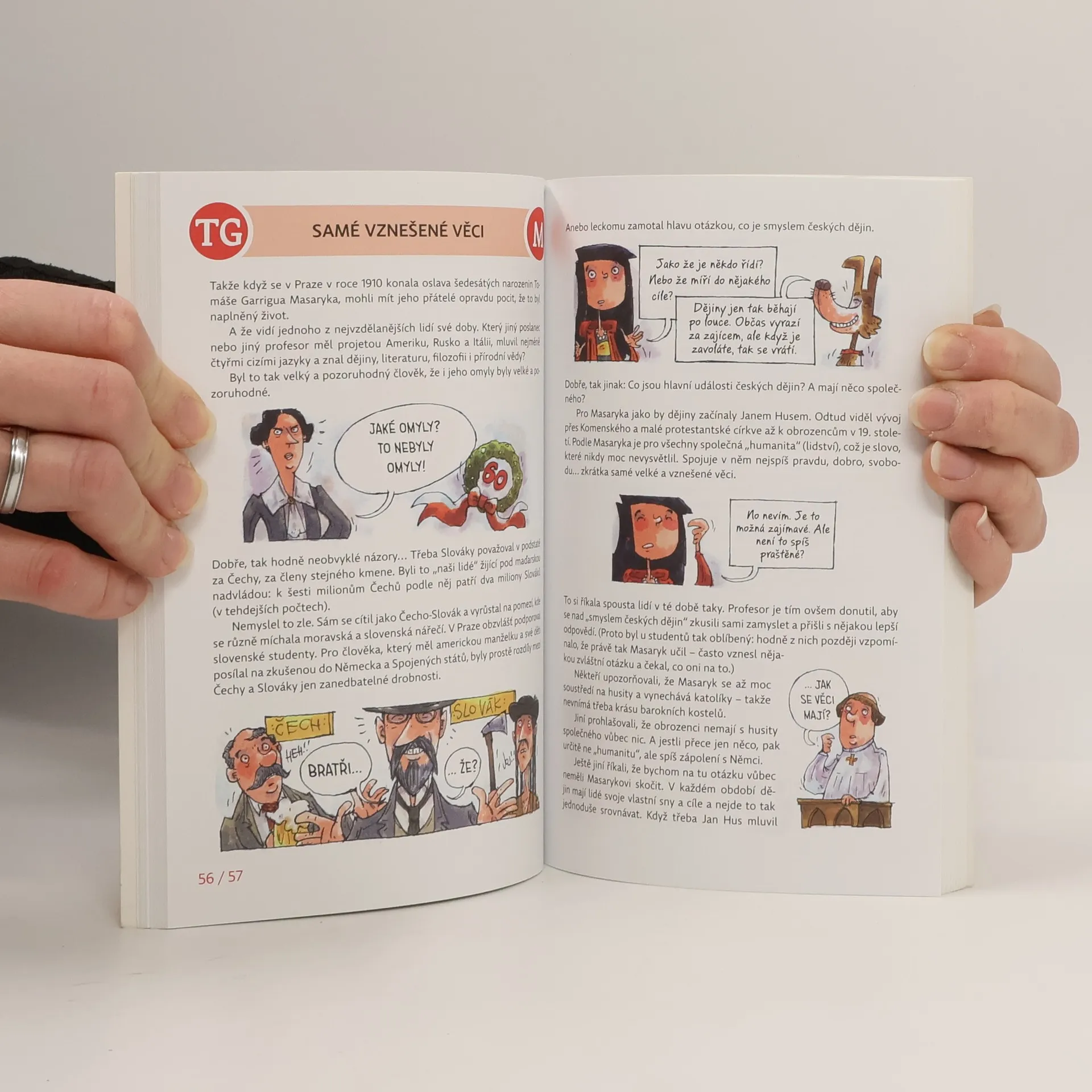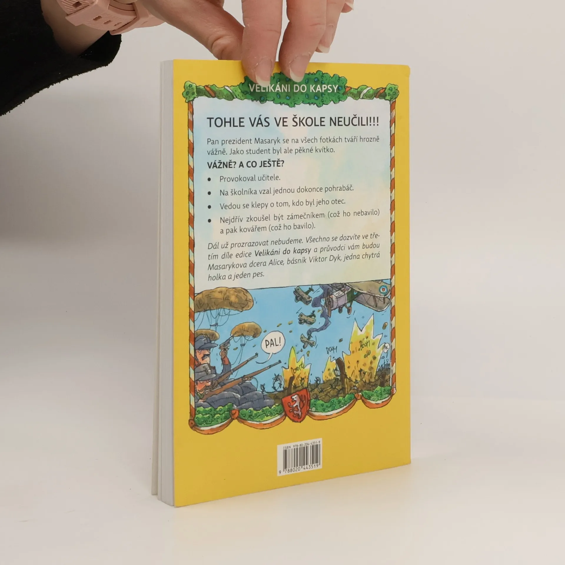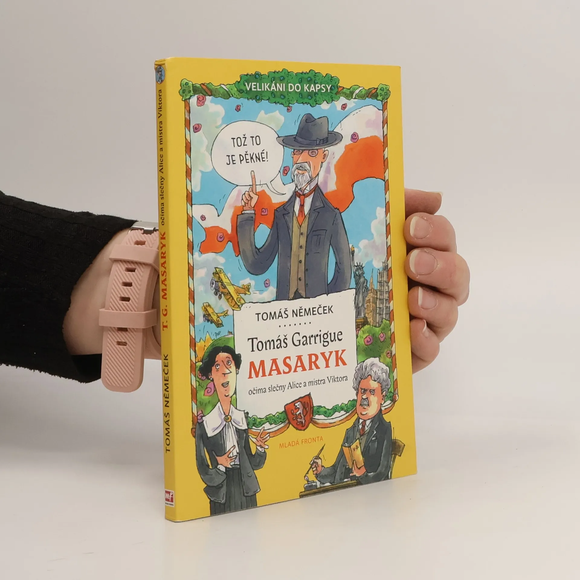 První prezident samostatného Československa působí na všech fotografiích velice vážně. Však také vykonal velice vážné a pro naši vlast velice zásadní věci. Leckdo ale možná neví, že jako student byl pěkné kvítko – provokoval učitele a na školníka vzal jednou dokonce pohrabáč! A že se vedou klepy o tom, kdo byl jeho otec. A že nejdřív zkoušel být zámečníkem (což ho nebavilo) a kovářem (což ho bavilo). Dál už prozrazovat nebudeme. Všechno se dozvíte ve třetím díle edice Velikáni do kapsy a průvodci vám budou Masarykova dcera Alice, básník Viktor Dyk, jedna chytrá holka a jeden pes.