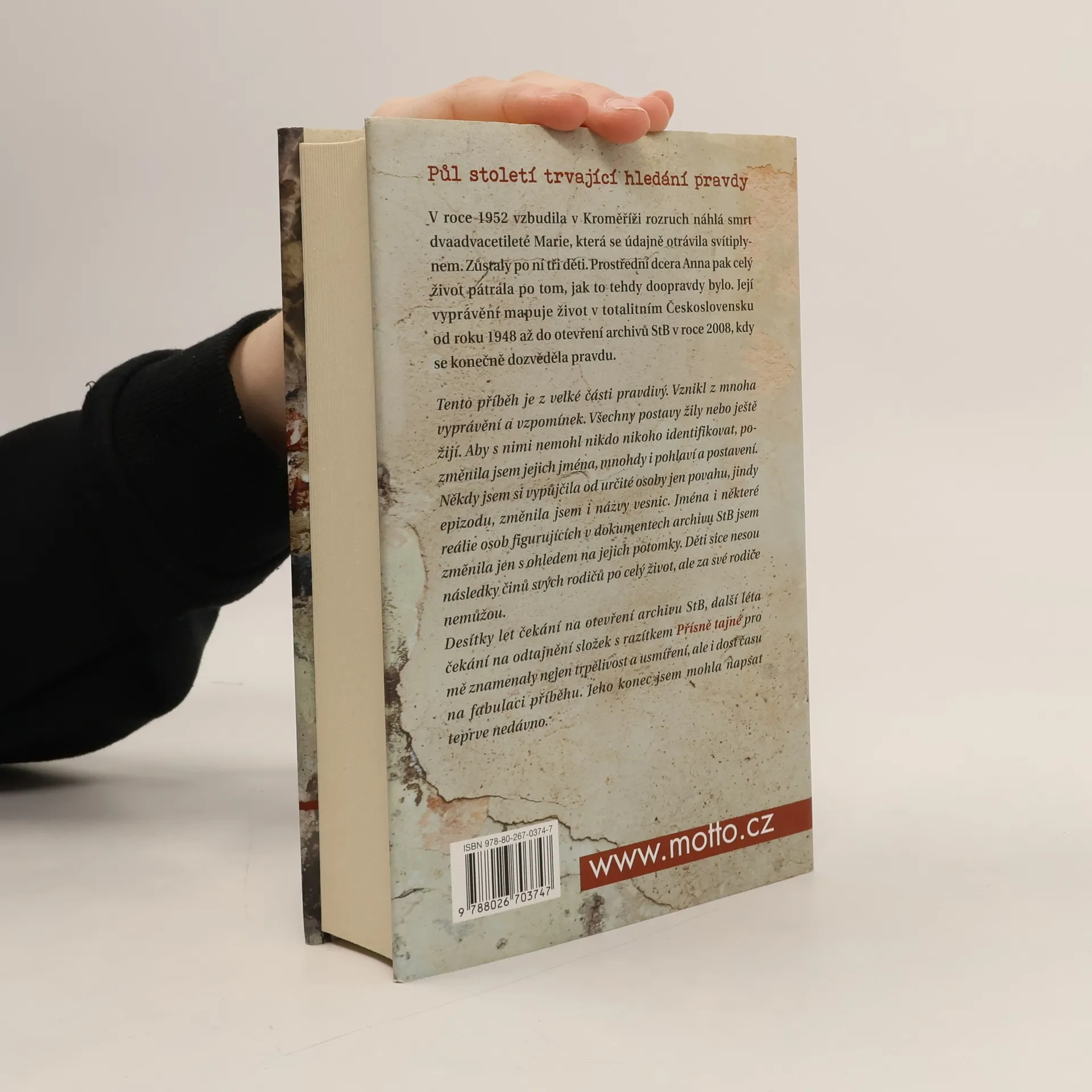 V roce 1952 vzbudila v Kroměříži rozruch náhlá smrt 22leté Marie, která se údajně otrávila svítiplynem. Zůstaly po ní tři děti. Prostřední dcera Anna však celý život nepřestala pátrat po tom, jak to tehdy doopravdy bylo. Složky z vyšetřování dostaly v roce 1956 razítko Přísně tajné a putovaly do sklepení archivu StB. Její vyprávění mapuje život v totalitním Československu od roku 1948 až do otevření archivů StB v roce 2008, kdy se konečně dozvěděla pravdu. V roce 2008 se otevřely archivy StB s nejutajovanějšími složkami. Zatímco složky jejího otce a jeho kamarádů byly zničeny, ta, kterou StB vedla na její matku Marii, v archivu zůstala. V roce 2010 si Anna přebrala v Ústavu pro výzkum totalitních režimů krabici s osmi sty dokumenty a názvem Marie H., podezření z vraždy. Dočetla se o nešťastném manželství rodičů a také o zločinech v padesátých letech, kdy se osoby ohrožující budování komunismu jednoduše odstranily vraždou.