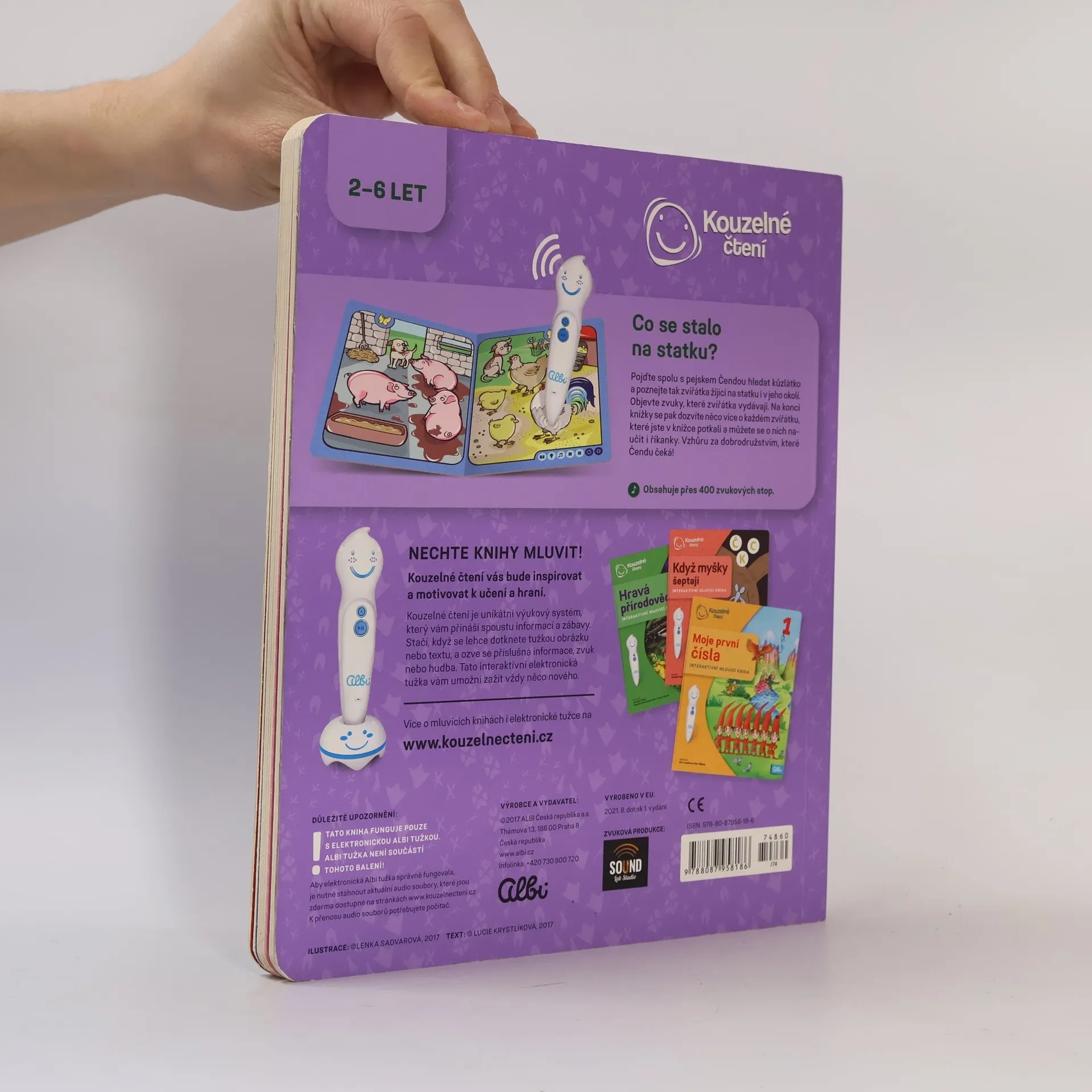 Interaktivní kniha Zvířátka na statku pozve nejmenší děti na dobrodružnou výpravu pejska Čendy za ztraceným kůzlátkem. Kniha z edice Kouzelné čtení je plná zábavných říkanek a informací o tom, co zažil malý pejsek na statku a kousek za ním. V naučné knize Zvířátka na statku objeví zvuky, které zvířátka vydávají. Na konci knížky se pak dozví více informací o každém zvířátku, které v knížce potkali a můžou se o nich naučit i říkanky. Vzhůru za dobrodružstvím, které Čendu čeká! Namluvil Jaroslav Plesl. Ilustrace Lenka Sadvarová. Text a říkanky Lucie Krystlíková. Kniha obsahuje přes 1000 zvuků a textů.