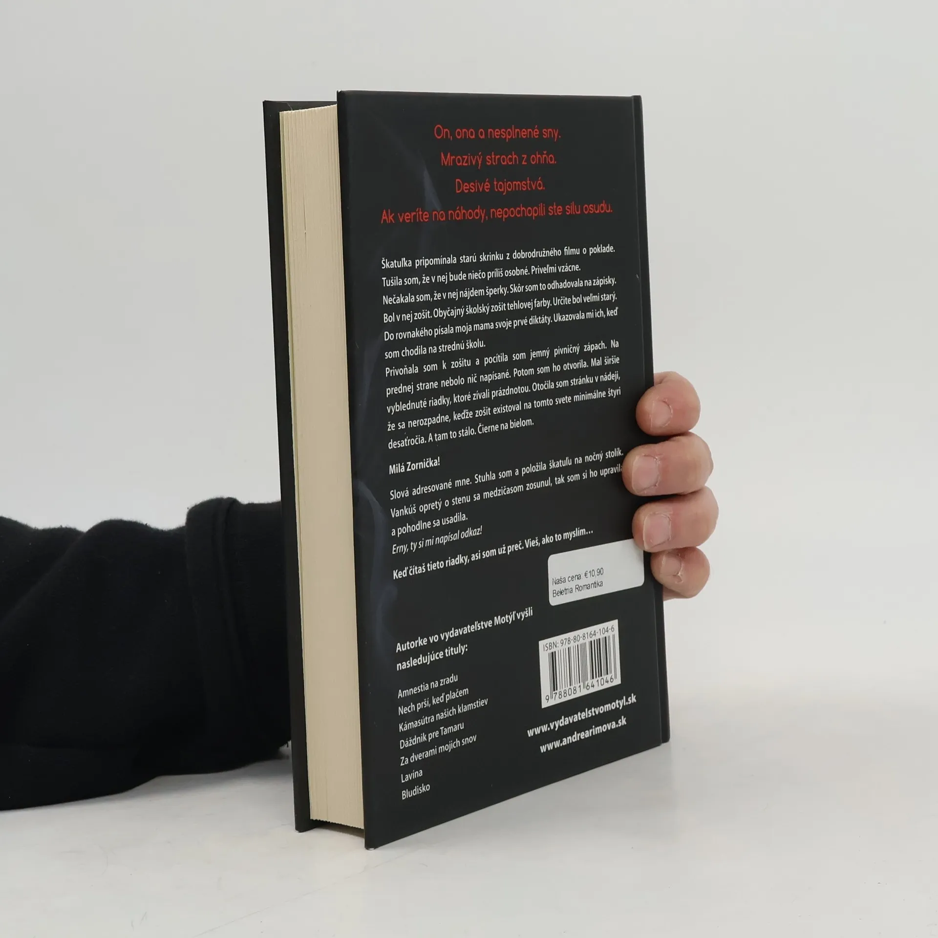On, ona a nesplnené sny. Mrazivý strach z ohňa. Desivé tajomstvá. Ak veríte na náhody, nepochopili ste silu osudu. Škatuľka pripomínala starú skrinku z dobrodružného filmu o poklade. Tušila som, že v nej bude niečo príliš osobné. Priveľmi vzácne. Nečakala som, že v nej nájdem šperky. Skôr som to odhadovala na zápisky. Bol v nej zošit. Obyčajný školský zošit tehlovej farby. Určite bol veľmi starý. Do rovnakého písala moja mama svoje prvé diktáty. Ukazovala mi ich, keď som chodila na strednú školu. Privoňala som k zošitu a pocítila som jemný pivničný zápach. Na prednej strane nebolo nič napísané. Potom som ho otvorila. Mal širšie vyblednuté riadky, ktoré zívali prázdnotou. Otočila som stránku v nádeji, že sa nerozpadne, keďže zošit existoval na tomto svete minimálne štyri desaťročia. A tam to stálo. Čierne na bielom. Milá Zornička! Slová adresované mne. Stuhla som a položila škatuľu na nočný stolík. Vankúš opretý o stenu sa medzičasom zosunul, tak som si ho upravila a pohodlne sa usadila. Erny, ty si mi napísal odkaz! Keď čítaš tieto riadky, asi som už preč. Vieš, ako to myslím…