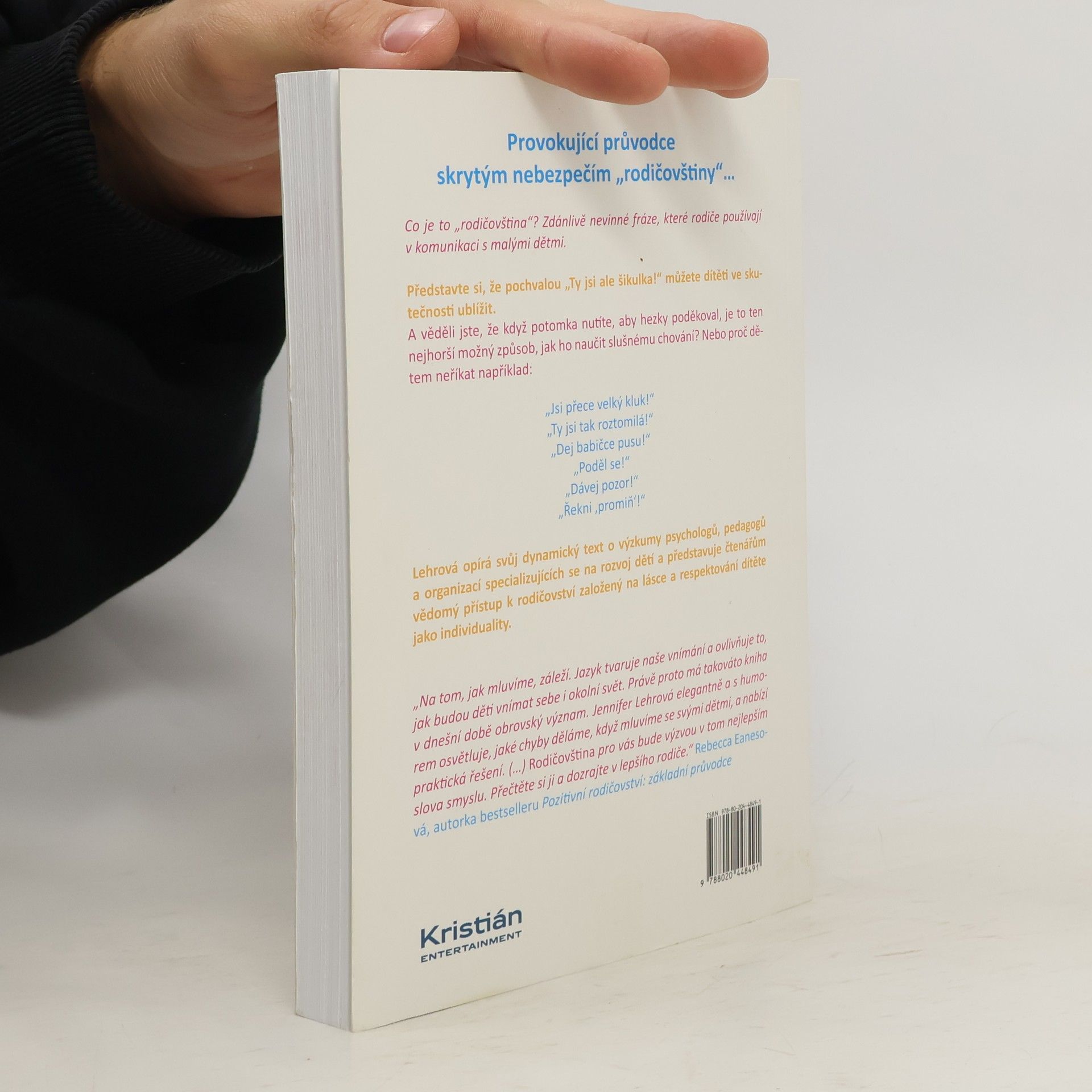 Co je to ,,rodičovština"? Zdánlivě nevinné fráze, které rodiče používají v komunikaci s malými dětmi. Představte si, že pochvalou ,,To se ti moc povedlo"! můžete dítěti ve skutečnosti ublížit. A věděli jste, že když potomka nutíte, aby hezky poděkoval, je to ten nejhorší možný způsob, jak ho naučit slušnému chování? Jennifer Lehrová je chytrá, vtipná a nebojácná autorka, která ,,převrátí vzhůru nohama všechny vaše zažité představy o rodičovství." ( Jennifer Jason Leighová). Lehrová opírá svůj dynamický text o výzkumy psychologů, pedagogů a organizací specializujících se na rozvoj dětí a představuje čtenářům vědomý přístup k rodičovství založený na lásce a respektování dítěte jako individuality.