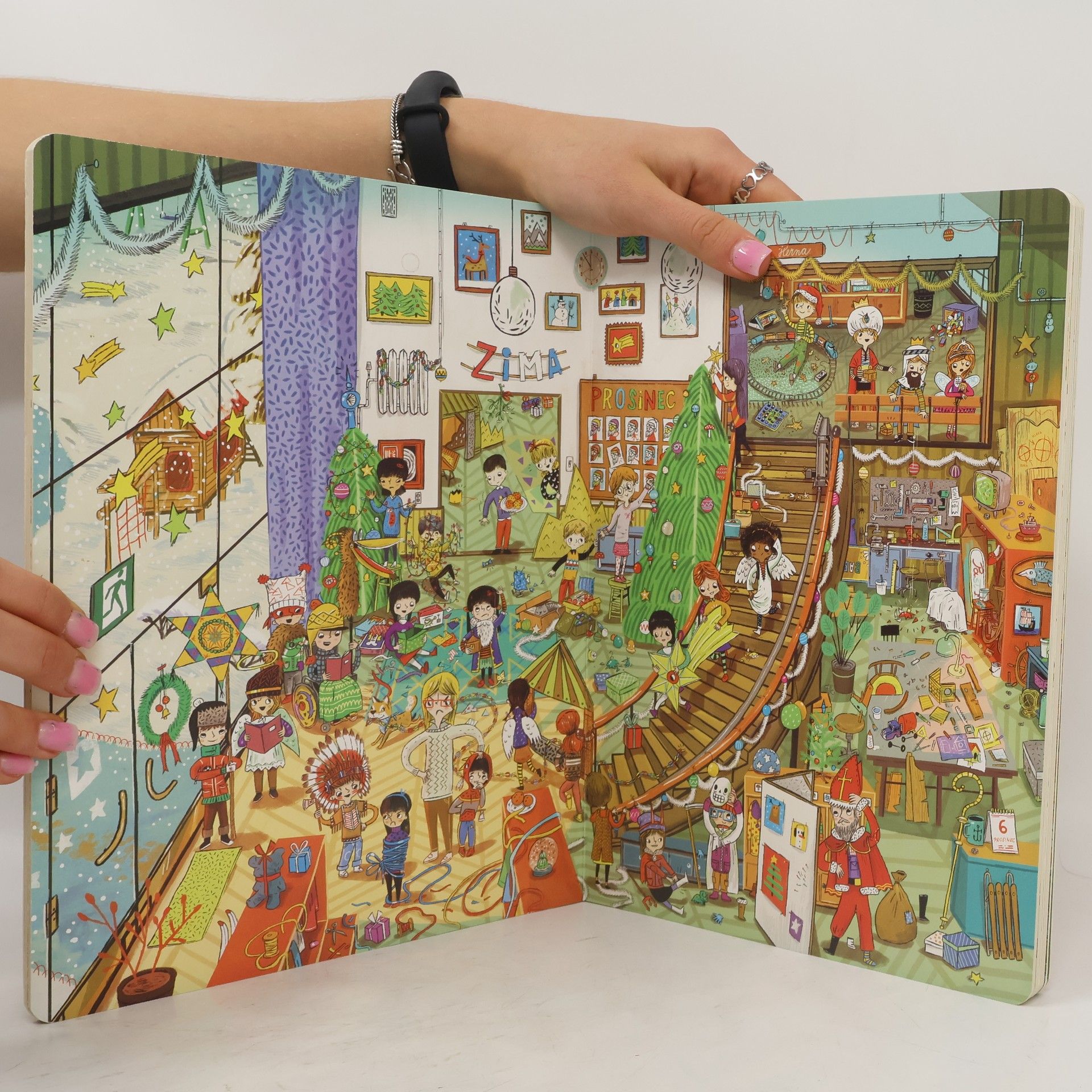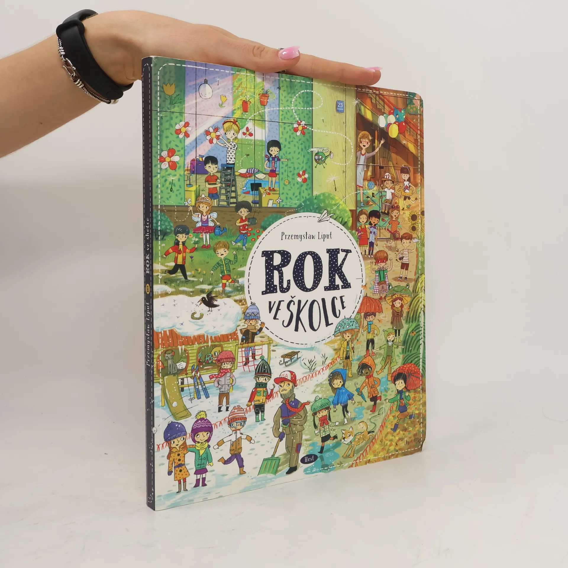 Vítej v naší školce! Tady se učíme, hrajeme si a občas vyvádíme skopičiny. Lukáš má rád fotbal, Tomáš je zase odborník na dinosaury. Evička pořád něco ztrácí a Ivanka ráda pořádá čajové dýchánky pro panenky. Jirku zajímá vesmír a vesmírné lodě a jednou z něj bude kosmonaut. Naše paní učitelka se jmenuje Květa. Pak je tu s námi ještě pan Janda, který umí všechno opravit, a jeho pes Alík. Staráme se taky o kočičku Micku – ta darebačka se pořád někde schovává a my ji hledáme. Pojď se s námi skamarádit! Chodit do školky je zábava. Rok ve školce obsahuje dvanáct bohatě ilustrovaných dvoustran, které dětem ukazují, co všechno se dá v průběhu roku – od září do letních prázdnin – zažít ve školce. Děti si díky detailním obrázkům procvičují postřeh a schopnost vyprávět příběhy, ale především se budou při zkoumání ilustrací výborně bavit.