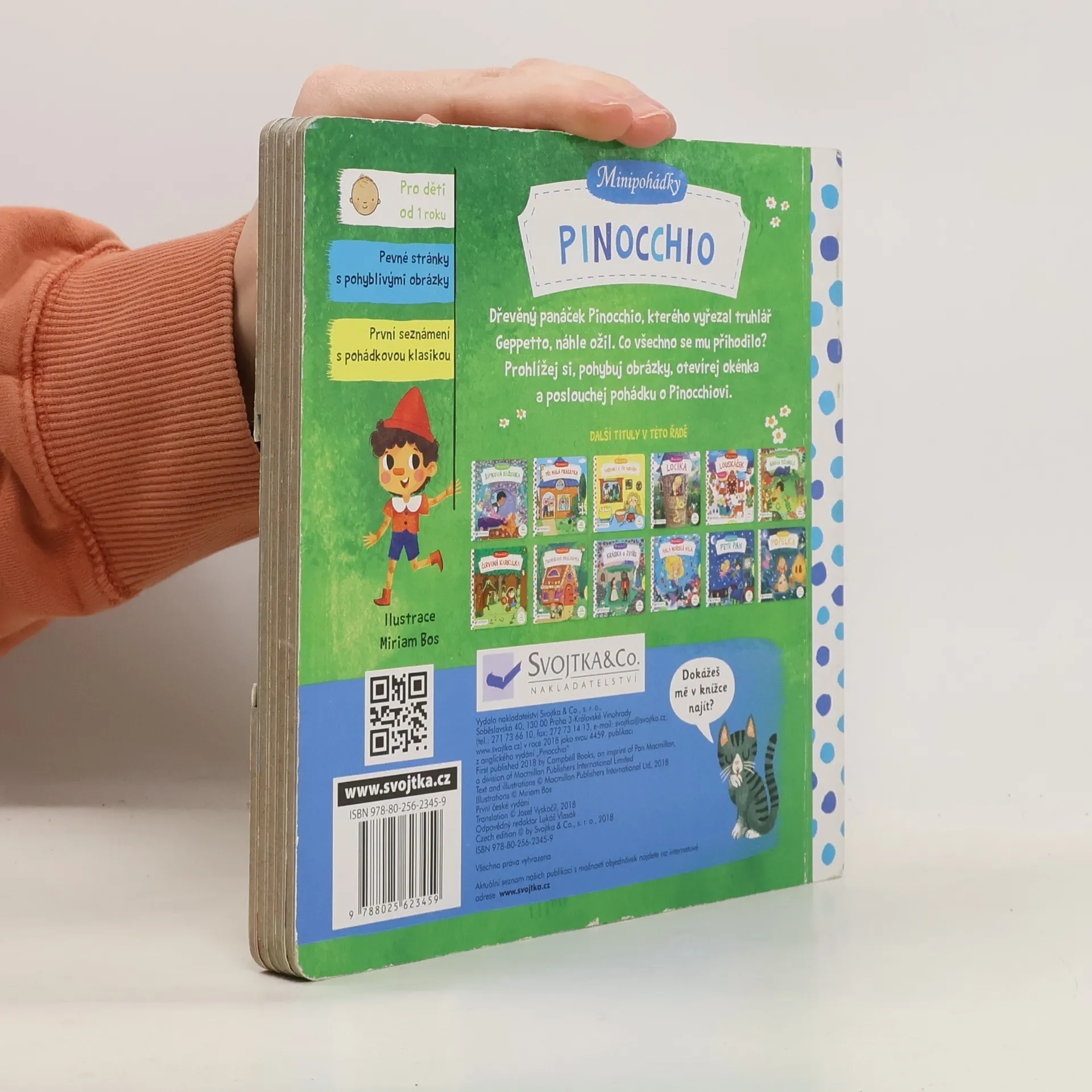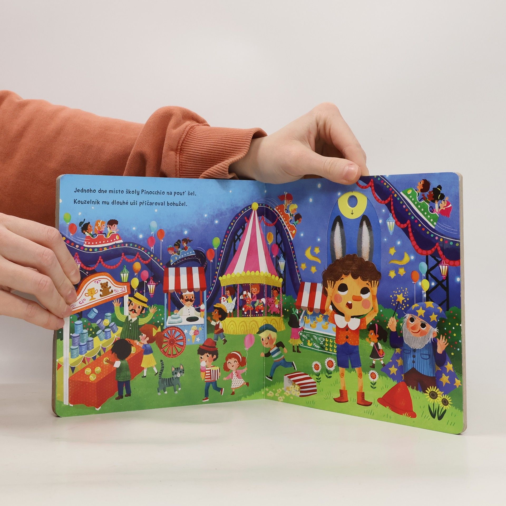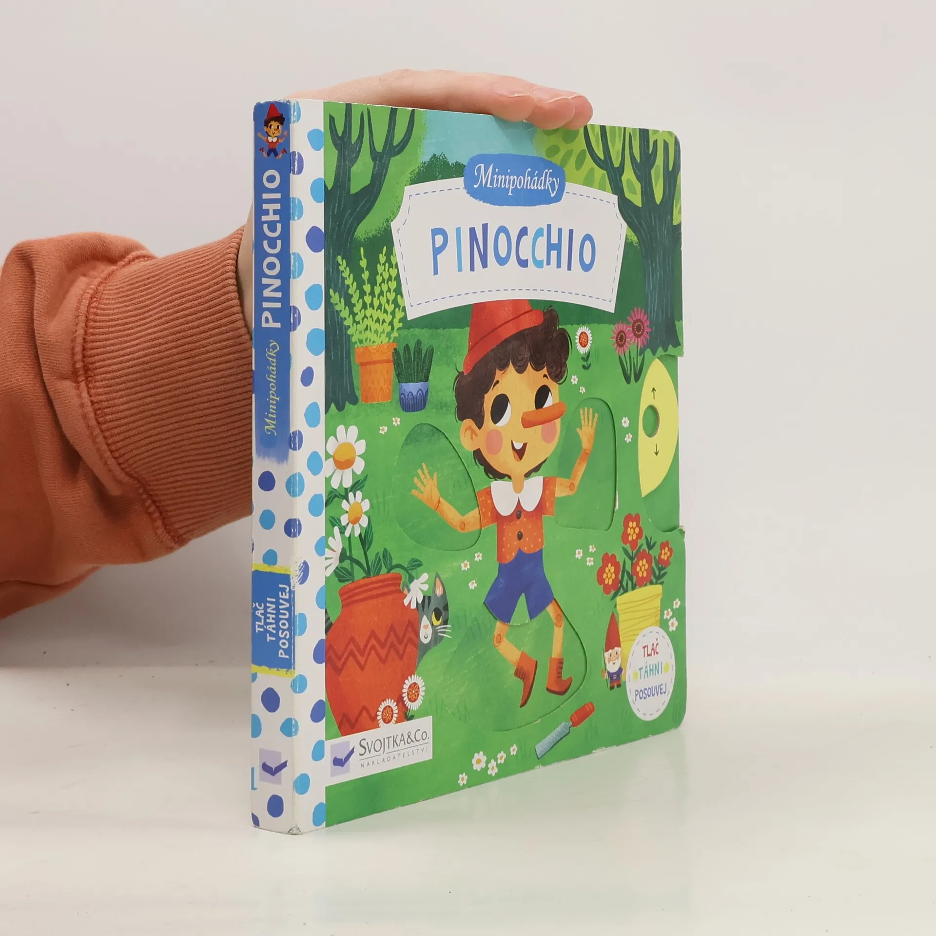 Jmenoval se Pinocchio, zlobivý byl taky dost. Pokaždé, když trochu zalhal, vyrostl mu o kus nos. Znáš ho? Dřevěný panáček Pinocchio, kterého vyřezal truhlář Geppetto, náhle ožil. Co všechno se mu přihodilo? Toto malé pohádkové leporelo s pevnými stránkami a pohyblivými obrázky je určeno dětem od jednoho roku a najdete v něm krátkou veršovanou pohádku o Pinocchiovi, jeho otci Geppettovi a dobrodružstvích, co zažili. Při jejím poslouchání si děti mohou procvičovat svou jemnou motoriku a zároveň si pohádkový příběh oživit – Pinocchio poprvé otevře oči, při lhaní mu vyroste nos, kouzelník mu přičaruje oslí uši a vyfoukne ho velryba!