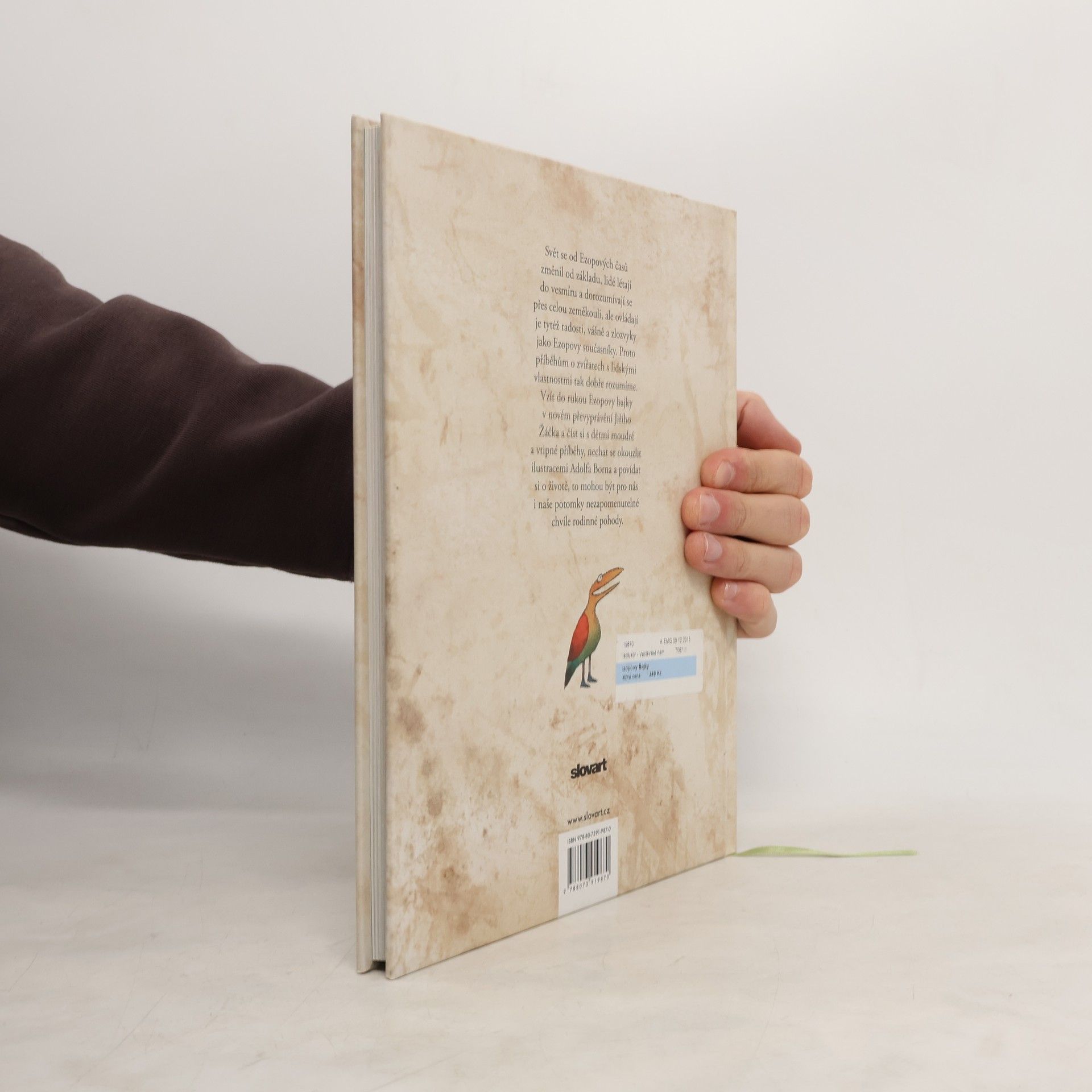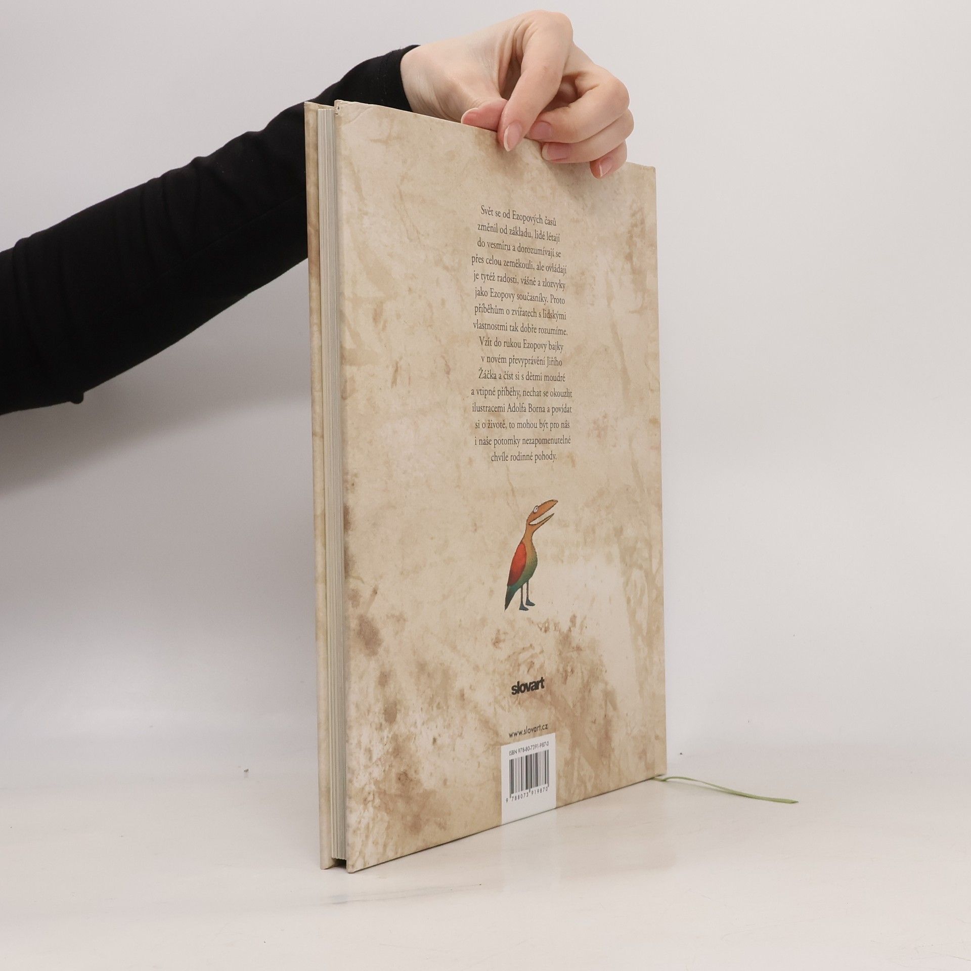 Podle dějepisce Herodota žil v Malé Asii v 6. století před Kristem otrok Aisopos čili Ezop. Byl prý hrbatý, znetvořený a koktavý, ale hlavu měl bystřejší a myšlení pronikavější než lidé urostlí a zdraví. Uměl pobavit posluchače zvířecími bajkami a vtipnými příběhy, ale zdaleka ne všichni jeho současníci byli jeho obdivovatelé. Traduje se, že byl v Delfách popraven za údajné rouhání bohům. Ezopovi byla připisována většina starověkých bajek, zapsány však byly až po třech stoletích od jeho smrti. Mnohokrát byly převyprávěny prózou i ve verších a najde se jen málo těch, co by nevěděli, kdo byl Ezop. Ale ať už se ten moudrý muž jmenoval Ezop, nebo jinak, ať už žil v 6. století před Kristem, anebo jindy, ať už byl thráckého původu, nebo jného, hlavní je, že jeho bajky dodnes nezestárly. Svět se za tu dobu změnil od základu, lidé létají do vesmíru a dorozumívají se přes celou zeměkouli, ale ovládají je tytéž radosti, vášně a zlozvyky jako Ezopovy současníky. Proto jim tak dobře rozumíme - dospělí i děti. Vzít do rukou převyprávění Ezopových bajek od Jiřího Žáčka a číst si s dětmi moudré a vtipné příběhy, prohlížet si ilustrace Adolfa Borna a povídat si o životě, to může být chvíle, která se nám zapíše do paměti.