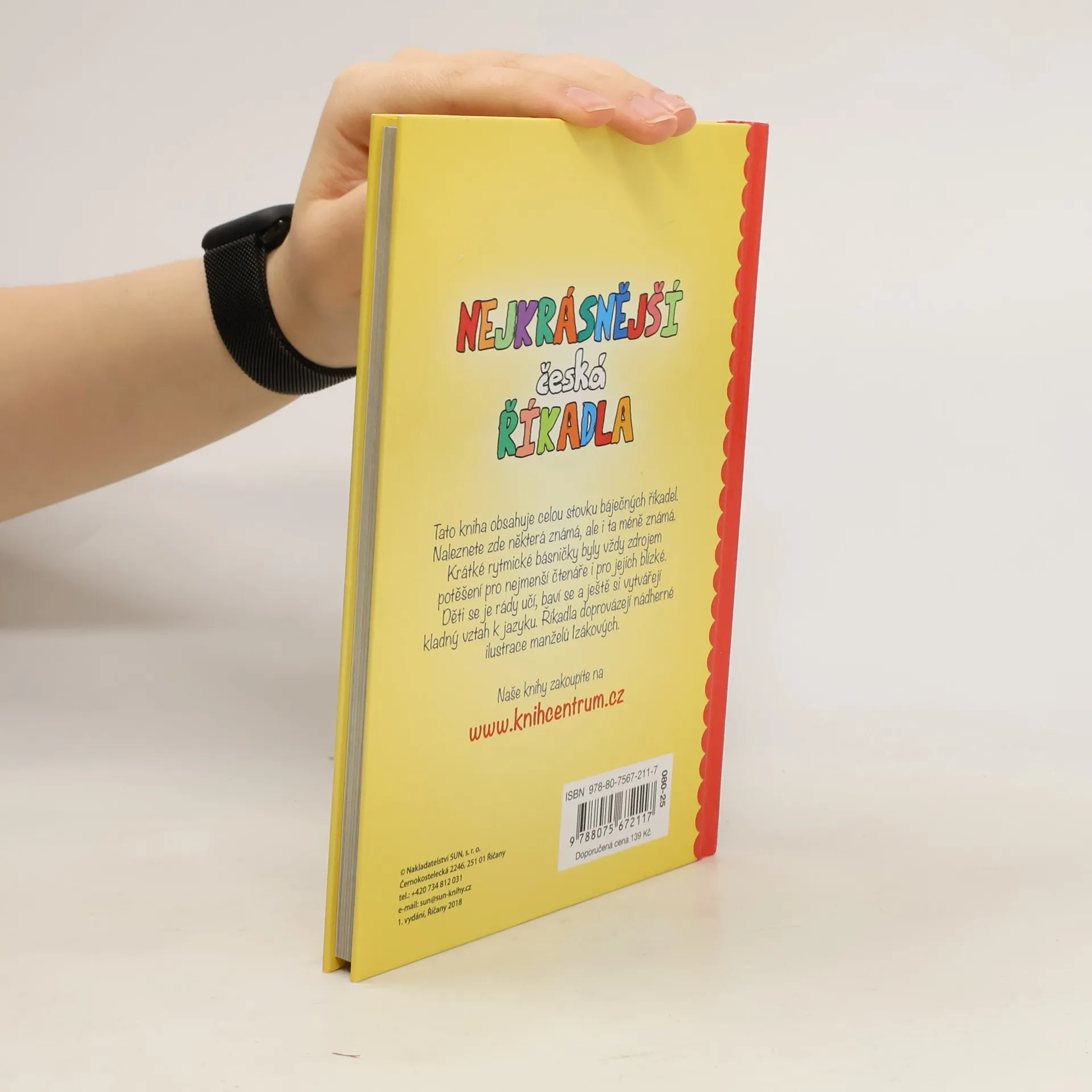 V této krásné sbírce naleznete přesně sto krásných českých říkadel, mezi nimi je například Zlatá brána otevřená, Šnečku, šnečku vystrč růžky, Běží liška k Táboru, Vařila myšička kašičku, Rak leze z díry, Žába skáče po blátě, Ententýky dva špalíky a mnohá další obecně známá. Krátké rytmické básničky byly vždy zdrojem potěšení pro nejmenší čtenáře i pro jejich blízké. Říkadla si můžete prohlížet se svými dětmi, učit se je a prohlížet si pestré obrázky od manželů Izákových.