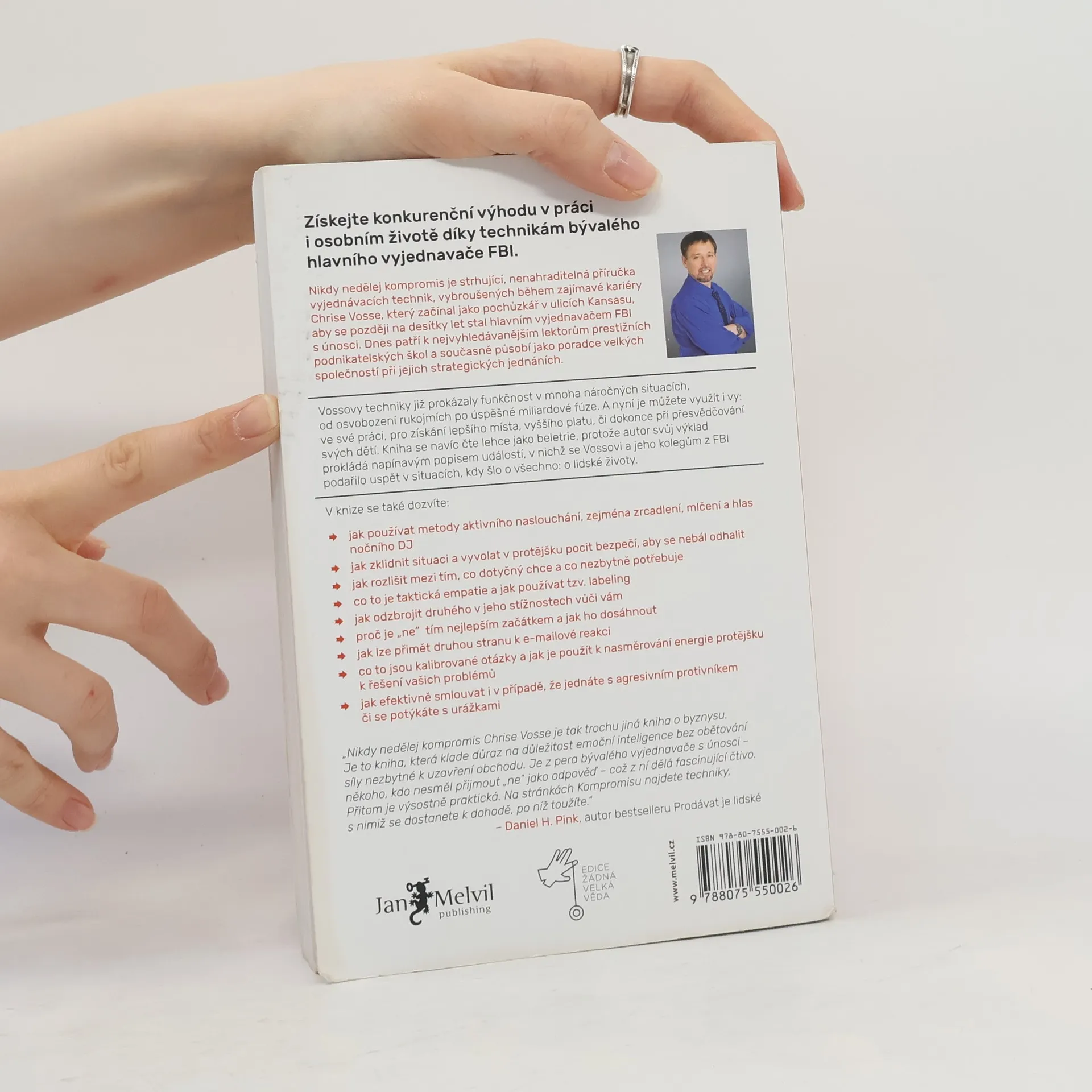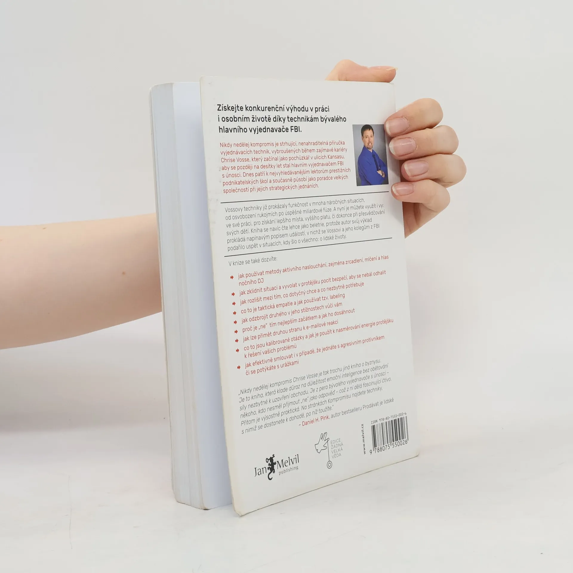 Život je plný vyjednávání, ať už se jedná o nákup auta, pořízení domu nebo sjednání podmínek s partnerem či dětmi. Klasické knihy jako Getting to Yes či Crucial Conversations obohatily arzenál vyjednavačů, avšak některé metody se ukázaly jako neefektivní a potřebují aktualizaci. Chris Voss, bývalý hlavní vyjednavač FBI, přináší nový, na neurovědě podložený přístup. Začínal jako běžný policista a postupně se vypracoval na specialistu na vyjednávání s nebezpečnými zločinci, kde šlo o lidské životy. V těchto situacích nelze dělat kompromisy. Vossův přístup, založený na dlouholeté praxi a výzkumech FBI, nenahrazuje předchozí metody, ale rozvíjí je a překonává. FBI jako první začala v jednáních pracovat s emocemi, zatímco dříve se vyučoval přístup založený na racionálním jednání obou stran. Po 25 letech ve FBI se Voss zaměřil na firemní vyjednávání a stal se vyhledávaným konzultantem, který asistuje u obchodních jednání Fortune 500 a přednáší na prestižních školách jako Harvard či MIT. Jeho kniha představuje významný a praktický příspěvek k tématu vyjednávání, které ovlivňuje naše osobní i pracovní životy.
