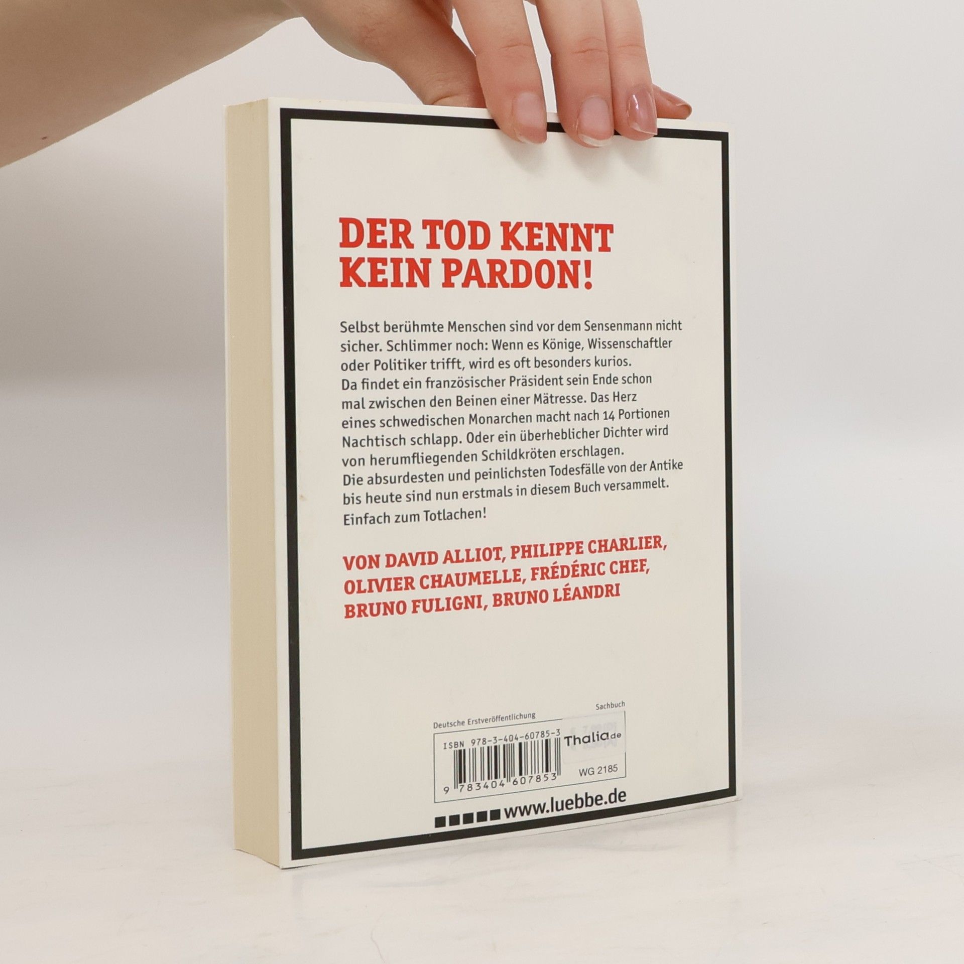 Auch berühmte Menschen sind vor dem Sensenmann nicht sicher. Schlimmer noch: Wenn es Könige, Wissenschaftler oder Politiker trifft, wird es besonders kurios. Da findet ein französischer Präsident sein Ende schon mal zwischen den Beinen einer Mätresse. Das Herz eines schwedischen Monarchen macht nach 14 Portionen Nachtisch schlapp. Oder ein überheblicher Dichter wird von herumfliegenden Schildkröten erschlagen. Dieses Buch versammelt hundert absurde Todesfälle von der Antike bis heute: böse, skurril - einfach zum Totlachen!