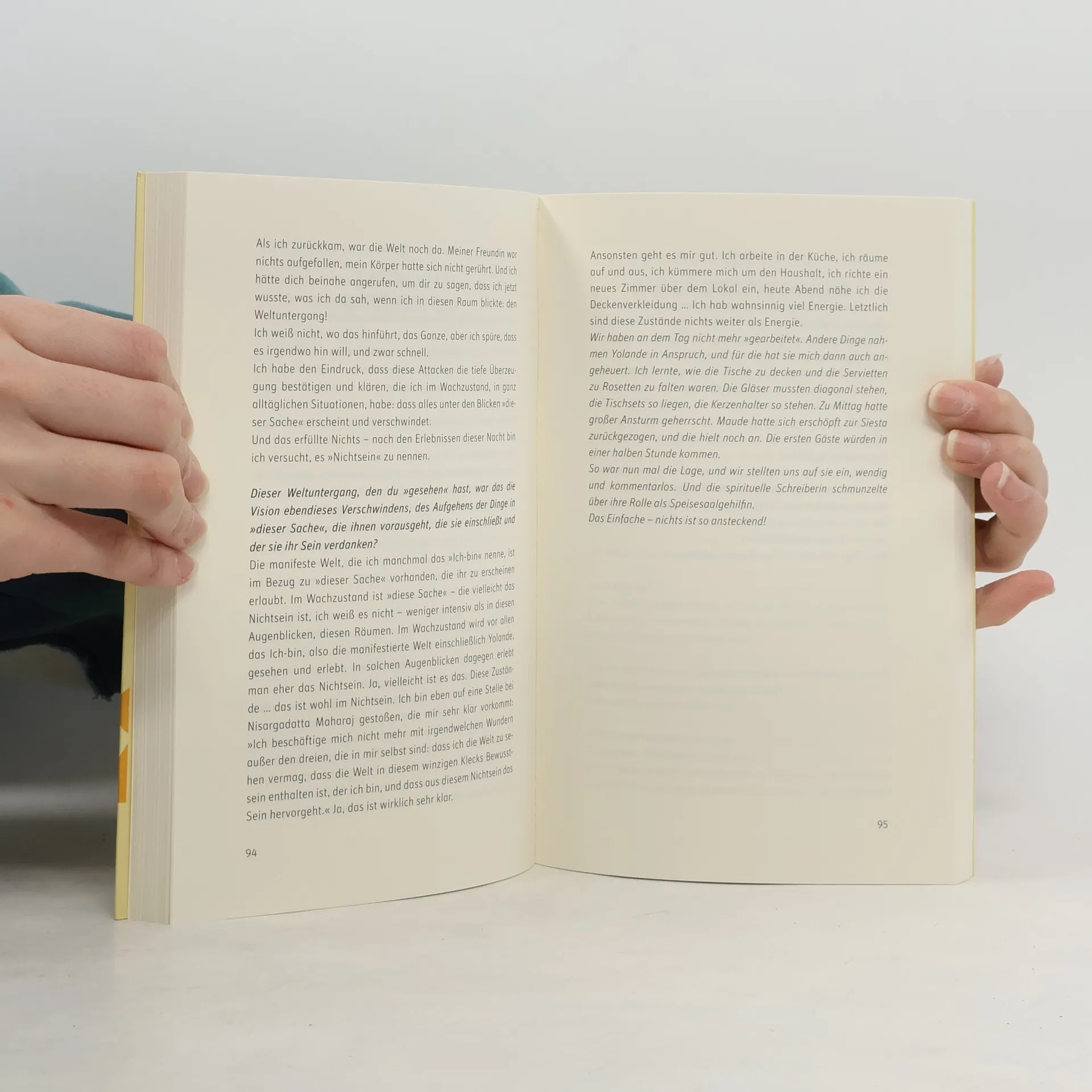 Im Grunde hat sich Yolande Duran-Serrano nicht für Spiritualität interessiert, geschweige denn meditiert. Ohne jede Vorbereitung trifft es sie an einem ganz normalen Tag mitten im Sommer. Der sehr tiefgreifende Prozess, der sich daraufhin bei ihr entfaltet, wird von ihr so ehrlich, so direkt geschildert, dass man an vielen Stellen schier Gänsehaut bekommt. Und gerade weil Yolande ohne alle Fachbegriffe spricht, spiegelt sie die Essenz sämtlicher spirituellen Traditionen in ihrer einfachen Sprache wider. Dieses einmalige Buch ist aus einem Gespräch von ungewöhnlicher Dichte und manchmal sogar Poesie entstanden. Es beschreibt die Schönheit und Freiheit der Erfahrung jenseits unseres normalen Alltagsbewusstseins. Es rührt auf manchmal verstörende Weise an, weil klar wird, dass die Persönlichkeit, die man zu sein glaubt, eine Illusion darstellt.