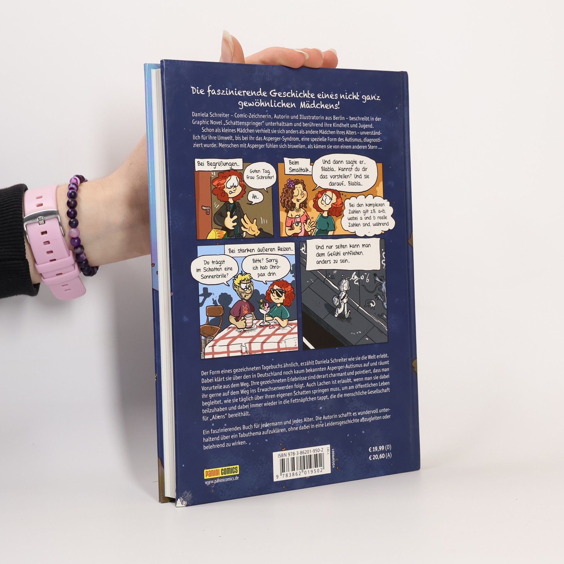 Die faszinierende Geschichte eines nicht ganz gewöhnlichen Mädchens! Daniela Schreiter – Comic-Zeichnerin, Autorin und Illustratorin aus Berlin – beschreibt in der Graphic Novel „Schattenspringer - Wie es ist, anders zu sein“ unterhaltsam und berührend ihre Kindheit und Jugend. Schon als kleines Mädchen verhielt sie sich anders als andere Mädchen ihres Alters – unverständlich für ihre Umwelt, bis bei ihr das Asperger-Syndrom, eine spezielle Form des Autismus, diagnostiziert wurde. Menschen mit Asperger fühlen sich bisweilen, als kämen sie von einem anderen Stern. Der Form eines gezeichneten Tagebuchs ähnlich, erzählt Daniela Schreiter wie sie die Welt erlebt. Dabei klärt sie über den in Deutschland noch kaum bekannten Asperger-Autismus auf und räumt Vorurteile aus dem Weg. Ihre gezeichneten Erlebnisse sind derart charmant und pointiert, dass man ihr gerne auf dem Weg ins Erwachsenwerden folgt. Auch Lachen ist erlaubt, wenn man sie dabei begleitet, wie sie täglich über ihren eigenen Schatten springen muss, um am öffentlichen Leben teilzuhaben und dabei immer wieder in die Fettnäpfchen tappt, die die menschliche Gesellschaft für „Aliens“ bereithält. Ein faszinierendes Buch für jedermann und jedes Alter. Die Autorin schafft es wundervoll unterhaltend über ein Tabuthema aufzuklären, ohne dabei in eine Leidensgeschichte abzugleiten oder belehrend zu wirken.