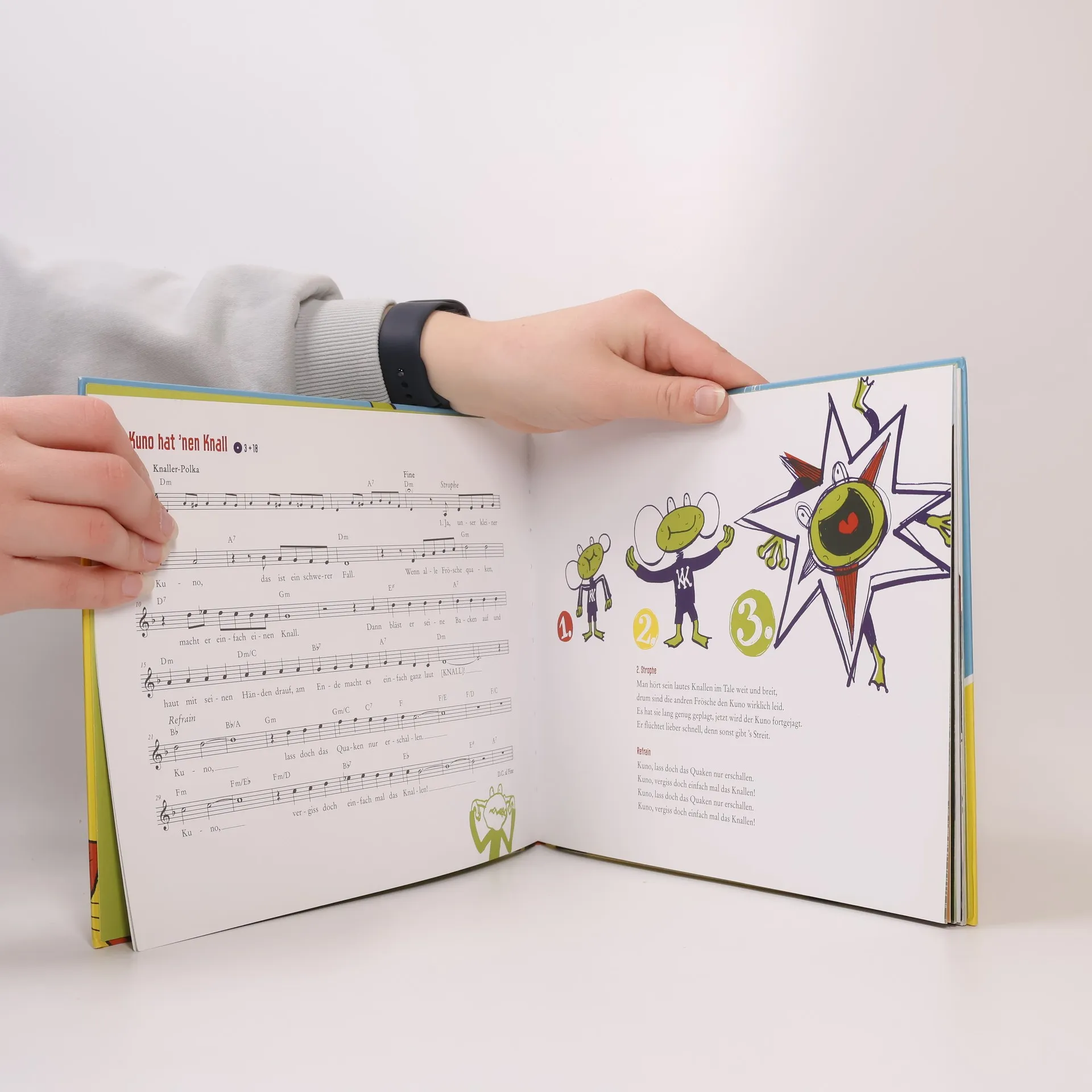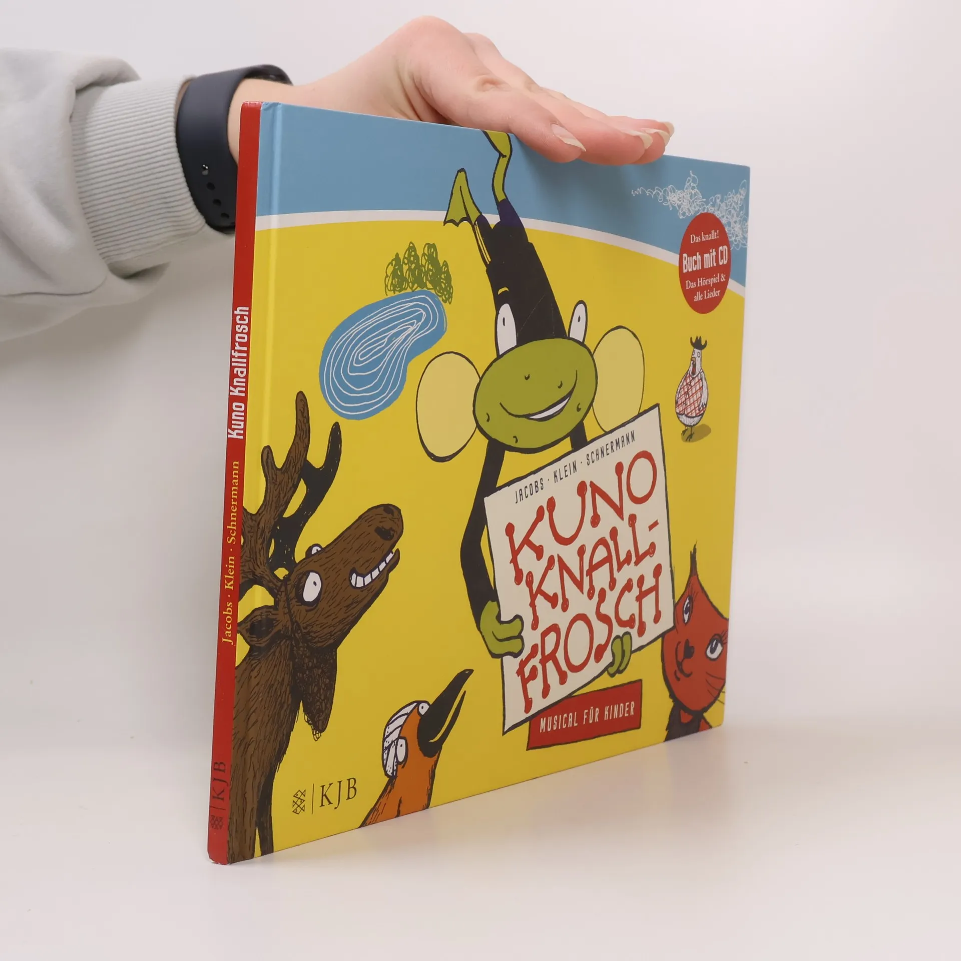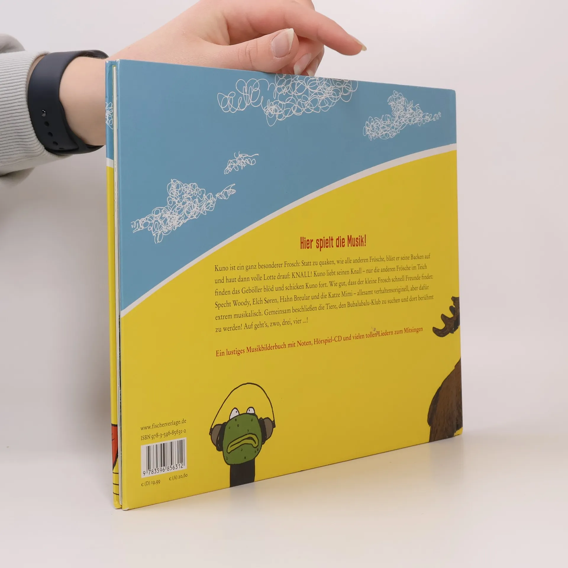 HIER SPIELT DIE MUSIK! Ein Bilderbuch mit Musikhörspiel-CD, Noten zum Nachspielen und vielen tollen Liedern zum Mitsingen! Kuno Knallfrosch ist ein ganz besonderer Frosch: Statt zu quaken, wie alle anderen Frösche, bläst er seine Backen auf und haut dann volle Lotte drauf: KNALL! Kuno liebt seinen Knall – nur die anderen Frösche im Teich finden das Geböller blöd und schicken Kuno fort. Wie gut, dass der kleine Frosch schnell Freunde findet: Specht Woody, Elch Søren, Hahn Breular und die Katze Mimi – allesamt verhaltensoriginell – aber dafür extrem musikalisch. Gemeinsam beschließen die Tiere, den Bubalubalu-Club zu suchen und dort berühmt zu werden! Auf geht’s, zwo, drei vier.! Mit einer Geschichte von Dietmar Jacobs, Bildern von Horst Klein und Musik von Andreas Schnermann