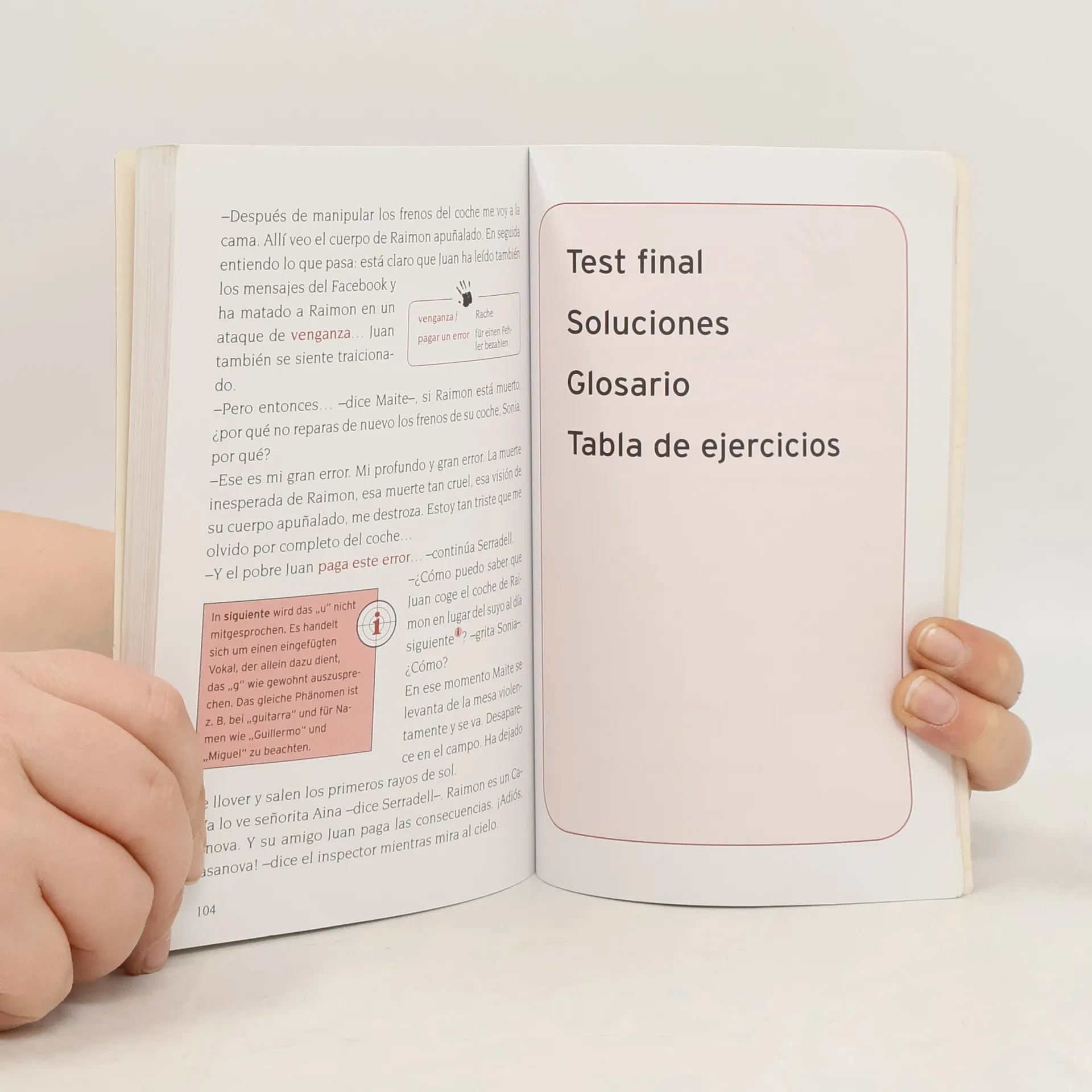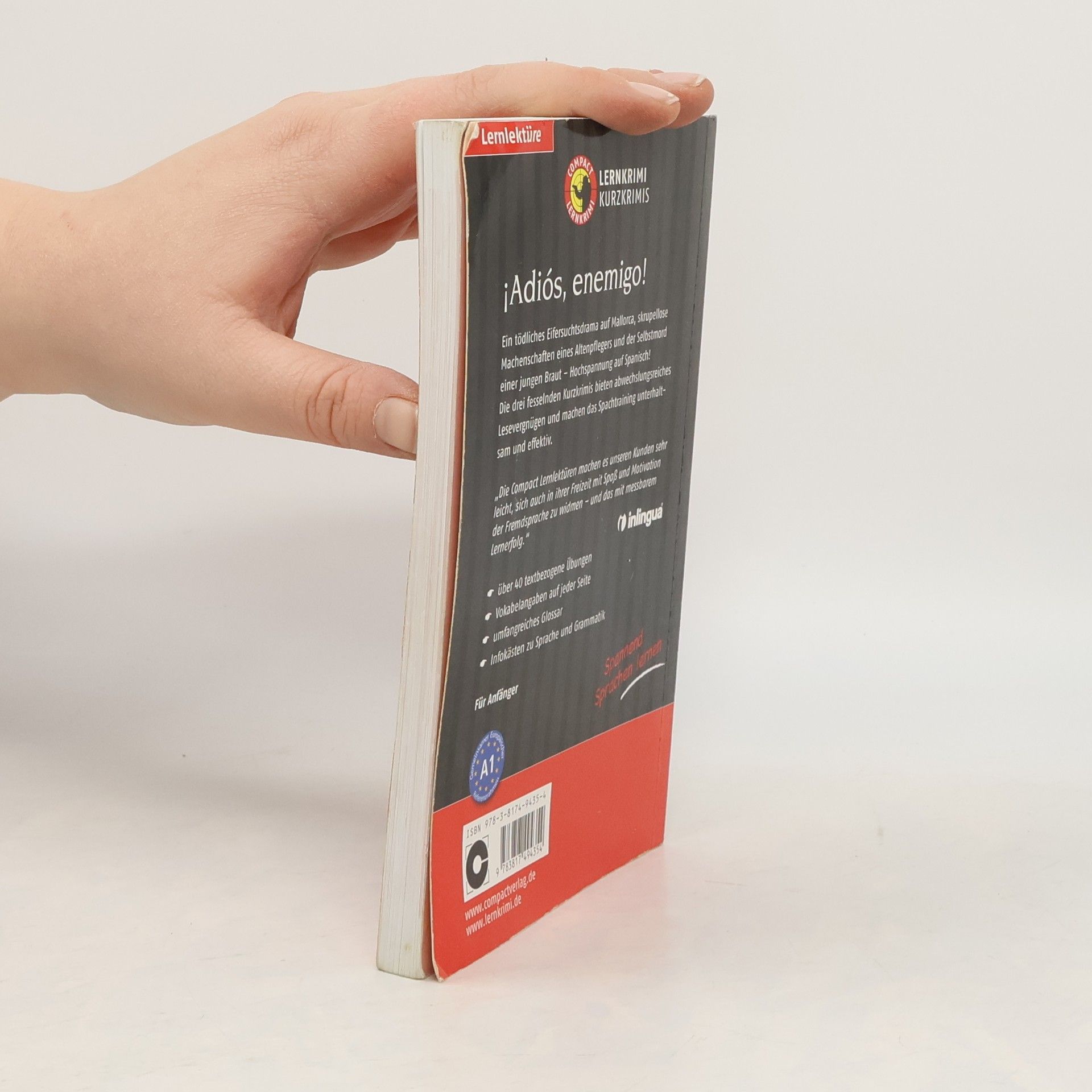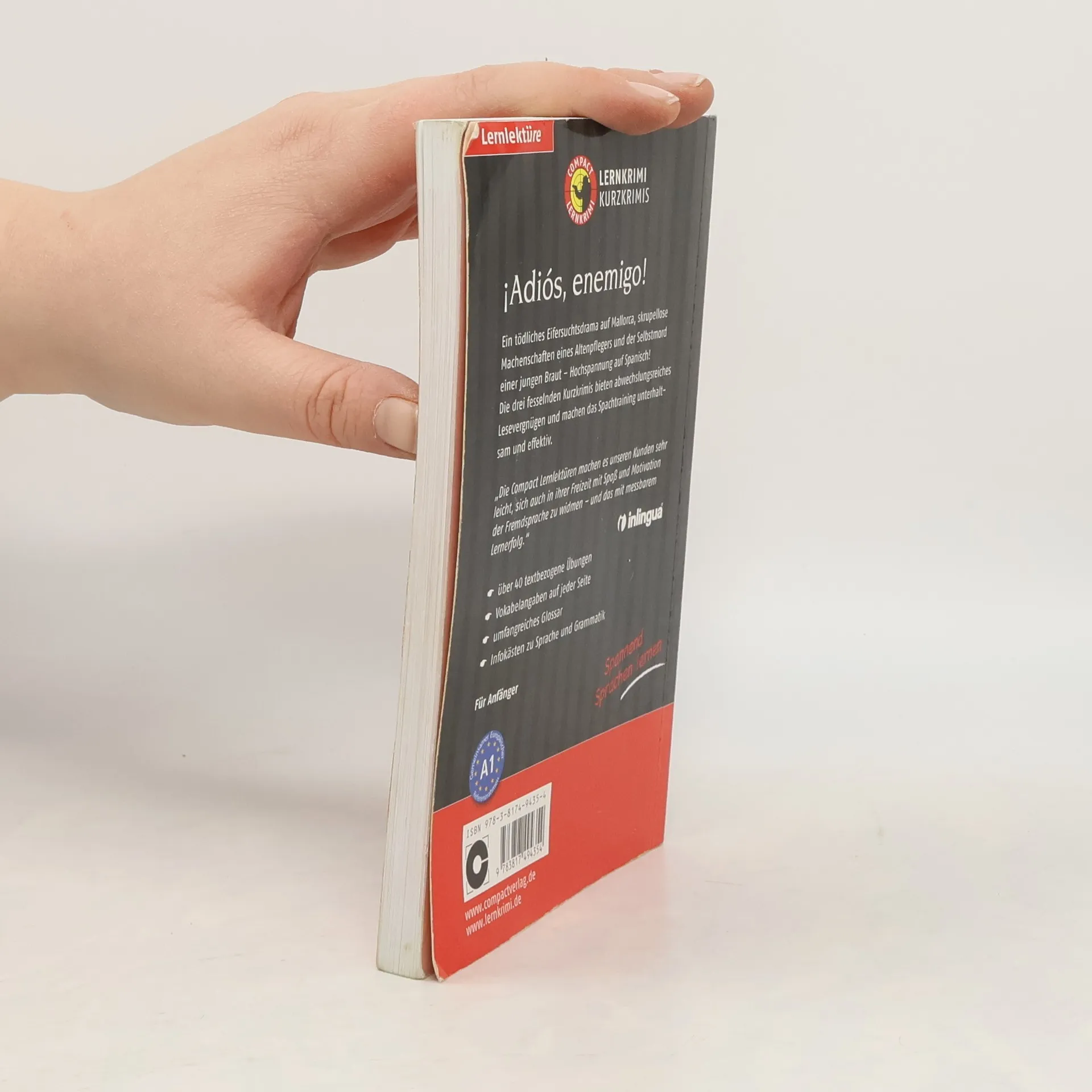 Ein tödliches Eifersuchtsdrama auf Mallorca, skrupellose Machenschaften eines Altenpflegers und der angebliche Selbstmord einer jungen Braut… Hochspannung auf Spanisch! Diese drei Kurzkrimis bieten spannendes Lesevergnügen und machen das Spanischtraining unterhaltsam und effektiv. Der Schwerpunkt liegt auf dem Grundwortschatz für Anfänger. Durch eingestreute Übungen wie Übersetzungsaufgaben, Multiple Choice, Lückentexte, etc. wird zudem das Textverständnis geschult. - drei spannende Kurzkrimis - gezieltes Training des spanischen Grundwortschatzes - textbezogene Übungen mit Lösungen - Vokabelangaben auf jeder Seite - Infokästen zu Sprache, Grammatik und Landeskunde - Europäischer Referenzrahmen: Für Anfänger - Niveau A1