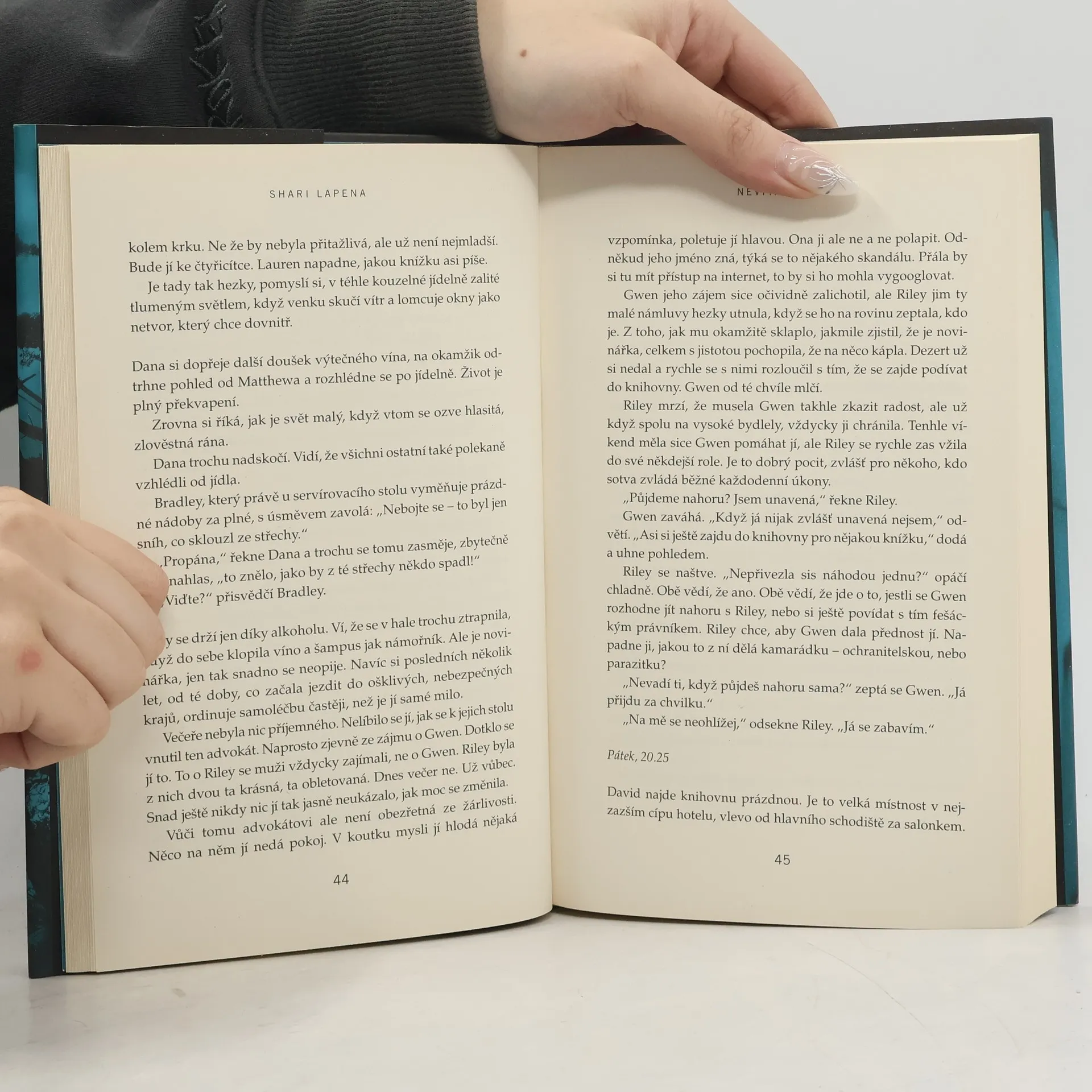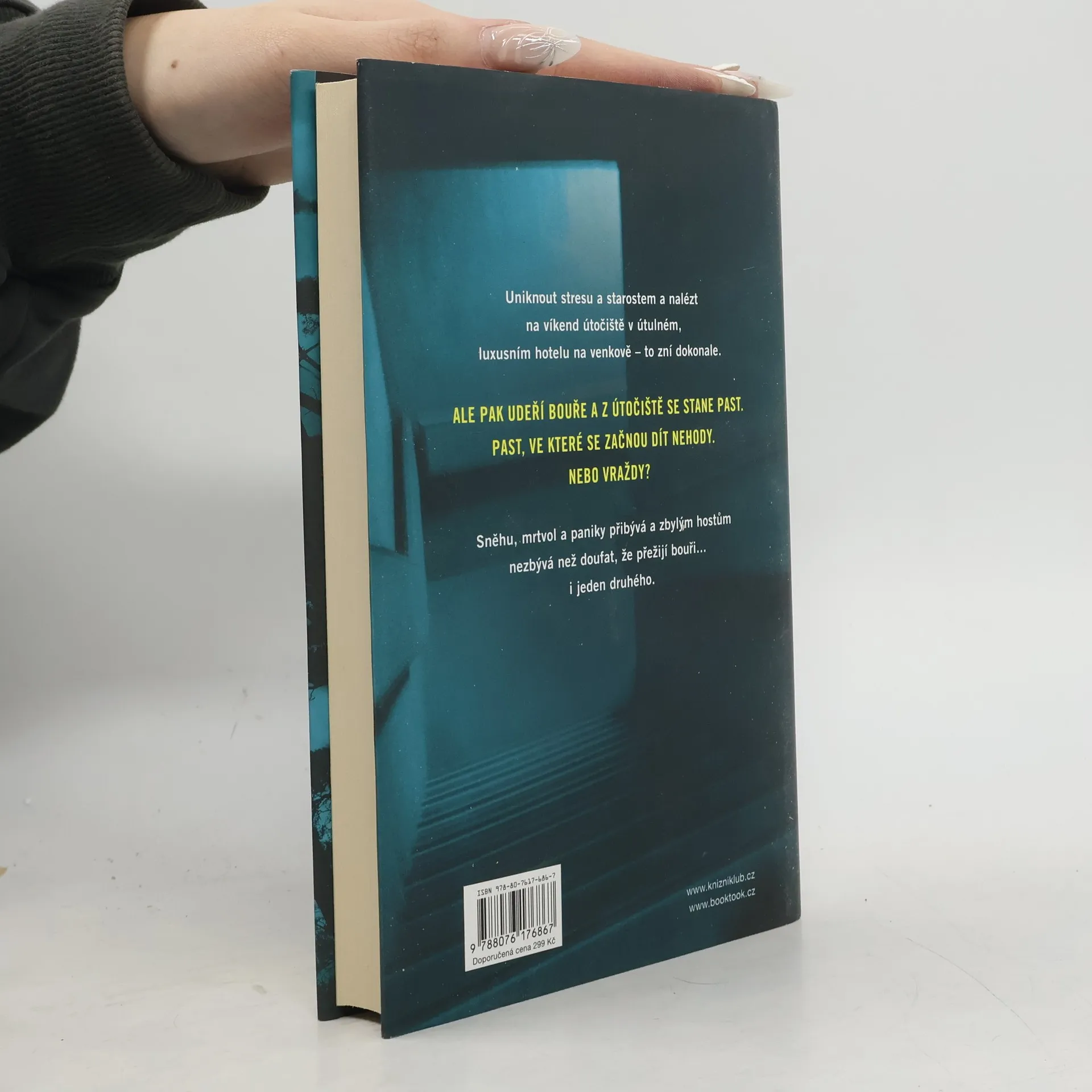 Do odlehlého venkovského hotelu přijíždí na zimní víkend několik hostů: Gwen a její kamarádka Riley, páry Ian a Lauren, Matthew a Dana, Beverly a Henry, proslulý obhájce David a staropanenská spisovatelka Candice. Poté co dorazí, udeří sněhová bouře, která odstřihne hotel od elektřiny i veškerého kontaktu s vnějším světem. A hned první noc dojde k tragické nehodě: Dana spadne ze schodů a zabije se. Byl to ale nezaviněný pád? Atmosféra houstne, baterie mobilů se pomalu vybíjejí a nedůvěra mezi hosty přechází v paranoiu – další smrt na sebe totiž nenechá dlouho čekat, a tentokrát už je to nepochybně vražda... Inspirace klasickými detektivkami, plíživé sílící napětí a hororové vyústění – Shari Lapena ani tentokrát neušetří čtenáře šokujícího odhalení, stejně nečekaného, jaký přinesly závěrečné zvraty v jejích předchozích psychothrillerech Manželé odvedle a Někdo cizí v domě