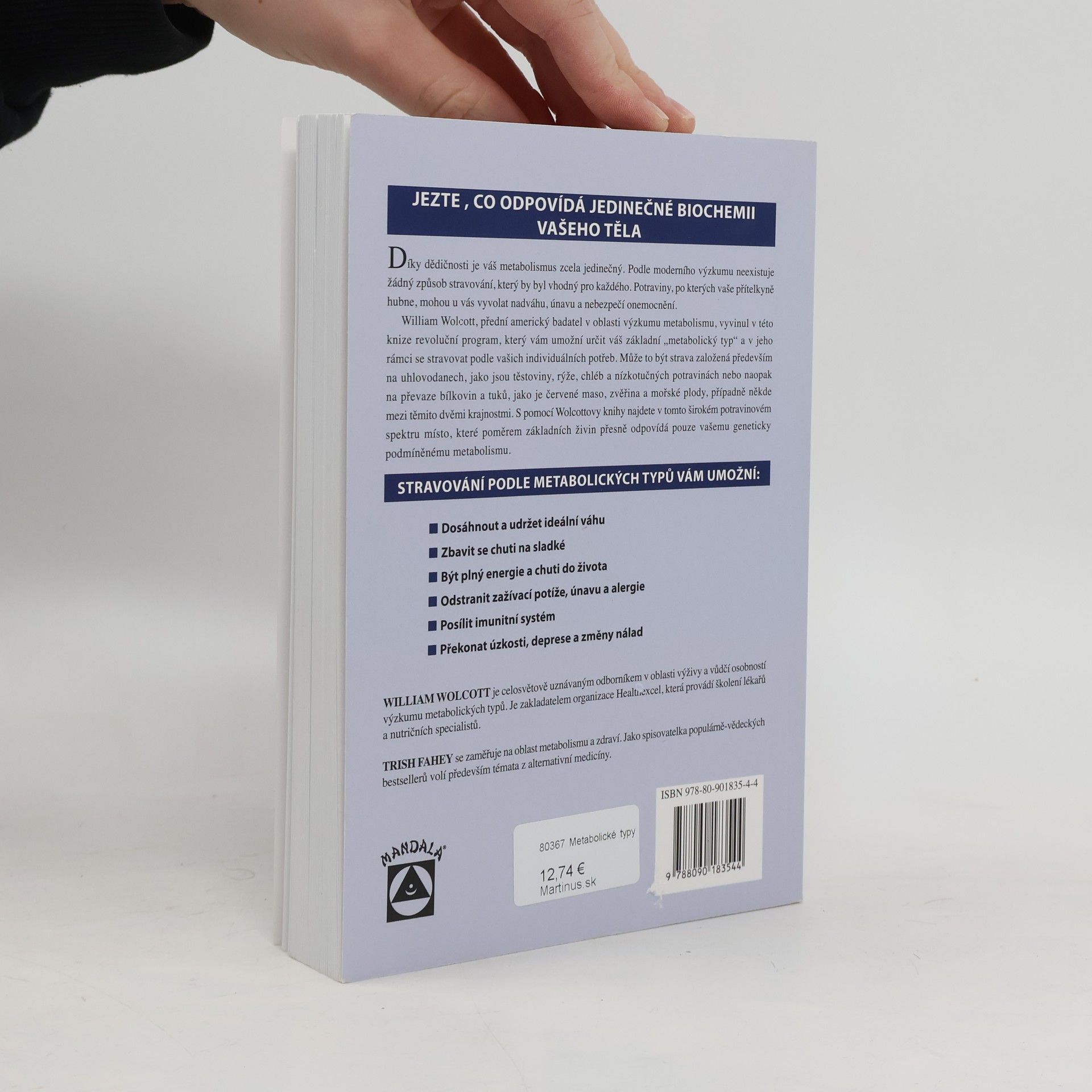 William Wolcott, přední americký badatel v oblasti výzkumu metabolismu, vyšel z předpokladu, že určitá strava, která někomu prospívá, u někoho může vyvolat onemocnění. A v této knize vyvinul revoluční program, který čtenářům umožní určit jejich základní „metabolický typ“, na kterém závisí způsob našeho stravování. Může to být buď strava založená především na uhlovodanech, jako jsou těstoviny, rýže, chléb a nízkotučných potravinách nebo naopak na převaze bílkovin a tuků, jako je červené maso, zvěřina a mořské plody, případně někde mezi těmito dvěmi krajnostmi. S pomocí Wolcottovy knihy čtenáři najdou v tomto širokém potravinovém spektru místo, které poměrem základních živin přesně odpovídá pouze jejich geneticky podmíněnému metabolismu. Tento způsob stravování pak čtenářům umožní mimo jiné dosáhnout a udržet ideální váhu, předejít nemocem a z dosavadních nemocí se uzdravit.