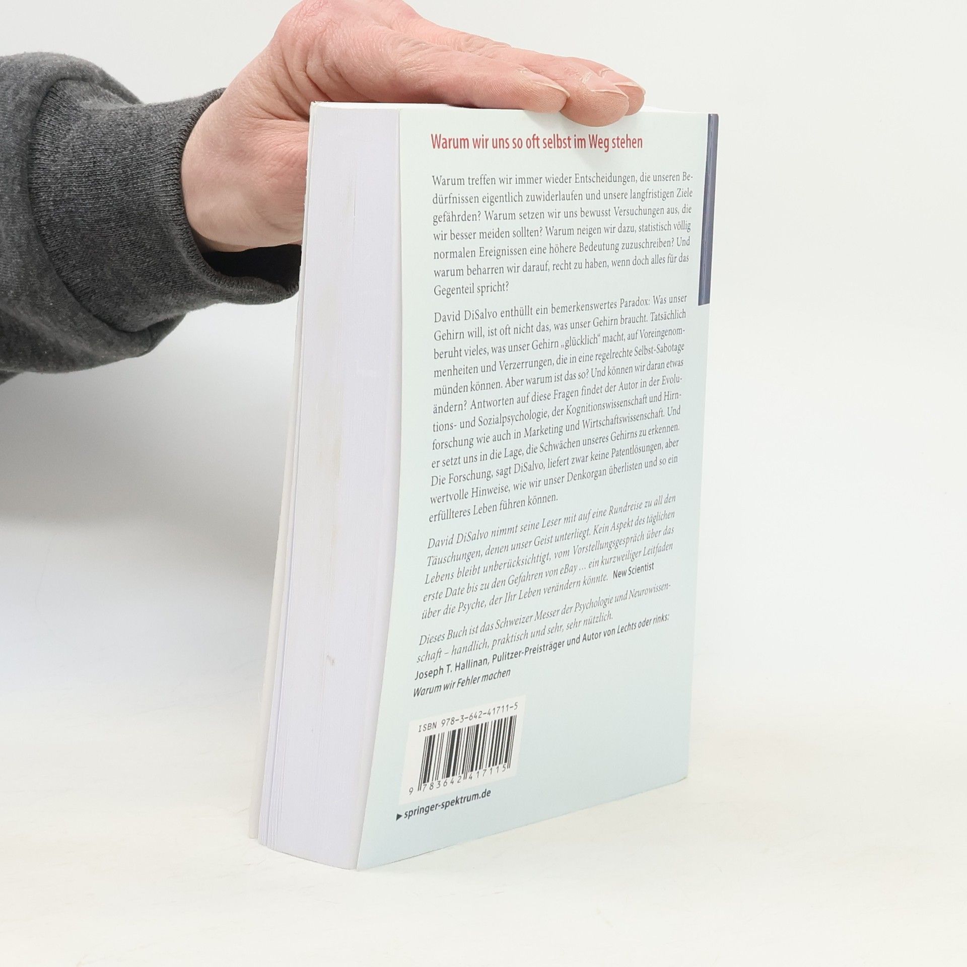 Warum treffen wir Entscheidungen, die unseren Bedürfnissen widersprechen und unsere langfristigen Ziele gefährden? Warum setzen wir uns bewusst Versuchungen aus, die wir besser meiden sollten? David DiSalvo enthüllt ein Paradox: Was unser Gehirn will, entspricht oft nicht dem, was es braucht. Viele Dinge, die unser Gehirn „glücklich“ machen, basieren auf Voreingenommenheiten und Verzerrungen, die zu Selbst-Sabotage führen können. Der Autor untersucht, warum das so ist und ob wir daran etwas ändern können. Dabei stützt er sich auf Erkenntnisse aus Evolutions- und Sozialpsychologie, Kognitionswissenschaft, Hirnforschung sowie Marketing und Wirtschaft. DiSalvo zeigt auf, wie wir die Schwächen unseres Gehirns erkennen können. Die Forschung bietet zwar keine Patentlösungen, liefert jedoch wertvolle Hinweise, wie wir unser Denken überlisten und ein erfüllteres Leben führen können. Er nimmt die Leser mit auf eine Reise durch die Täuschungen, denen unser Geist unterliegt, und beleuchtet verschiedene Lebensaspekte, vom Vorstellungsgespräch über das erste Date bis zu den Gefahren von eBay. Dieses Werk ist ein praktischer Leitfaden über die Psyche, der das Potenzial hat, Ihr Leben zu verändern.
