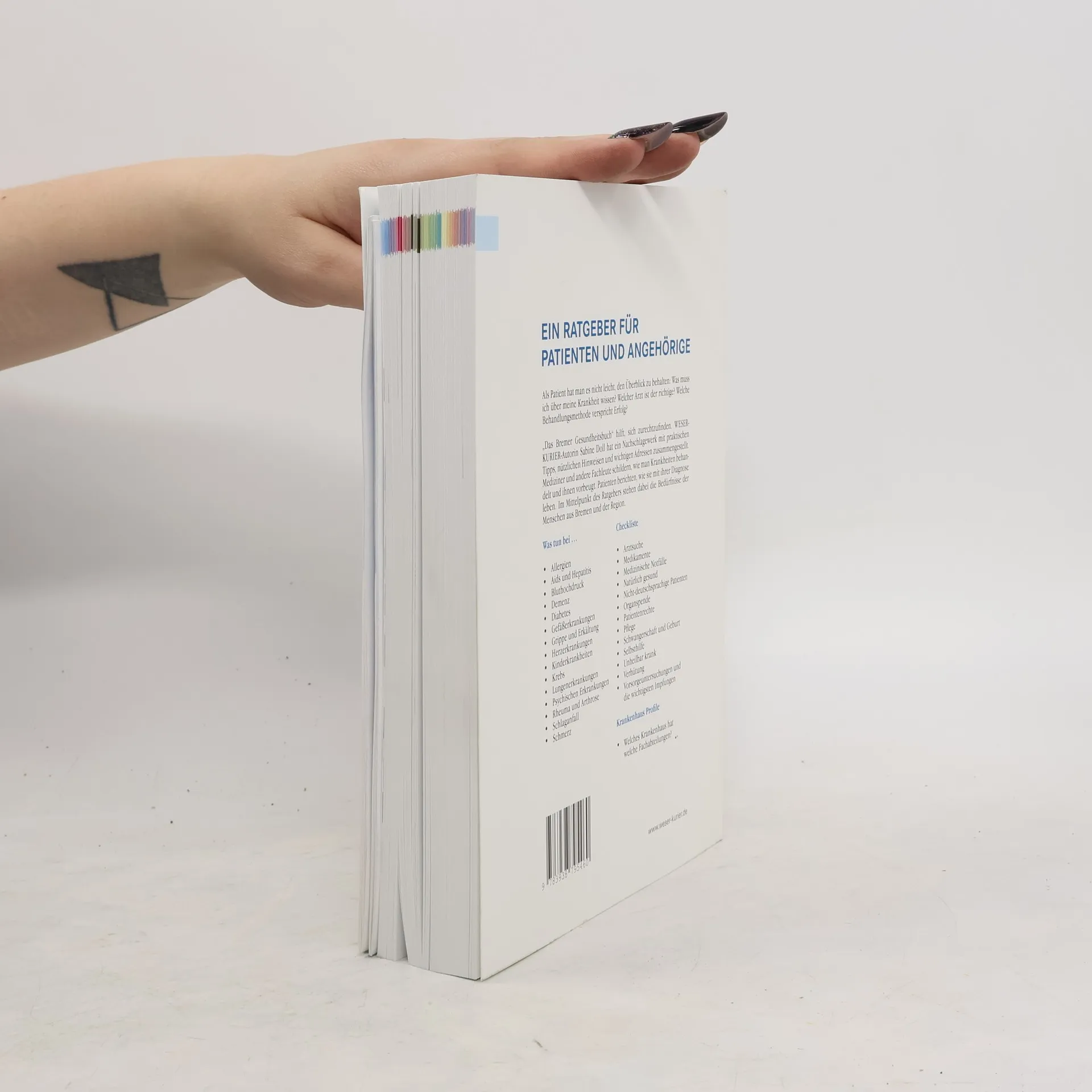 Ein Ratgeber für Patienten und Angehörige Als Patient hat man es nicht leicht, den Überblick zu behalten: Was muss ich über meine Krankheit wissen? Welcher Arzt ist der richtige? Welche Behandlungsmethode verspricht Erfolg? „Das Bremer Gesundheitsbuch“ hilft, sich zurechtzufinden. WESER-KURIER-Autorin Sabine Doll hat ein Nachschlagewerk mit praktischen Tipps, nützlichen Hinweisen und wichtigen Adressen zusammengestellt. Mediziner und andere Fachleute schildern, wie man Krankheiten behandelt und ihnen vorbeugt. Patienten berichten, wie sie mit ihrer Diagnose leben. Im Mittelpunkt des Ratgebers stehen dabei die Bedürfnisse der Menschen aus Bremen und der Region.
