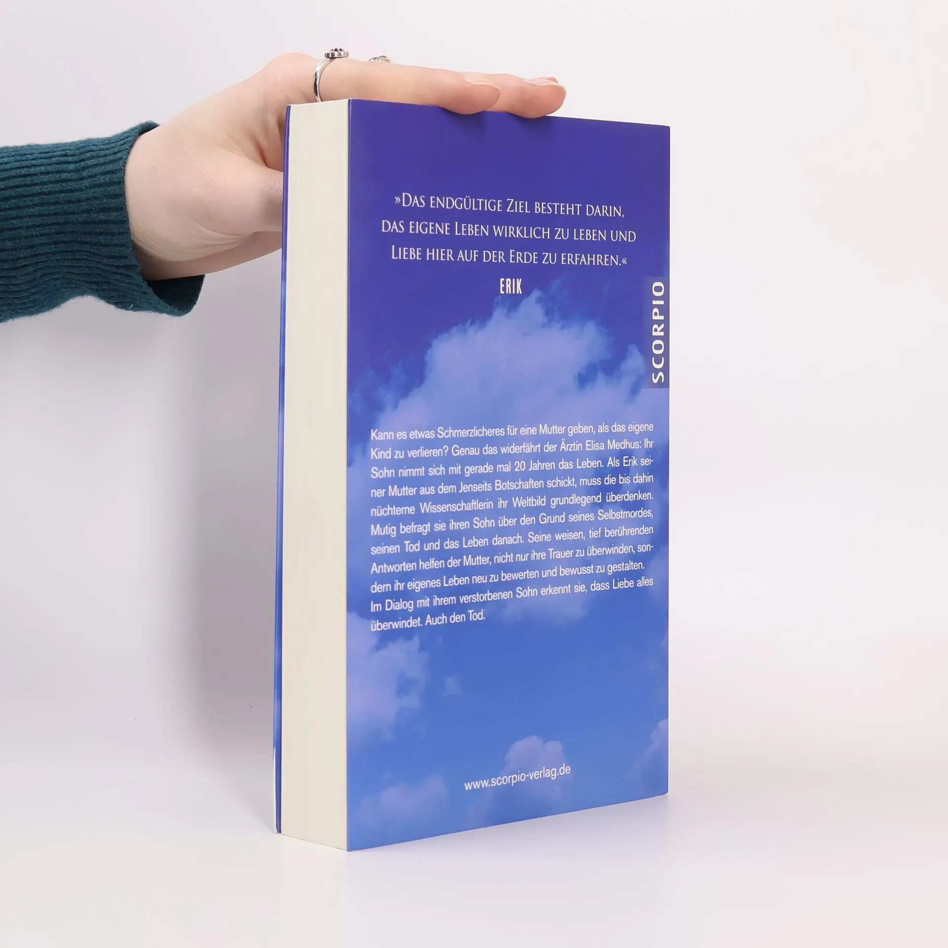 Gerade mal 20 Jahre alt, nimmt sich der Sohn der Ärztin Elisa Medhus das Leben. Als Erik seiner Mutter aus dem Jenseits Botschaften schickt, muss die bis dahin nüchterne Wissenschaftlerin ihr Weltbild grundlegend überdenken. Mutig befragt sie ihren Sohn über den Grund seines Selbstmords, seinen Tod und das Leben danach. Und erhält Antworten, die ein tiefes Verständnis vom Leben nach dem Tod liefern. Im Laufe der Gespräche mit ihrem Sohn wandelt sich Medhus von der Skeptikerin zur Gläubigen und erkennt: Liebe überwindet alles. Auch den Tod. Dr. Elisa Medhus glaubte nie an ein Leben nach dem Tod. Als ausgebildete Medizinerin orientierte sie sich zeit ihres Lebens ausschließlich an der Wissenschaft. Doch ihre Überzeugungen wurden von einem Tag auf den anderen auf den Kopf gestellt, als sich ihr Sohn Eric im Alter von 20 Jahren das Leben nahm und aus dem Jenseits Kontakt mit ihr aufnahm. Authentisch, ergreifend und spannend erzählt die Autorin, wie sie sich aus ihrer tiefen Trauer befreite und zu Heilung und Glauben fand. Basierend auf Medhus‘ erfolgreichem Blog ChannelingErik, gibt das Buch Antworten auf die universellen Fragen der Menschheit. Von der anderen Seite beschreibt Erik erfrischend offen seine eigenen Erfahrungen, das Wesen von Seelen, den Tod und das Leben danach – Einsichten, die unser Leben für immer verändern können.