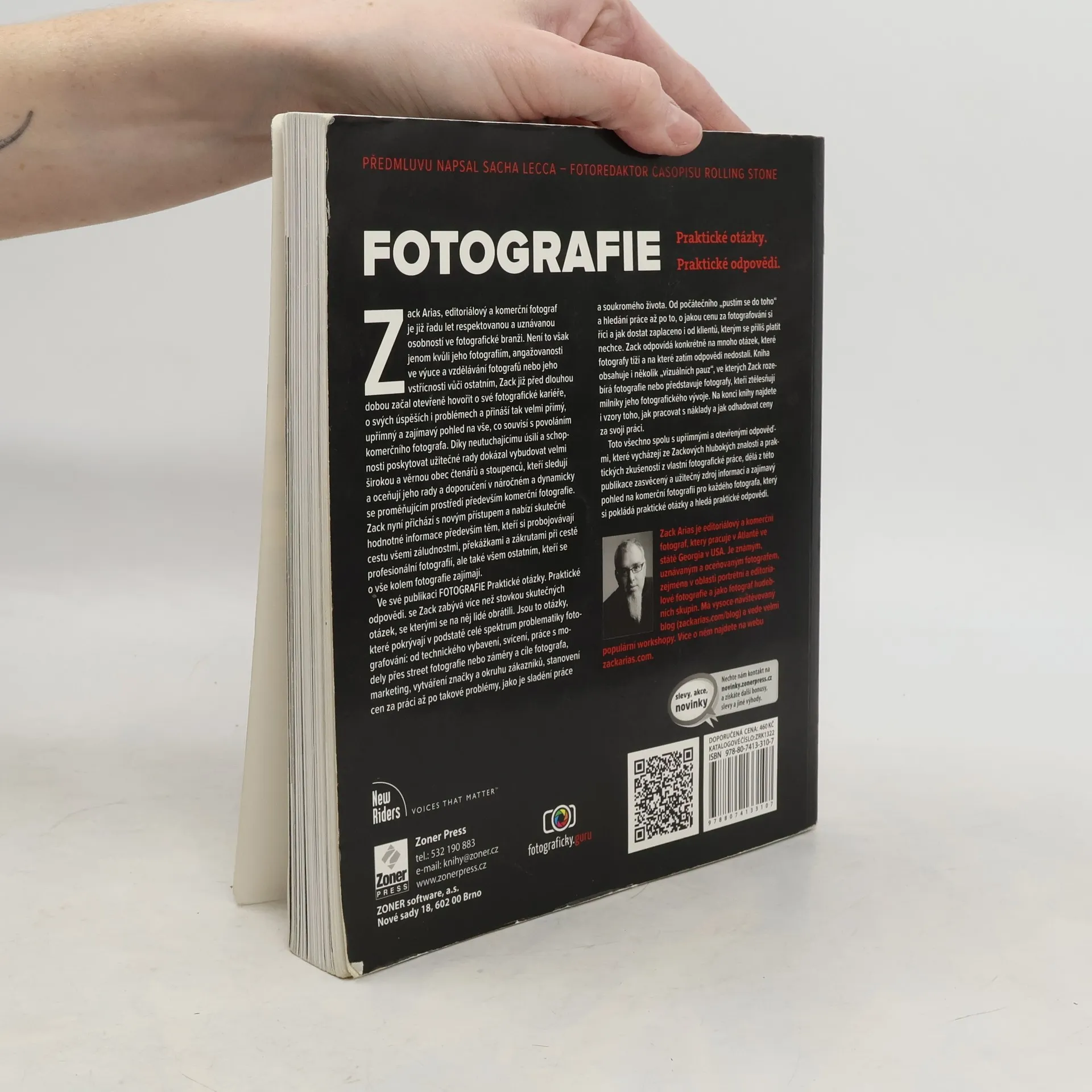 O všem kolem fotografování, na co jste se chtěli zeptat, a co vám asi ještě nikdo neřekl. Zack Arias, americký fotograf, se specializuje na tutoriálovou fotografii, hudební skupiny a street fotografii. Na svém blogu odpovídá na dotazy začínajících fotografů, zejména těch, kteří zvažují fotografii jako povolání. Kniha představuje výběr asi stovky otázek z blogu a Zackových odpovědí, které jsou často drsné, ale vždy založené na praktických zkušenostech. Zack neidealizuje profesi fotografa; zná detaily řemesla, shánění zakázek, konkurenci, náklady na techniku a úskalí jednání s klienty. Kromě řemesla se kniha zabývá i technickým vybavením, kde Zack poskytuje praktické rady: co je nezbytné, co si půjčit a do čeho investovat. Nepodporuje žádnou značku, a přesto ví, proč používá svůj Phase One. Jeho doporučení zahrnují minimální a pokročilé fotografické vybavení, doplněné o příběhy z vlastní praxe. Kniha je psána jazykem bloggera, s výstižnými výrazy, které v učebnici fotografie nenajdete. Tvoří tak unikátní dílo, které je praktické, realistické a od autora, který ví, o čem mluví.
