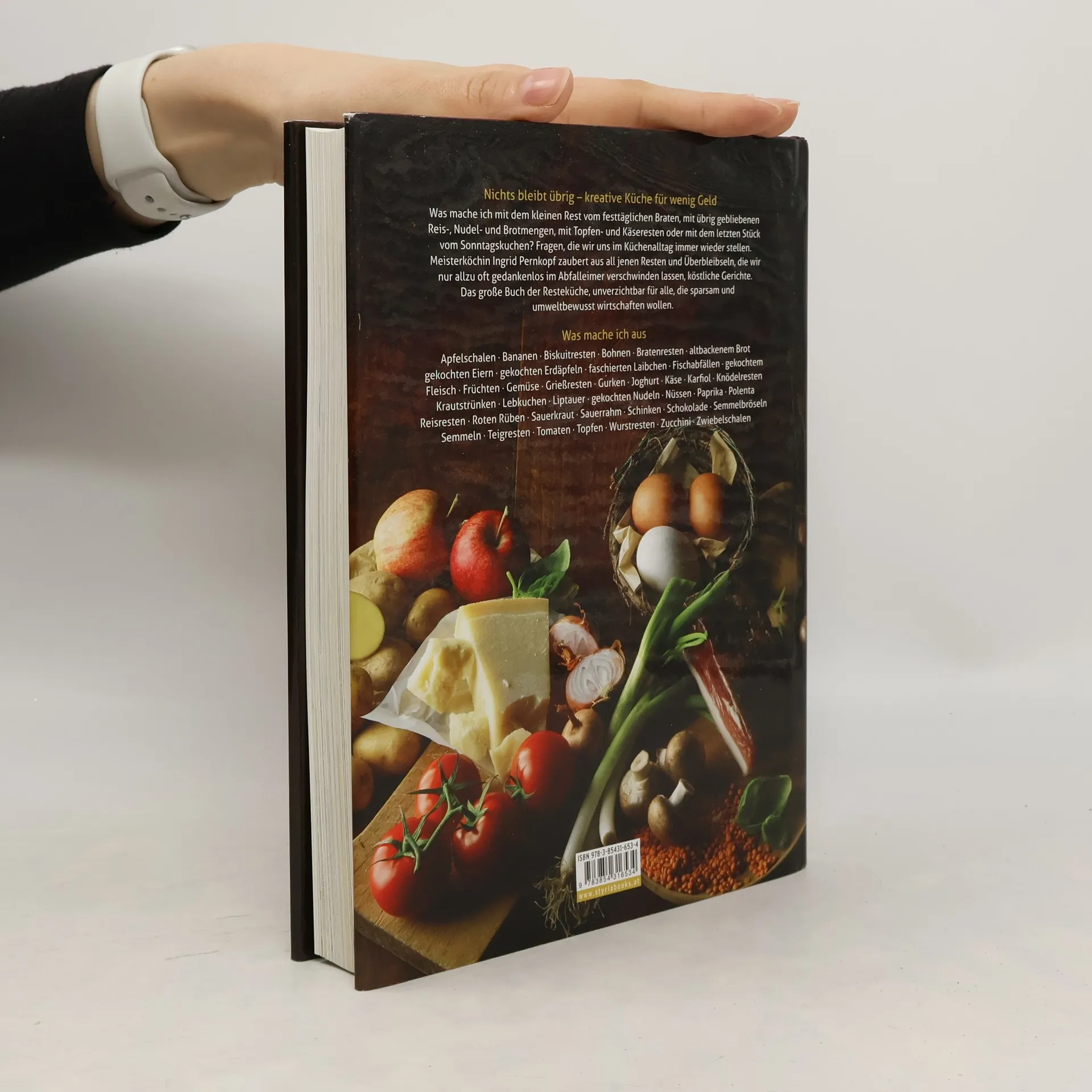 Bei ihren Kochkursen, so betont Ingrid Pernkopf, legt sie großen Wert darauf, dass alles verwertet wird – bis hin zum Knödelkochwasser. Mit etwas Kreativität kann man auch aus Resten noch etwas Köstliches zubereiten. Aufgewachsen bei ihrer Oma, die eine einfache Bäuerin, aber sehr gute Köchin war, lernte Ingrid Pernkopf schon früh den Wert eines Apfels oder einer Handvoll Kirschen, von einem Stück Bratenfleisch oder von Sauerkraut zu schätzen. Eine Erfahrung, die sie bis heute prägt: Mit Liebe und großer Kreativität widmet sie sich all jenen Resten und Überbleibseln, die wir nur allzu oft gedankenlos im Abfalleimer verschwinden lassen, und beweist, dass diese mit ein bisschen Fantasie zu hervorragend schmeckenden Gerichten verkocht werden können. Aus übrig gebliebenen Gemüseund Obstresten zaubert sie Chutneys und Relishes, Fleisch-, Mais- und Reisreste werden zu köstlichen Ofengerichten oder Kroketten verarbeitet, gekochte oder gebratene Fleischreste zu Knödel- und Strudelfülle, Altbrot zu Brotschmarren und Brotsuppe. Ein Kochbuch, das umfassend demonstriert, wie man Lebensmittel optimal nützt, unnötiges Wegwerfen von Resten vermeidet und im Küchenhaushalt nachhaltig und kostengünstig wirtschaftet.