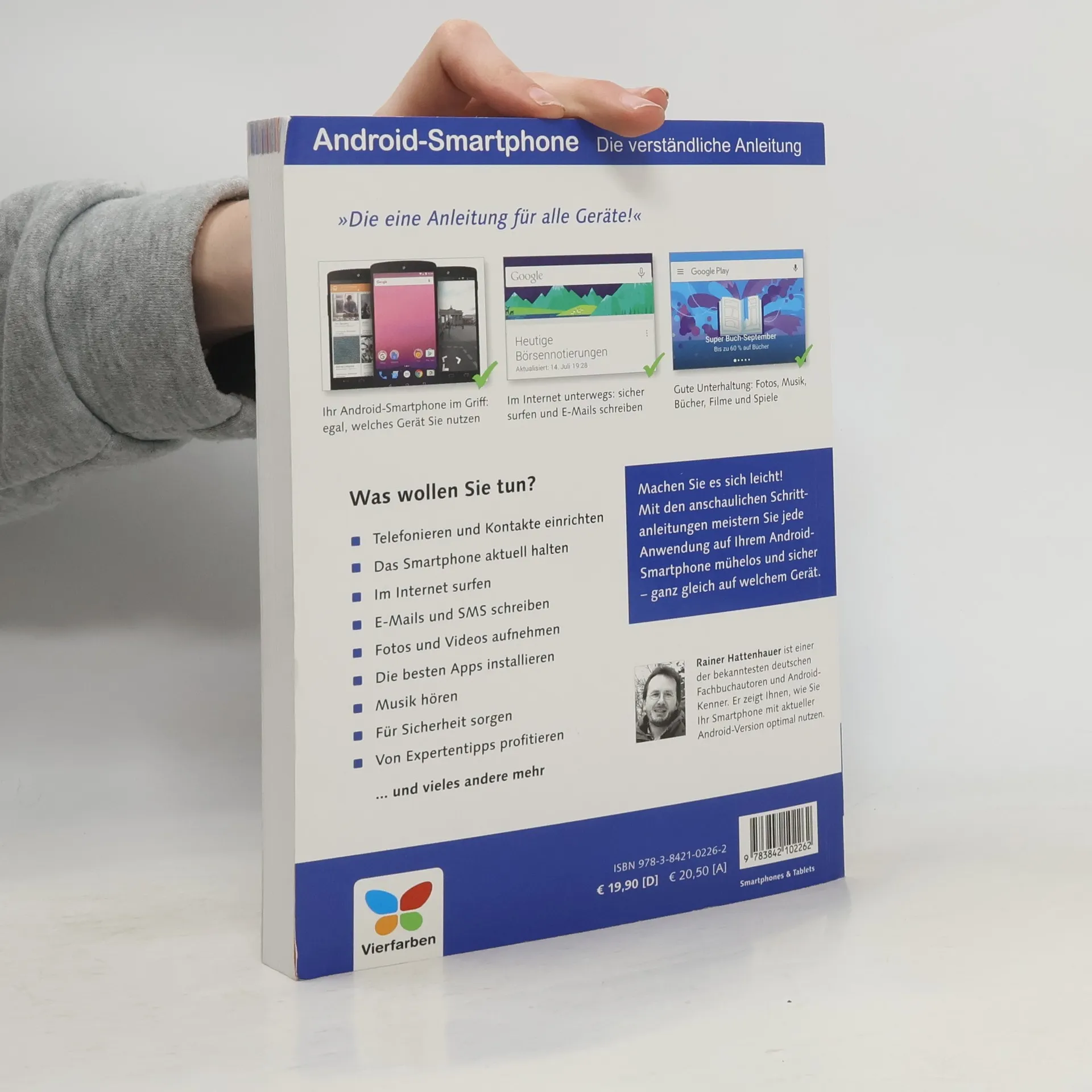 Machen Sie es sich leicht, und halten Sie den Kopf frei für all die spannenden Dinge, die Sie mit Ihrem Android-Smartphone unternehmen wollen! Telefonieren, E-Mails, Internet, Apps oder Fotos – Android-Experte Rainer Hattenhauer führt Sie ganz ohne Anstrengung und sicher an Ihr Ziel, ganz gleich, welches Gerät mit Android 5 Sie verwenden. Neben den anschaulichen Schritt-für-Schritt-Erklärungen gibt es zudem zahlreiche Tipps vom Experten. So gelingt auch der Datenaustausch mit dem Computer und funktioniert alles von Anfang an nach Wunsch! Aus dem Inhalt: Start mit dem Android-Smartphone Telefonieren und Kontakte einrichten Nachrichten senden und empfangen Online mit dem Android-Smartphone E-Mails senden und empfangen Das mobile Büro: Kalender, Erinnerungen & Co. Apps und Multimedia – der Google Play Store Fotografieren Videos – rund um bewegte Bilder Karten und Navigation Musik, Radio und E-Books Die besten Android-Spiele Sicherheit und Synchronisation Die Akkulaufzeit verlängern Das Smartphone warten und Fehler beheben