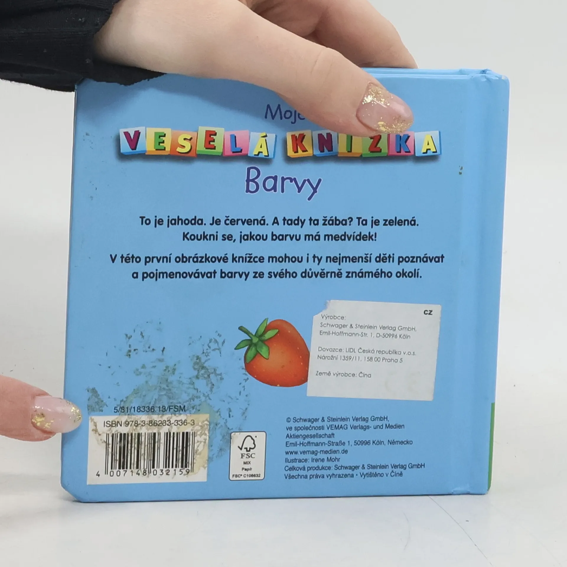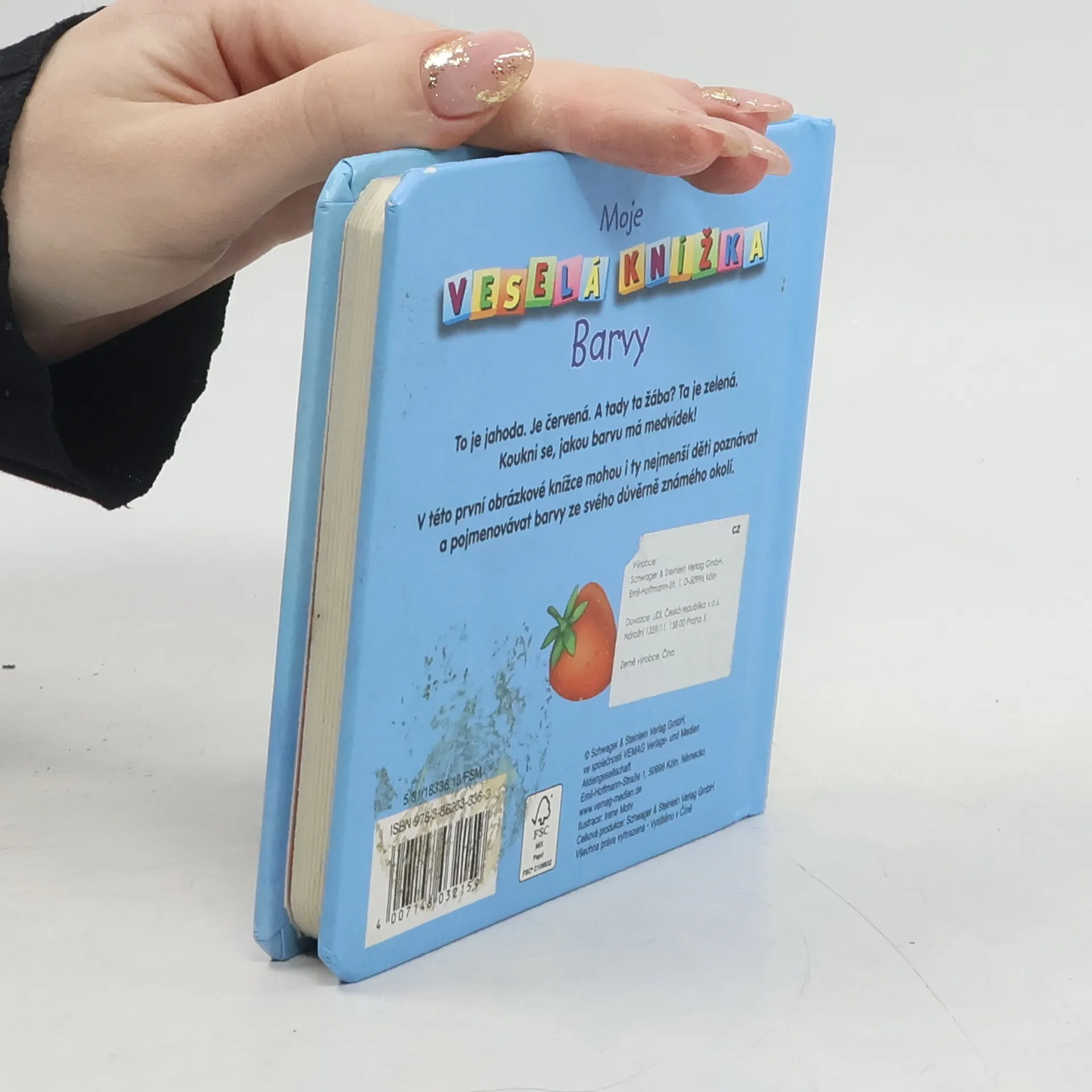 V této první obrázkové knížce mohou i ty nejmenší děti poznávat a pojmenovávat známá zvířata. To e jahoda. Je červená. A tady ta žába? Ta je zelená. Koukni se, jakou barvu má medvídek!