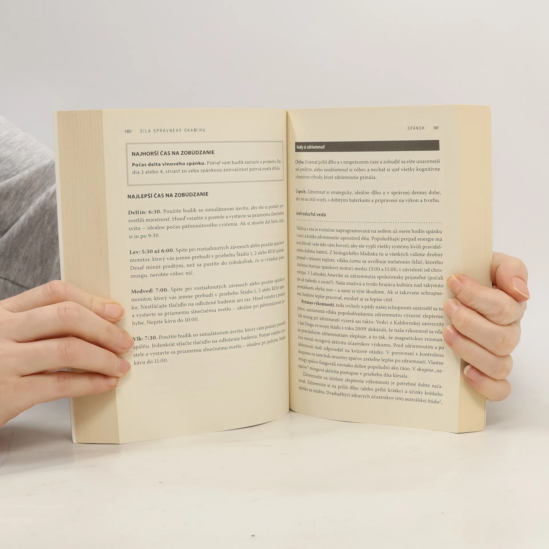 O knihe Objavte svoj chronotyp a ten najvhodnejší čas, kedy obedovať, ísť spať, požiadať o zvýšenie platu, mať sex, napísať knihu, užívať lieky či robiť iné veci. Nie je dôležité iba to, „čo“ a „ako“ robíme, ale aj „kedy“. Nie všetci sa totiž najlepšie sústredíme, spíme, najľahšie vstávame či máme najviac fyzických síl v rovnakom čase. Prečo je to tak? Množstvo bežných vecí, ktoré denne vykonávame, sa totiž riadi podľa našich biologických hodín, čiže podľa prirodzených procesov, ktoré sa v našom tele počas dvadsaťštyrihodinového cyklu dejú. Tieto biorytmy nedokážeme ovplyvniť, preto nedokážeme najlepšie pracovať vtedy, keď to práve potrebujeme, alebo sa zabávať, keď to najviac chceme. V knihe sa dozviete, prečo je dôležité tieto procesy poznať a ako z nich vyťažiť čo najviac pre svoje zdravie a celkovú pohodu. Autor rozdeľuje ľudí do štyroch skupín (chronotypov) podľa toho, aký typ prirodzeného vnútorného načasovania majú a odporúča im, kedy majú čo robiť.