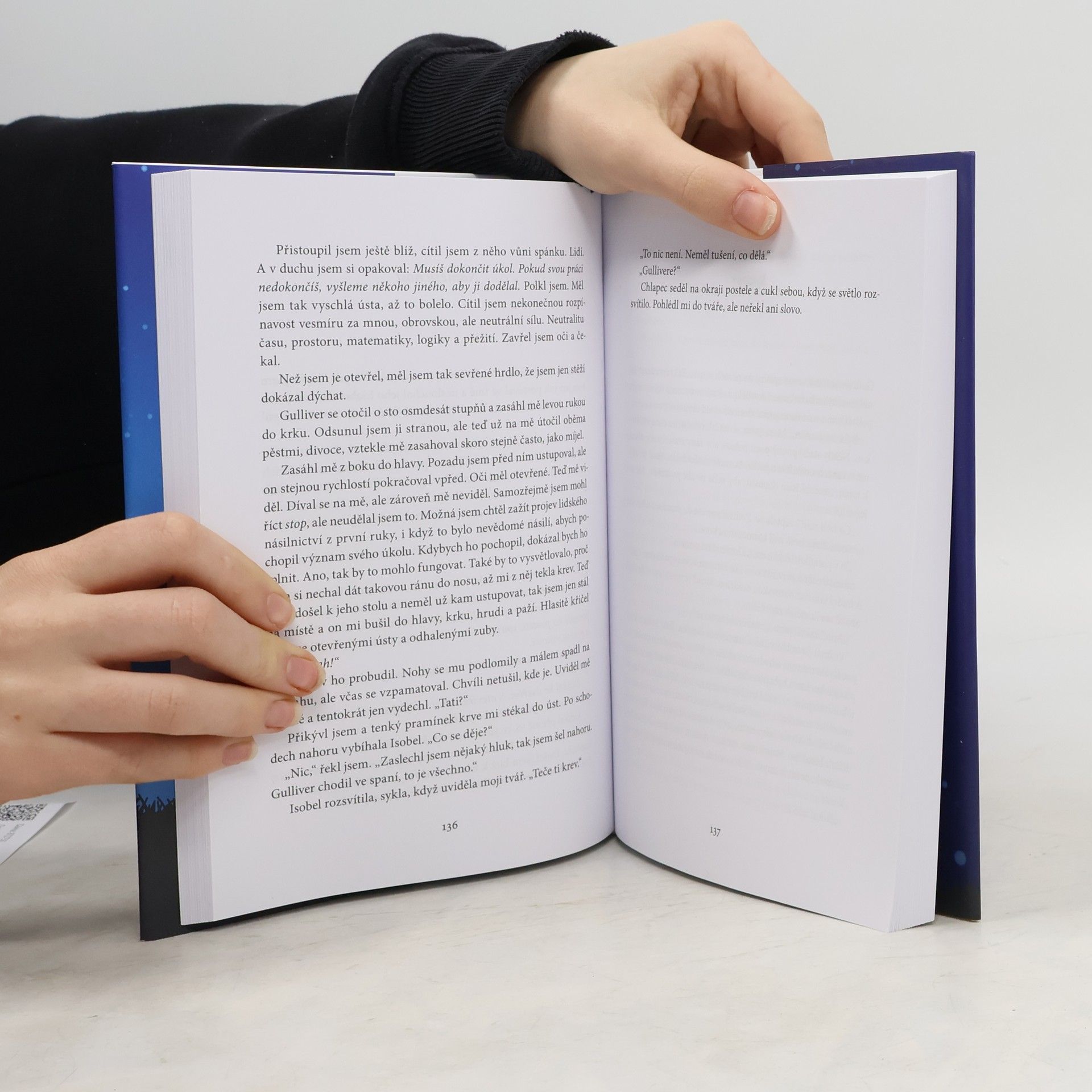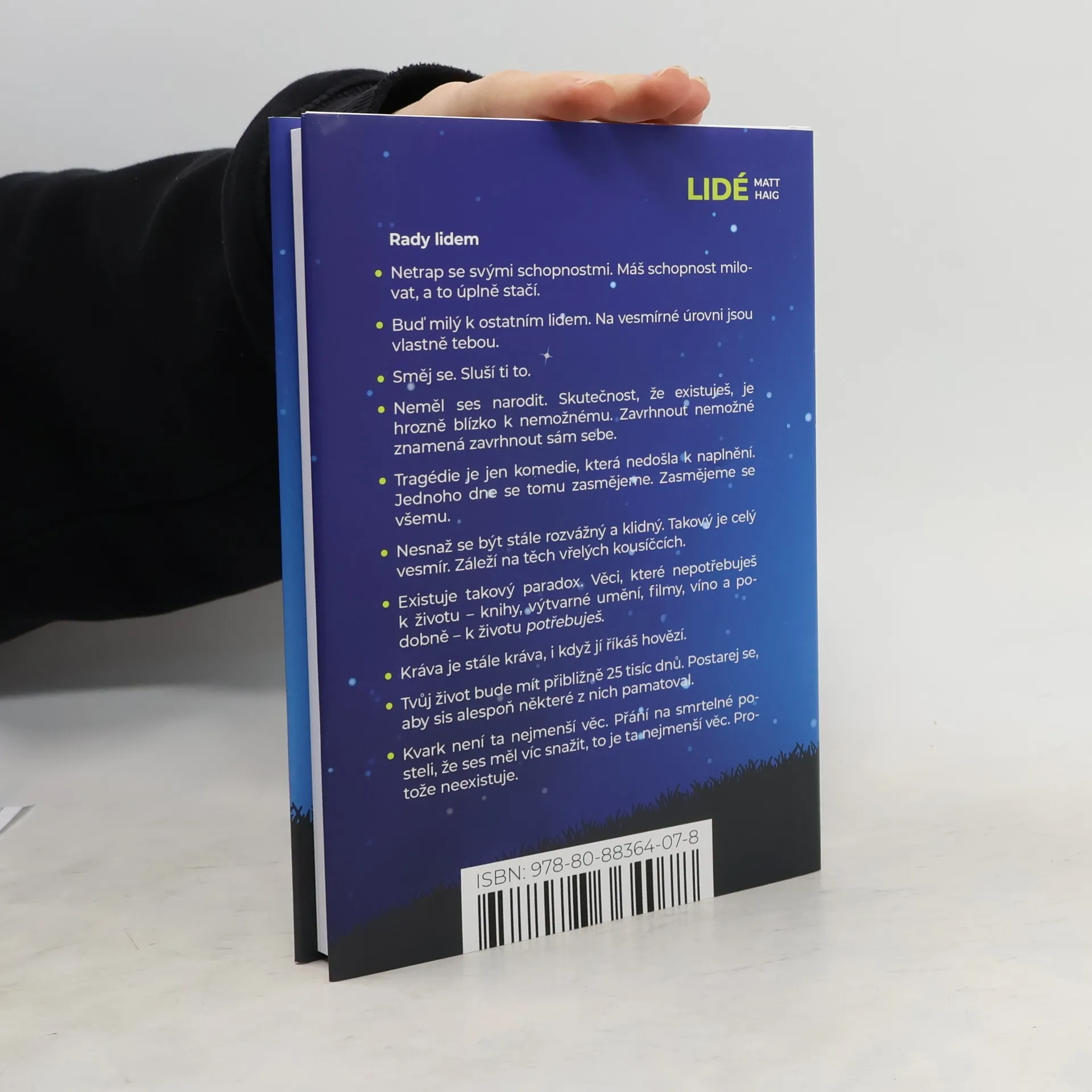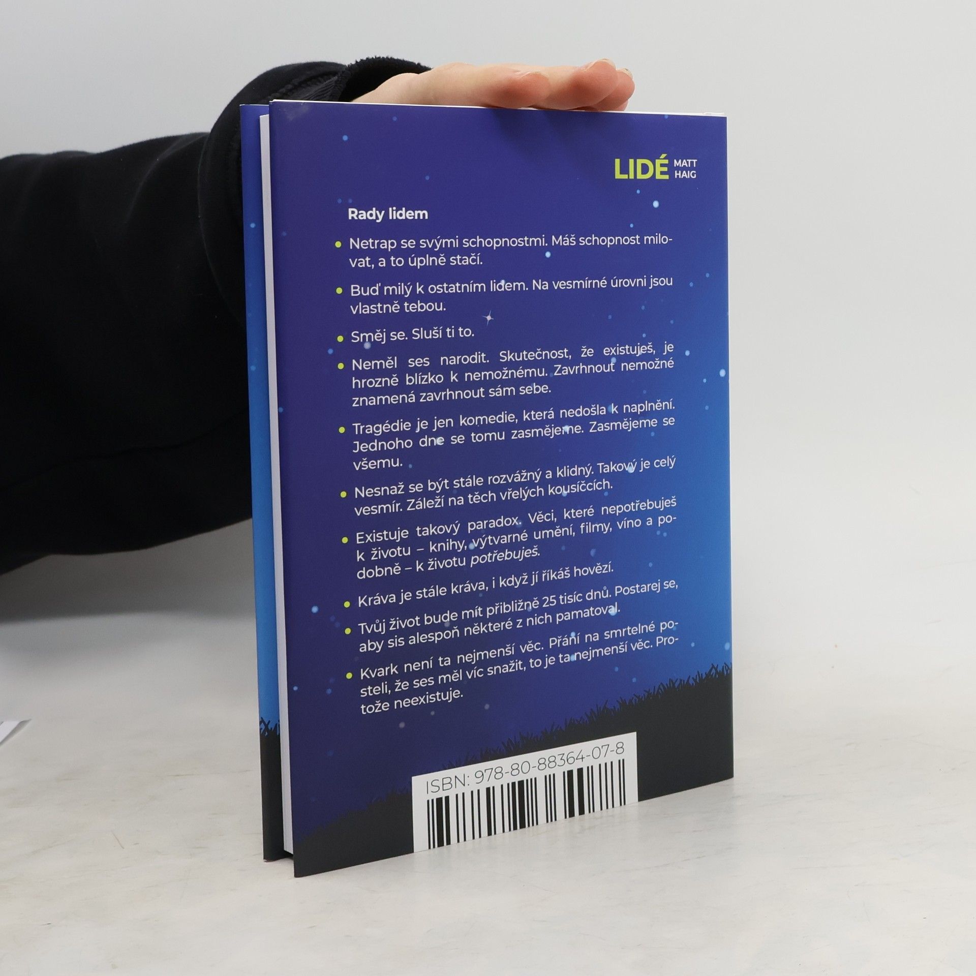 Rady lidem: Netrap se svými schopnostmi. Máš schopnost milovat, a to úplně stačí. Buď milý k ostatním lidem. Na vesmírné úrovni jsou vlastně tebou. Směj se. Sluší ti to. Neměl ses narodit. Skutečnost, že existuješ, je hrozně blízko k nemožnému. Zavrhnout nemožné znamená zavrhnout sám sebe. Tragédie je jen komedie, která nedošla k naplnění. Jednoho dne se tomu zasmějeme. Zasmějeme se všemu. Nesnaž se být stále rozvážný a klidný. Takový je celý vesmír. Záleží na těch vřelých kousíčcích. Existuje takový paradox. Věci, které nepotřebuješ k životu – knihy, výtvarné umění, filmy, víno a podobně – k životu potřebuješ. Kráva je stále kráva, i když jí říkáš hovězí. Tvůj život bude mít přibližně 25 tisíc dnů. Postarej se, aby sis alespoň některé z nich pamatoval. Kvark není ta nejmenší věc. Přání na smrtelné posteli, že ses měl víc snažit, to je ta nejmenší věc. Protože neexistuje. Tato kniha, tato konkrétní kniha, vzniká právě tady, na Zemi. Pojednává o smyslu života a vůbec o ničem. Je o tom, co vyžaduje někoho zabít a zároveň ho zachránit. Je o lásce, mrtvých básnících a burákovém másle. Je o hmotě, antihmotě, o všem a o ničem, o naději a nenávisti. Je o jednačtyřicetileté historičce Isobel, jejím patnáctiletém synovi Gulliverovi a o nejchytřejším matematikovi na světě. V krátkosti, je prostě o tom, jak se stát člověkem.