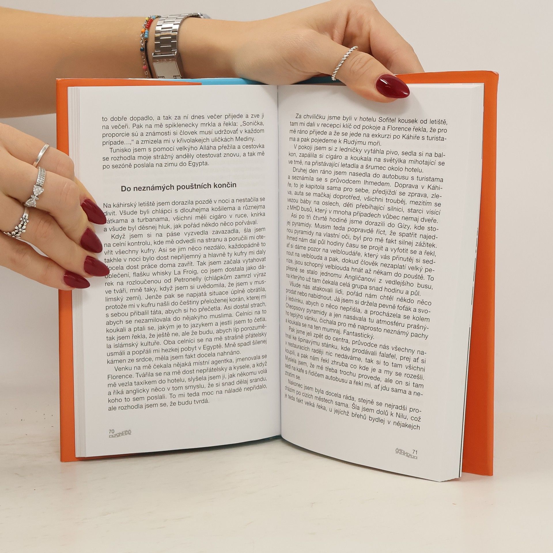Svěží a vtipné vyprávění čerstvé maturantky Sonji nás zavede do řady míst: do Německa, Švýcarska, Anglie a Skotska, kam se vypravila, aby se naučila jazyk a poznala svět. Se stejným cílem, ale už jako zaměstnankyně cestovní kanceláře pak do Tuniska, Egypta, na Kanárské ostrovy, na Korfu, do Dominikánské republiky. Státy, místa i města jsou důležitá, ale nejdůležitější jsou lidé, vzájemná setkání, poznávání se, porozumění i neporozumění mezi lidmi odlišných kultur a mentalit. Na svých cestách jich potkala celou řadu a seznamuje nás s nimi s humorem, vhledem a pochopením. Při svém dobrodružném a bezstarostném putování se občas dostala i do situací, kdy se její andělé strážní pořádně zapotili…