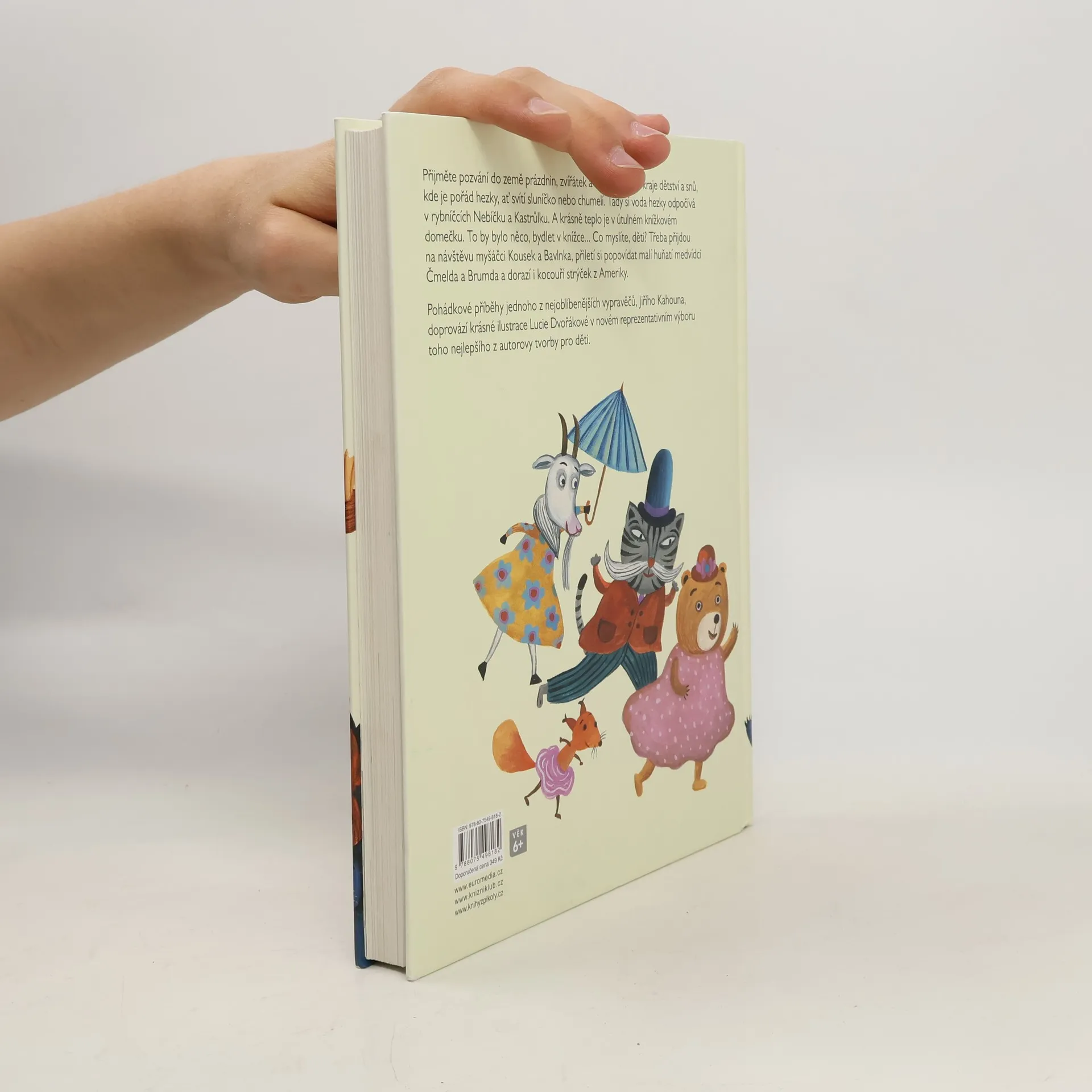 Nejkrásnější příběhy Jiřího Kahouna. Za devatero horami a devatero lesy, daleko, předaleko, ale vlastně jen co by kamenem dohodil, se rozkládá překrásný kraj. Dá se do něj dojít pěšky, s ruksakem na zádech, nebo dojet kodrcajícím vláčkem. Je to země prázdnin, zvířátek a strašidýlek, kraj dětství a snů, kde je pořád hezky, ať svítí sluníčko nebo chumelí. V jednom ze zdejších lesů stojí mohutný vykotlaný strom a vedle stromu židle sroubené ze smrkových kmínků. Kdybyste se sem náhodou přece jen dostali a měli štěstí, uvidíte tam vysedávat dědečka. Chvilku vedle něj poseďte a počkejte, až dobafá z fajfky. Pak se ozve zaskřípání a vy s překvapením zjistíte, že v mohutném kmeni jsou malá dvířka. A věřte nevěřte, jsou to dvířka do pohádky. Nejkrásnější pohádkové příběhy jednoho z nejoblíbenějších vypravěčů Jiřího Kahouha doprovází krásné a výpravné ilustrace Lucie Dvořákové v novém reprezentativním výboru toho nejlepšího z autorovy tvorby pro děti. Kniha je určena pro čtenáře od 6 let.