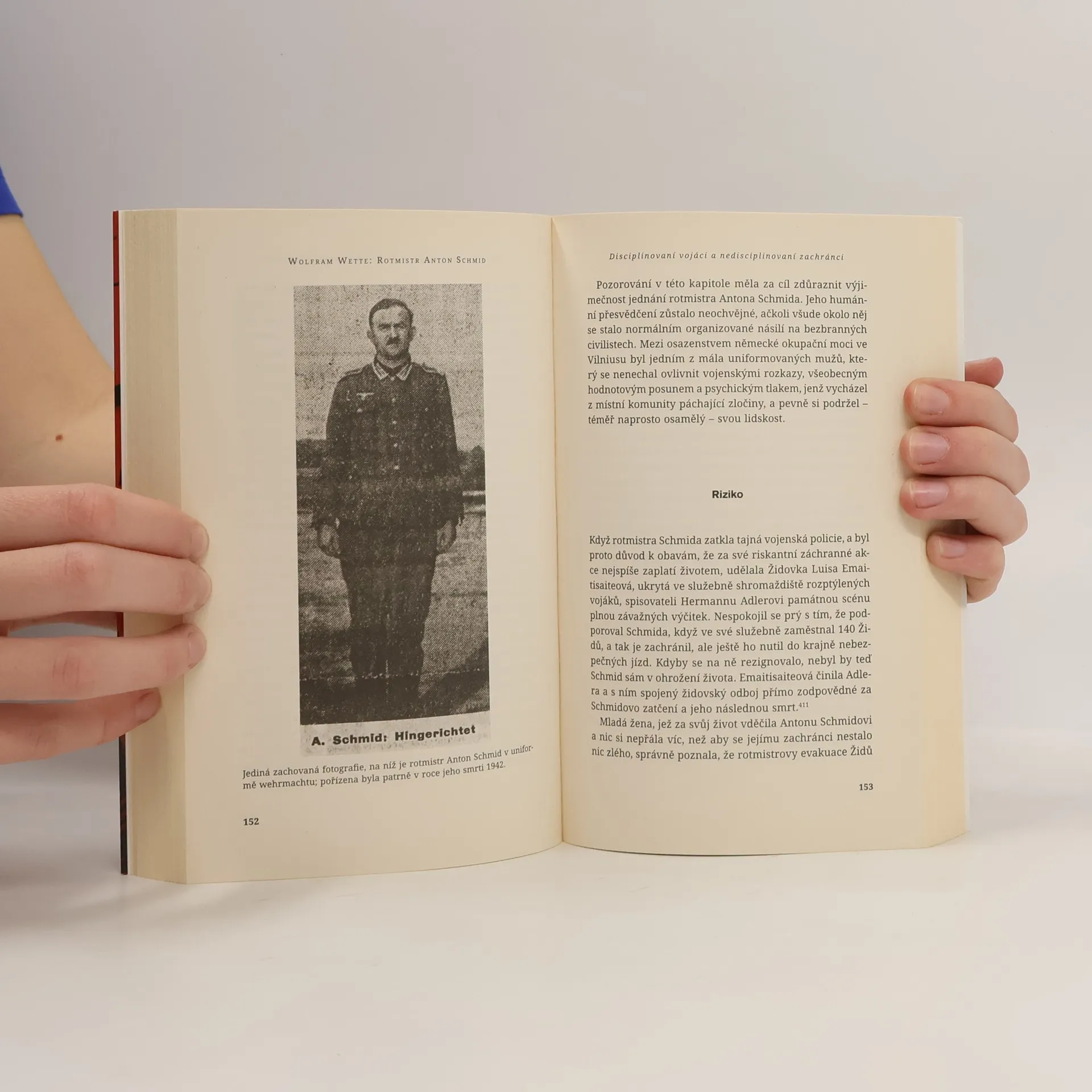 Biografie z pera německého vojenského historika zachycuje osudy příslušníka wehrmachtu, který v době holokaustu jako jeden z mála německých vojáků aktivně a nezištně pomáhal Židům. Za tuto činnost byl odsouzen a 13. dubna 1942 popraven. Wetteho práce se podrobně věnuje také dění na okupované Litvě v rámci nacistického programu likvidace židovského obyvatelstva. Vedle celkového průběhu vyvražďování si autor všímá také příběhů několika dalších německých vojáků a důstojníků, kteří pomáhali židovským obětem. Pozornost věnuje také Schmidovu odkazu v poválečném Německu. Jen velmi pozvolna se zbavoval příměsi „zrádcovství“ a ještě na přelomu tisíciletí se skupina důstojníků bundeswehru dlouhou dobu bránila pojmenování kasáren jeho jménem. Příběh Schmidova zdánlivě obyčejného hrdinství lze číst jako románové vyprávění; avšak i ti, kteří se jinak vymlouvají „na dobu“ nebo „na rozkazy“, v něm mohou nalézt neokázalý a nezpochybnitelný mravní vzor. Kniha je též brilantní ukázkou historické práce o „obyčejném člověku z lidu“, při níž se badatel musí vyrovnat s nedostatkem primárních pramenů.