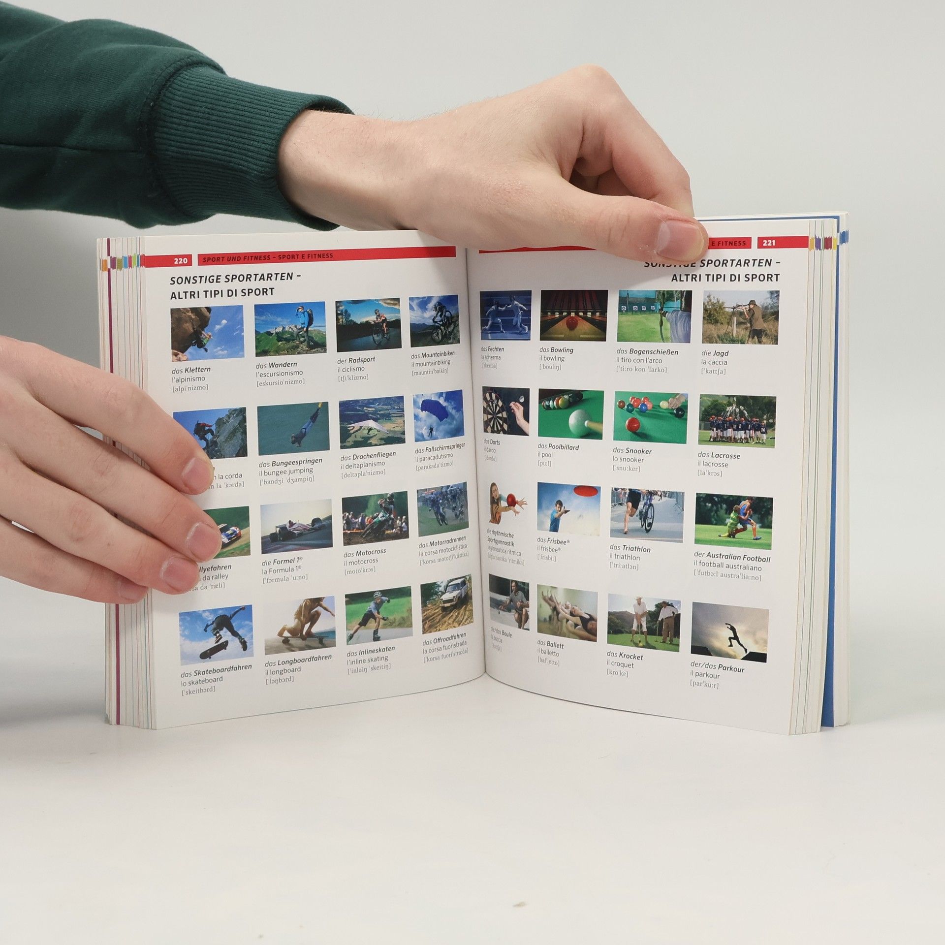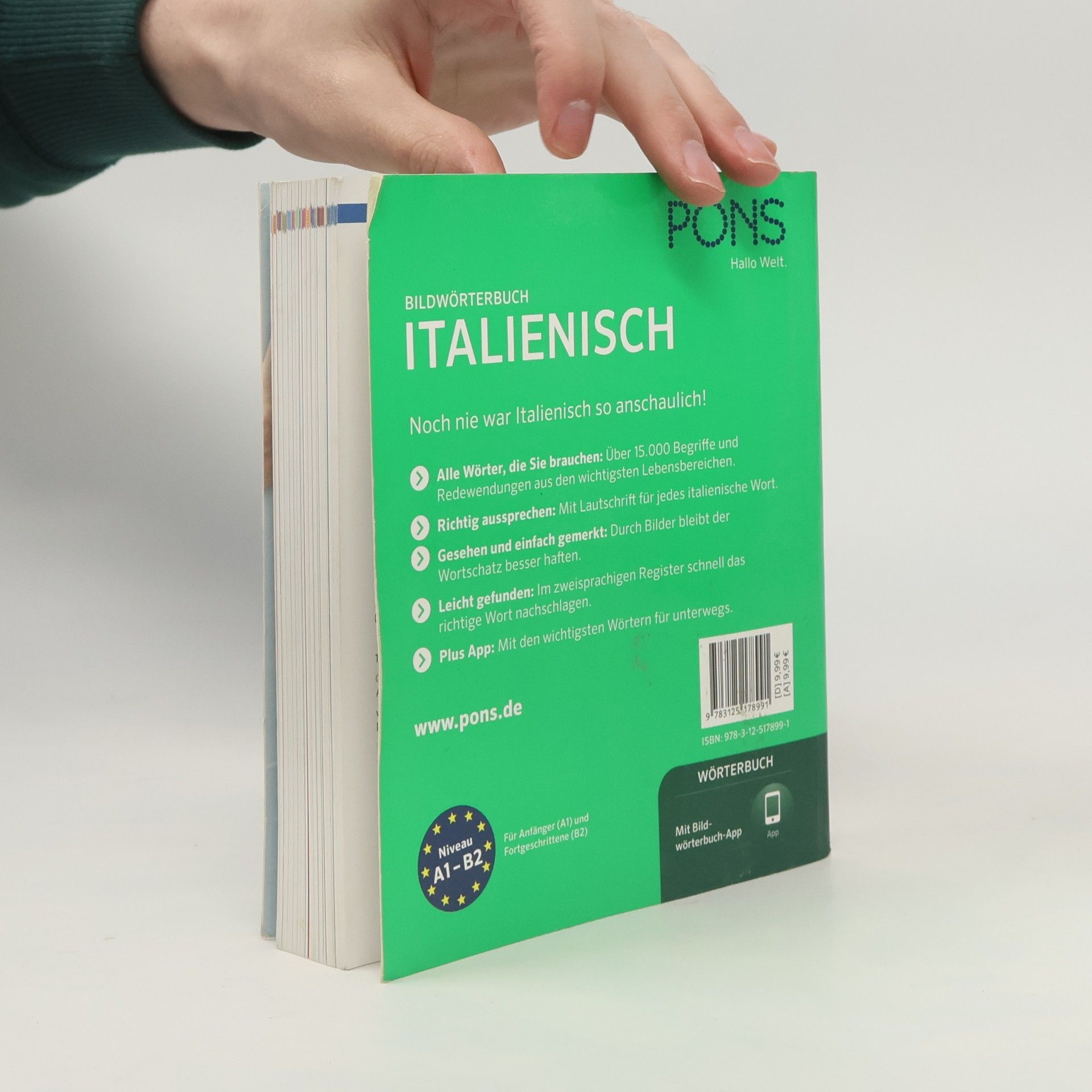 „Noch nie war Italienisch so anschaulich! - Alle Wörter, die Sie brauchen: Über 12.500 Begriffe und Redewendungen aus den wichtigsten Lebensbereichen in 3.000 Bildern. - Richtig aussprechen: Mit Lautschrift für jedes italienische Wort. - Gesehen und einfach gemerkt: Durch Bilder bleibt der Wortschatz besser haften. - Leicht gefunden: Im zweisprachigen Register schnell das richtige Wort nachschlagen. - Plus: komplett vertonte App mit den wichtigsten Wörtern für unterwegs. Sehen, verstehen, gemerkt! Mit Bildern den gesamten Grund- und Aufbauwortschatz nachschlagen und lernen. Für Anfänger (A1) und Fortgeschrittene (B2). Für alle, die Wörter schnell und effizient nachschlagen wollen. “