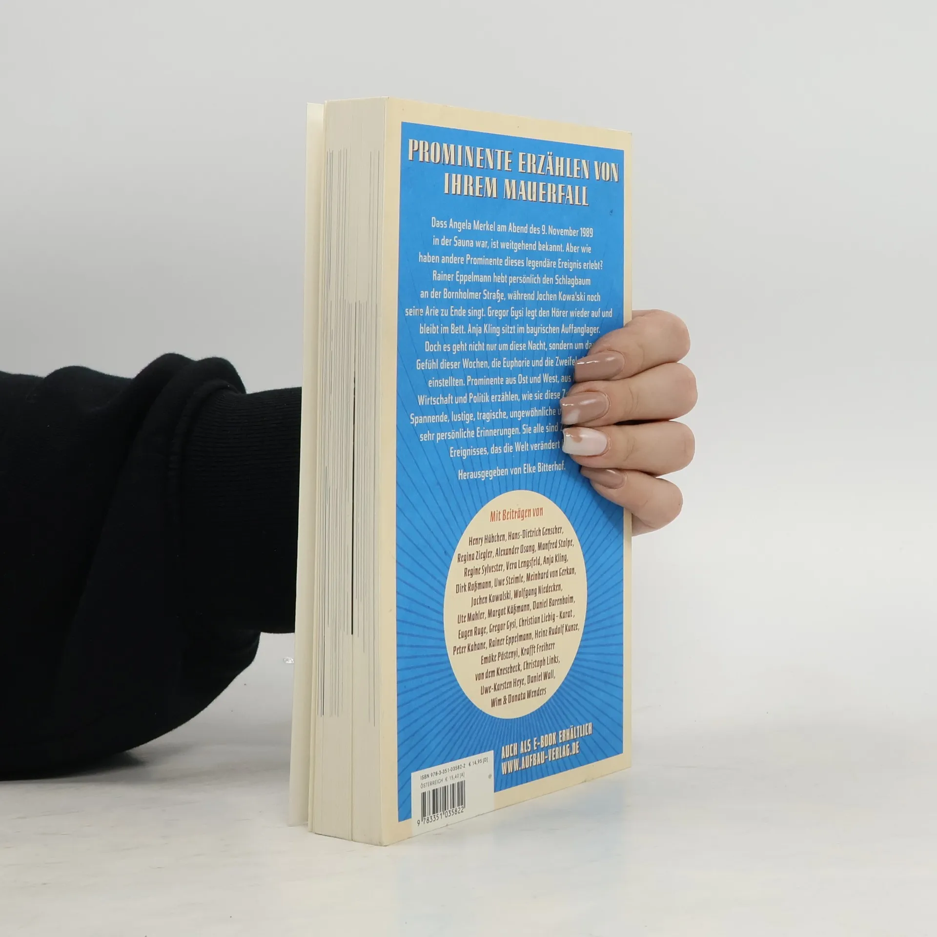 Prominente erzählen von ihrem Mauerfall Dass Angela Merkel am Abend des 9. November 1989 in der Sauna war, ist weitgehend bekannt. Aber wie haben andere Prominente dieses legendäre Ereignis erlebt? Rainer Eppelmann hebt persönlich den Schlagbaum an der Bornholmer Straße, während Jochen Kowalski noch seine Arie zu Ende singt. Gregor Gysi legt den Hörer wieder auf und bleibt im Bett. Anja Kling sitzt im bayrischen Auffanglager. Doch es geht nicht nur um diese Nacht, sondern um das Gefühl dieser Wochen, die Euphorie und die Zweifel, die sich einstellten. Prominente aus Ost und West, aus Kultur, Wirtschaft und Politik erzählen, wie sie diese Zeit erlebten. Spannende, lustige, tragische, ungewöhnliche und in jedem Fall sehr persönliche Erinnerungen. Sie alle sind Zeugen eines Ereignisses, das die Welt verändert hat. Mit Beiträgen von Henry Hübchen, Hans-Dietrich Genscher, Regina Ziegler, Alexander Osang, Manfred Stolpe, Regine Sylvester, Vera Lengsfeld, Anja Kling, Dirk Roßmann, Uwe Steimle, Meinhard von Gerkan, Jochen Kowalski, Wolfgang Niedecken, Ute Mahler, Margot Käßmann, Daniel Barenboim, Eugen Ruge, Gregor Gysi, Karat – Christian Liebig, Peter Kahane, Rainer Eppelmann, Heinz Rudolf Kunze, Emöke Pöstenyi, Krafft Freiherr von dem Knesebeck-Milendonck, Christoph Links, Uwe-Karsten Heye, Daniel Wall, Wim Wenders, Donata Wenders