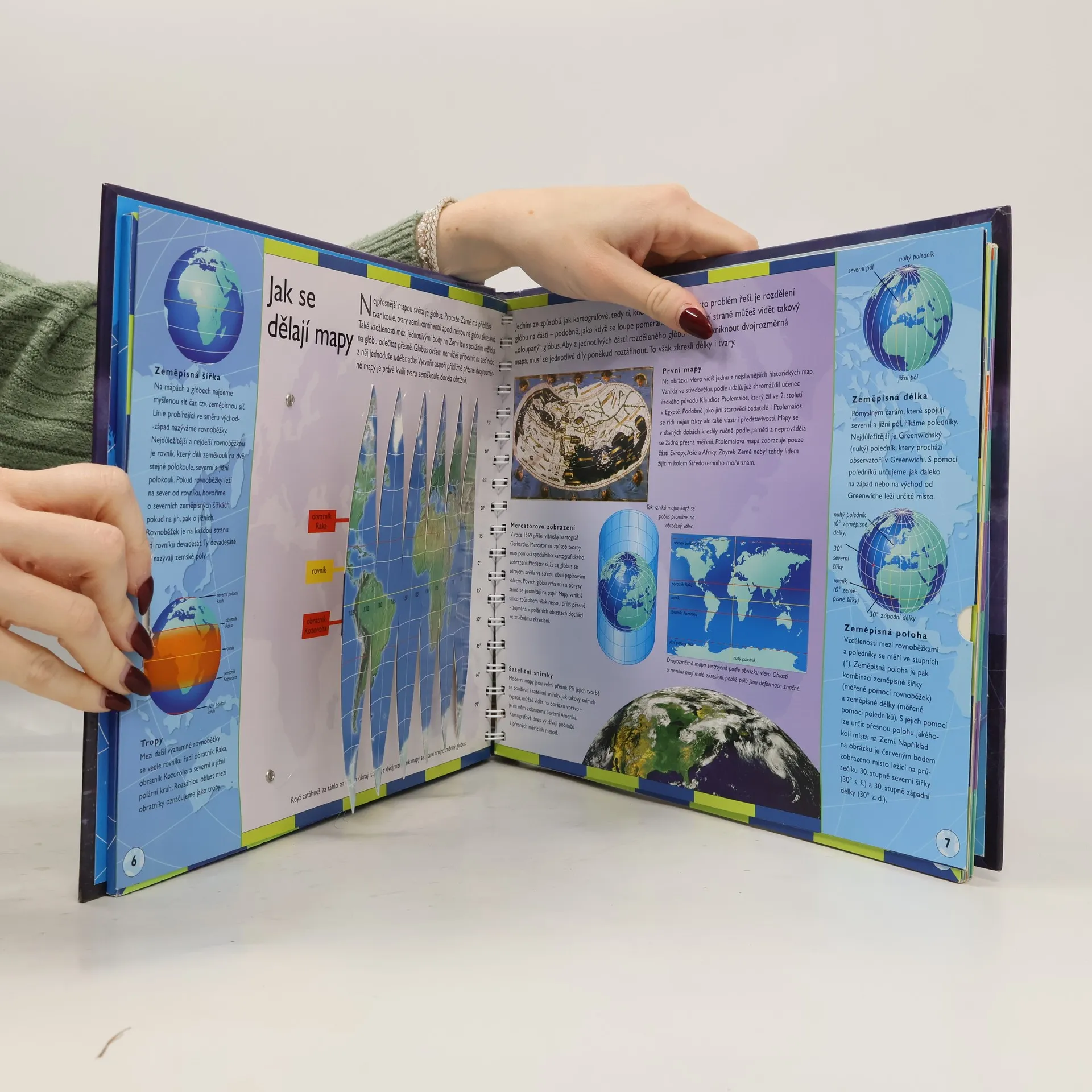 Kartonové listy (některé s průřezy či zdvojené) s interaktivními prvky - plastickou mapou, posuvnými obrázky a vlepenými přílohami