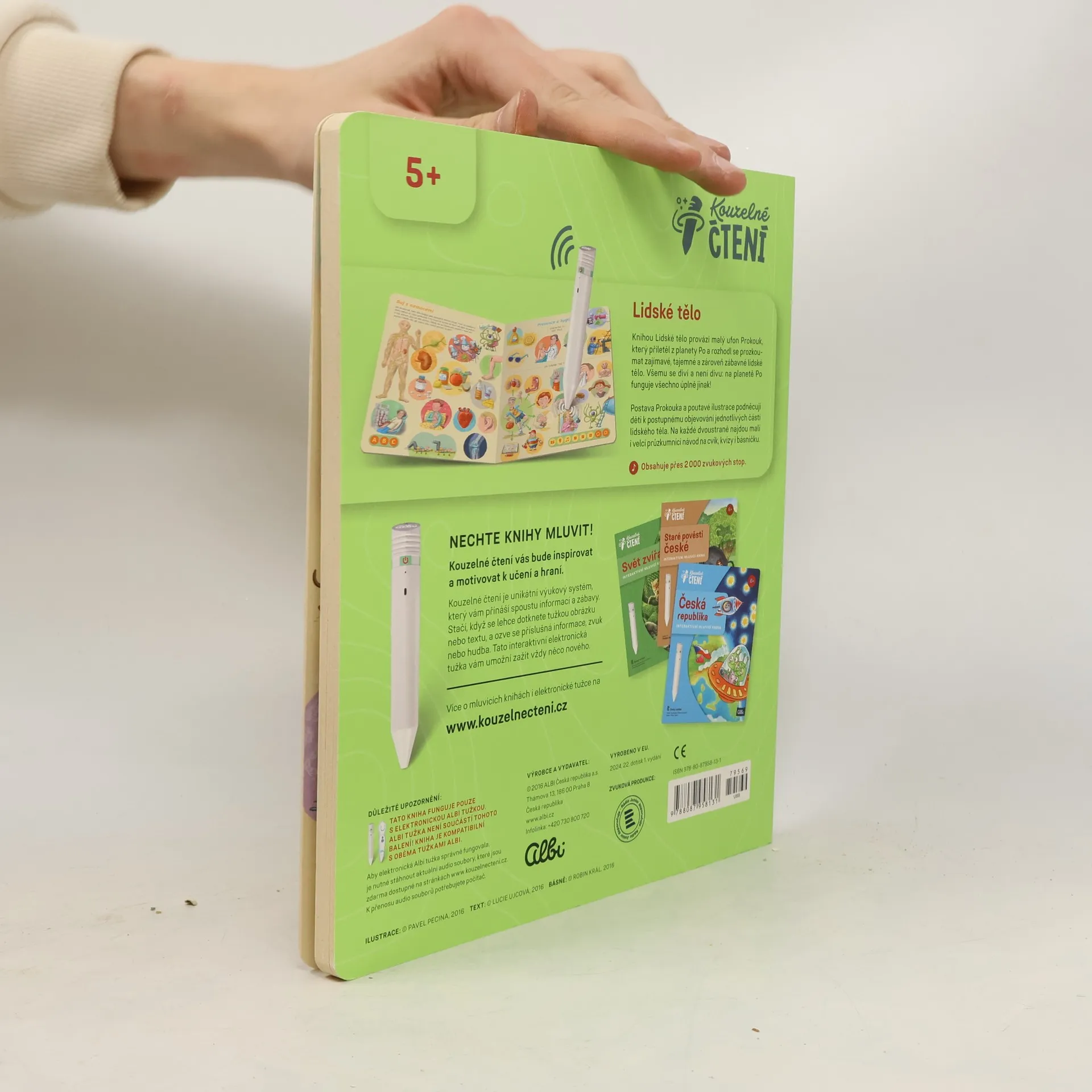 Interaktivní mluvící kniha z edice Kouzelné čtení, se kterou se děti již od 3 let dozvědí spoustu zajímavých a užitečných informací o našem těle. Knihou Lidské tělo provází malý ufon Prokouk, který přiletěl z planety Po, aby prozkoumal taje lidského těla. Všemu se diví a není divu: na planetě Po funguje všechno úplně jinak! Postava Prokouka a poutavé ilustrace podněcují děti k postupnému objevování jednotlivých částí a soustav lidského těla. Kniha je členěna do 8 kapitol a témata jsou např. Kosti a svaly, Mozek a nervy, Rozmnožování, Trávicí soustava, Srdce a plíce atd. Na každé dvoustraně najdou malí i velcí průzkumníci návod na cvik. Když si všechny cviky propojí, vznikne sestava, kterou si mohou zacvičit a krásně se přitom protáhnout. V knize Lidské tělo najdete také básničky, zábavné kvízy a speciální ikony, které děti vybízí, aby si získanou informaci zkusili doslava na vlastní kůži. Kniha obsahuje téměř 2000 zvuků a textů. Knihu ilustroval Pavel Pecina, básničky napsal Robin Král, texty Lucie Ujcová. Vzniklo ve spolupráci s Českým rozhlasem, knihu namluvili Tereza Bebarová a Jaroslav Plesl.