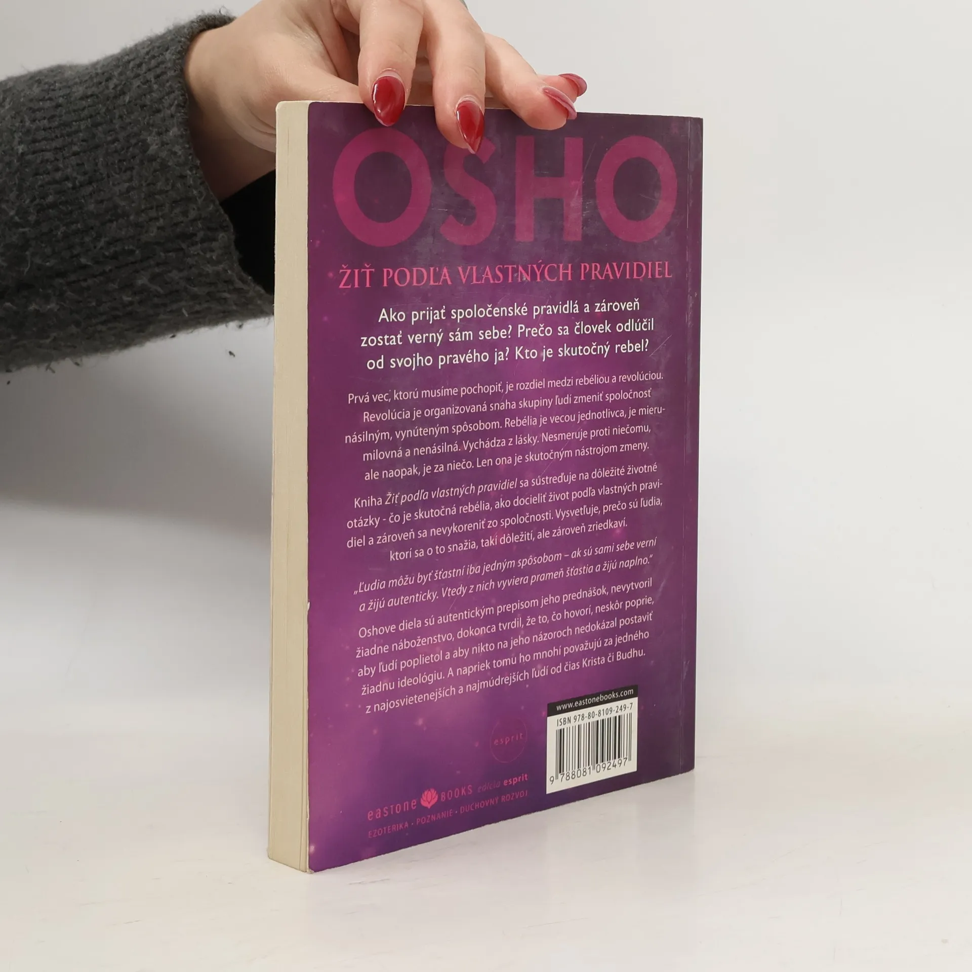 Ako prijať spoločenské pravidlá a zároveň zostať verný sám sebe? Prečo sa človek tak často vzdiali od svojho skutočného ja a čo s tým? Ako sa vyhnúť ľuďom so zlou energiou? Kniha Žiť podľa vlastných pravidiel sa sústreďuje na najdôležitejšie životné otázky každého človeka. Prostredníctvom praktických príkladov, vtipných porovnaní a diskusie s poslucháčmi nás Osho citlivo zoznamuje s odpoveďami, ktoré sa týkajú kvality nášho vnútorného sveta a našej existencie. Zrozumiteľne a jednoznačne ukazuje, aké sú prednosti života podľa vlastných pravidiel, ako ho docieliť a zároveň sa nevykoreniť zo spoločnosti a prečo sú ľudia, ktorí sa o to snažia, takí dôležití, ale zároveň zriedkaví.