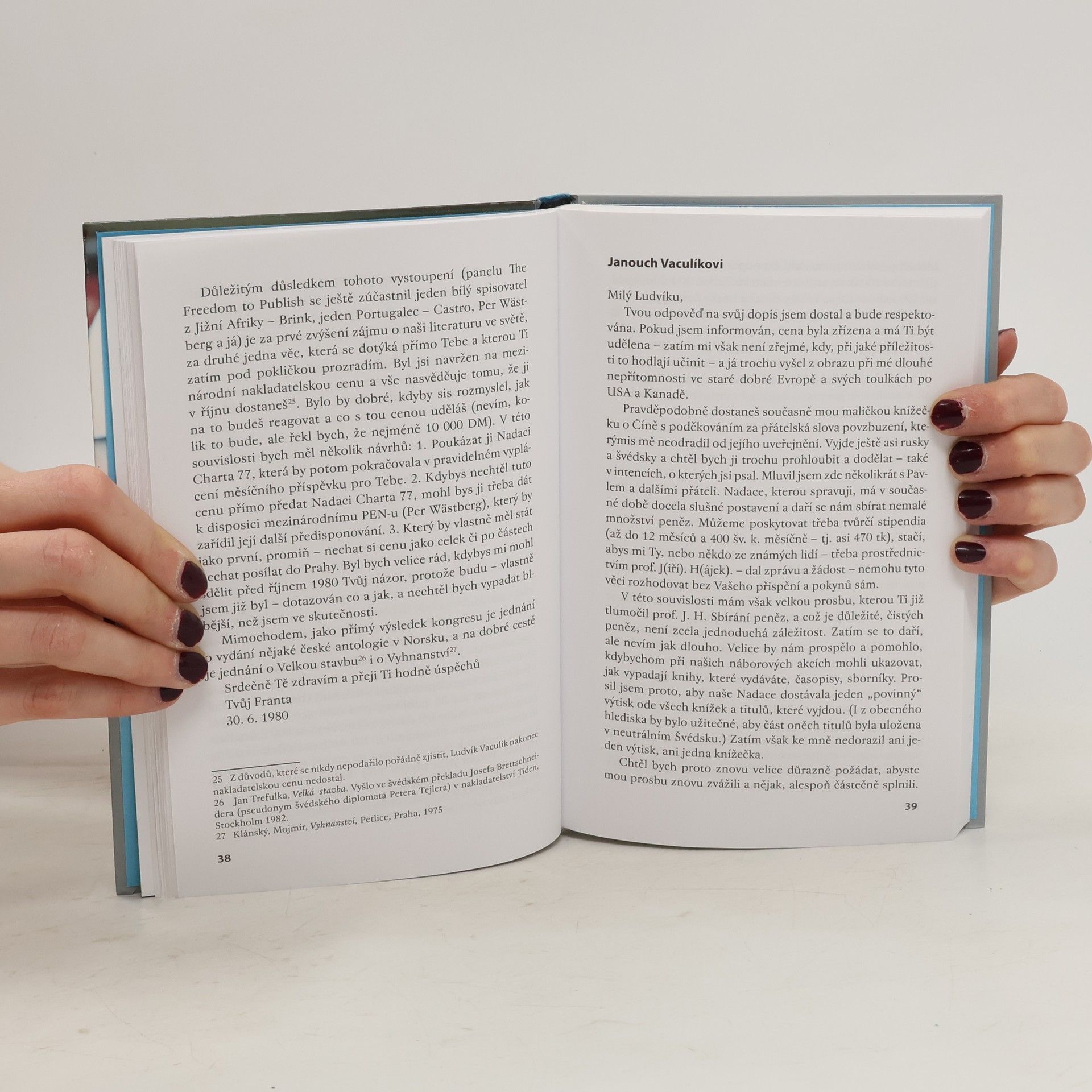 V archivu Františka Janoucha a Nadace Charty 77 se zachovalo několik tuctů dopisů, které si vyměnili spisovatel Ludvík Vaculík a fyzik František Janouch. Janouch založil v roce 1978 Nadaci Charty 77, kterou vede až do dnešního dne. Nadace Charty 77 významně podporovala desítky čs. intelektuálů a pomáhala při zveřejňování jejich tvorby. Korespondence je nejen poutavým čtením, ale přináší i zajímavá svědectví o intenzivní spolupráci mezi exilem a domovem. Svědčí i o tom, že ani tvrdý policejní útlak nedokázal zlomit vůli intelektuálů ke svobodě v okupovaném Československu.
