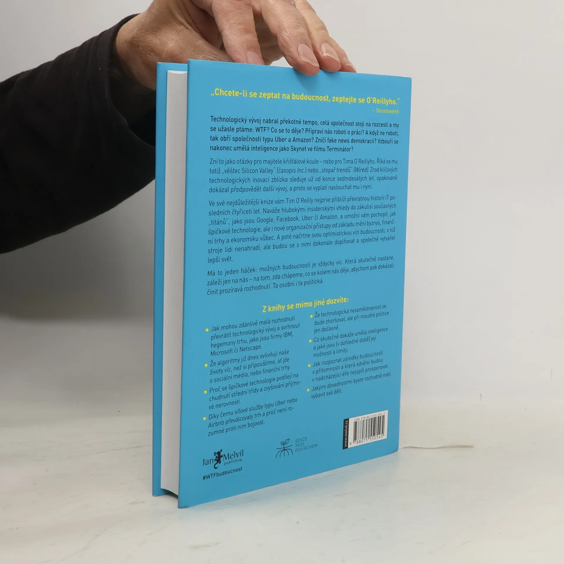 Technologický vývoj nabírá tempo, celá společnost stojí na rozcestí a my se užasle ptáme: WTF? Co se to děje? Připraví nás roboti o práci? A když ne roboti, tak obří společnosti typu Uber a Amazon? Zničí fake news demokracii? Vzbouří se nakonec umělá inteligence jako Skynet ve filmu Terminátor? Otázky jako pro majitele křišťálové koule... Ale přesně takovou pověst Tim O’Reilly má – „věštec Silicon Valley“ (časopis Inc.) nebo „stopař trendů“ (Wired). Zrod klíčových technologických inovací sleduje zblízka už od konce sedmdesátých let, opakovaně předpověděl další vývoj. Vyplatí se naslouchat mu i nyní.