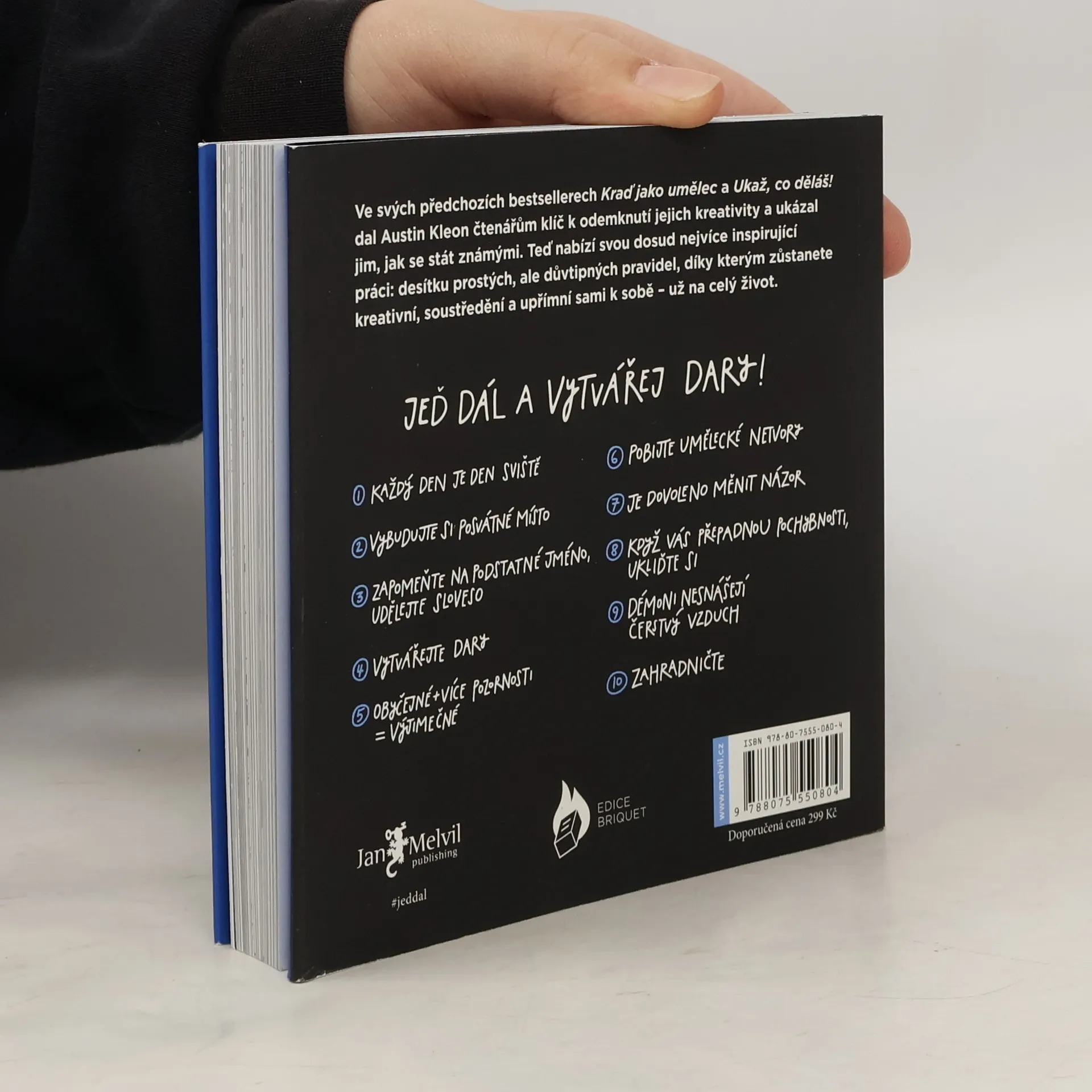Možná bychom sem už nemuseli nic psát, protože představovat Austina Kleona našim čtenářům je nejspíš zbytečné… Ale my se tak těšíme! Pojďme si to raději shrnout: novinka plná kreativního povzbuzení pro chvíle, kdy si myslíte, že už nikdy nic nevytvoříte, protože nápady došly, vyšla v originále letos v dubnu. Ve svých předchozích knihách – Kraď jako umělec a Ukaž, co děláš! (obě jsou mimochodem bestsellerem jak podle New York Times, tak i dle nás), nám Austin Kleon ukázal, jak objevit svou kreativitu a jak o sobě dát vědět světu. Nyní nabízí to nejdůležitější: deset pravidel, jak o kreativitu nepřijít, zůstat soustředěný a věrný sám sobě – a to celoživotně. Tvořivost není rovná cesta s jasným začátkem i koncem, ale spíše smyčka. Kniha je vtipným návodem na to, jak se v různých odbočkách naší práce a tvorby neztratit, jak nesejít z cesty a mít správně nastavený cíl. Austine, děkujeme, těšíme, jedeme dál!