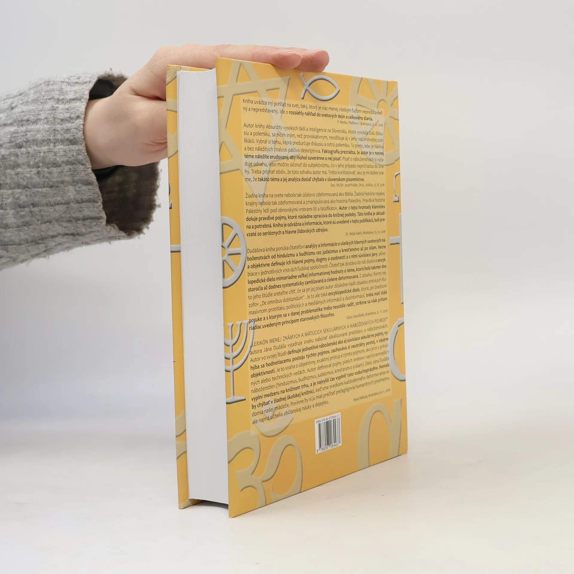 Vedec a vysokoškolský pedagóg doc. Ing. Ján Dudáš, DrSc. (autor knihy kritických reflexií Absurdity vysokých škôl a inteligencie na Slovensku) v novej publikácii ponúka čitateľovi analýzy a informácie o všetkých hlavných svetových náboženstvách od hinduizmu a budhizmu cez judaizmus a kresťanstvo až po islam. Vecne a objektívne definuje ich hlavné pojmy, dogmy a osobnosti a s nimi súvisiace javy, pôsobiace v jednotlivých vrstvách ľudskej spoločnosti. Čitateľ tak dostáva do rúk doslova encyklopedické dielo mimoriadne veľkej informatívnej hodnoty o téme, ktorá bola takmer dve storočia až podnes systematicky zamlčovaná a cielene deformovaná. Z obsahu i formy tejto štúdie zreteľne cítiť, že sa pri jej písaní autor dôsledne riadil zásadou antických filozofov De omnibus dubitandum (O všetkom treba pochybovať) a to isté očakáva aj od čitateľa. Je to také encyklopedické dielo, ktoré pri dnešnom masívnom protitlaku politických a mediálnych informácií a dezinformácií treba mať stále poruke a s ktorým sa v danej problematike treba ustavične radiť, striktne sa však pritom riadiac uvedeným princípom starovekých filozofov.