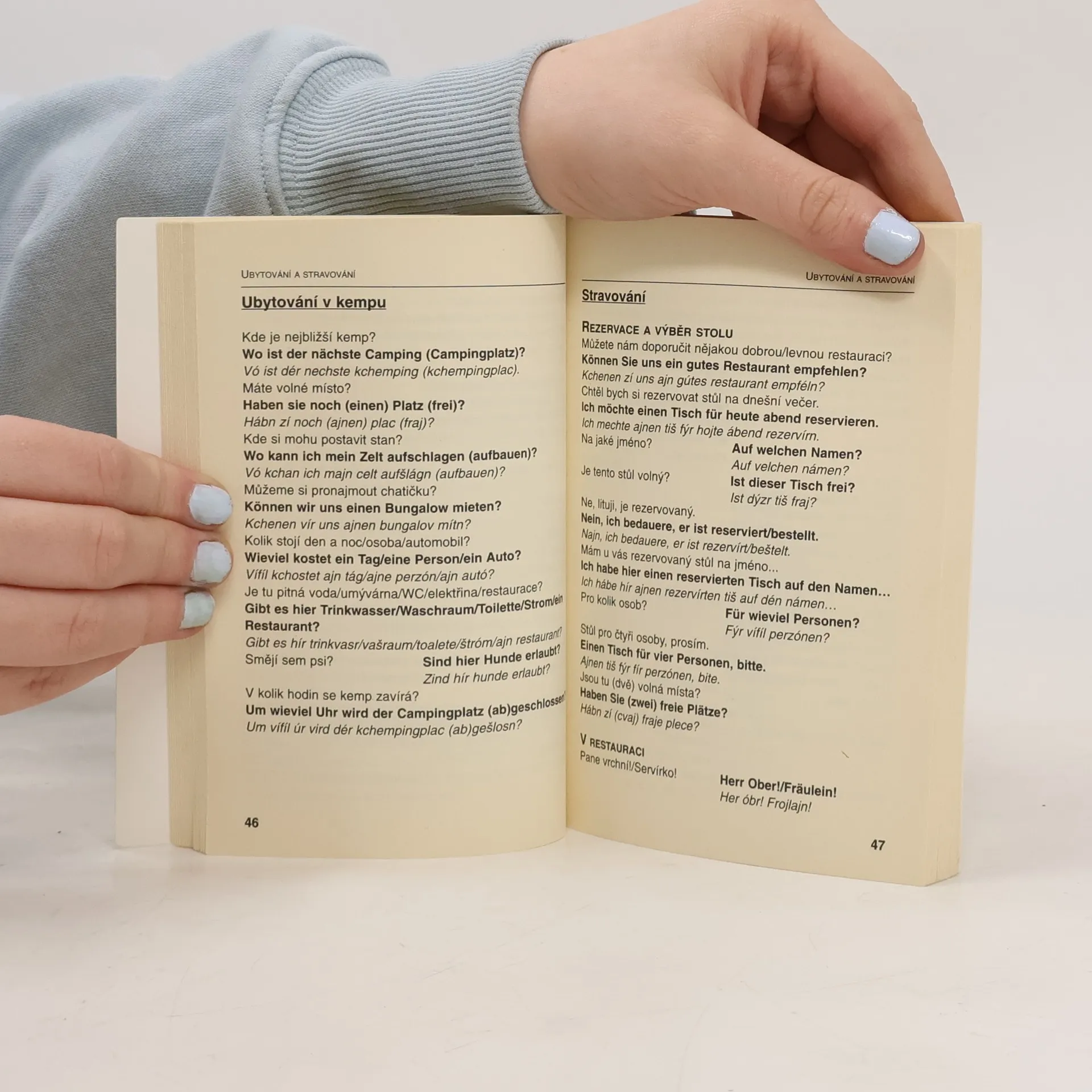 Konverzace zahrnující základní výrazy a fráze, důležité základní informace a fráze z oblasti cestování (vč. ubytování a stravování), kultury, sportu, služeb a užitečné výrazy ohledně úřadů, nákupování a zdraví.