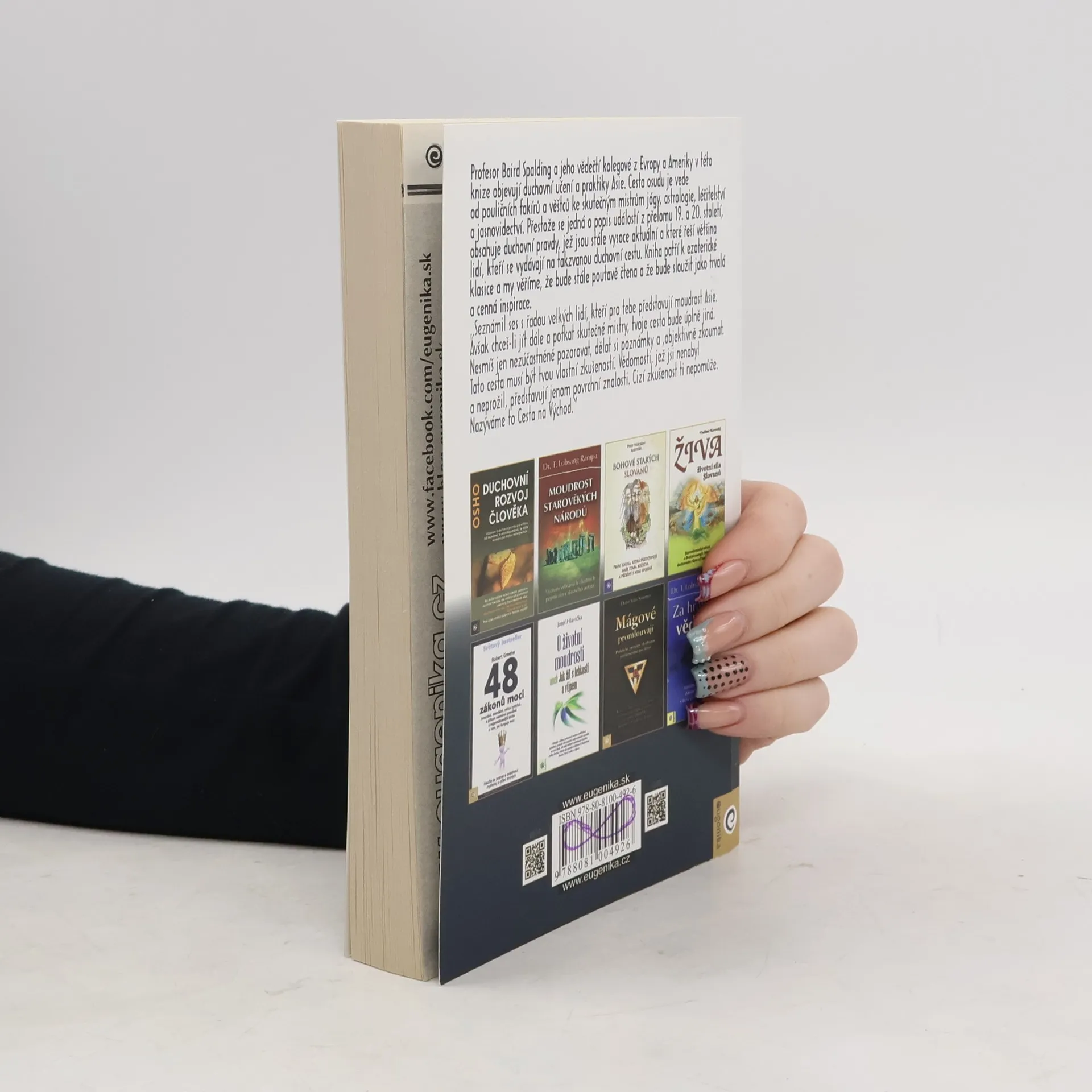 "Profesor Baird Spalding a jeho vědečtí kolegové z Evropy a Ameriky v této knize objevují duchovní učení a praktiky Asie. Cesta osudu je vede od pouličních fakírů a věštců ke skutečným mistrům jógy, astrologie, léčitelství a jasnovidectví. Přestože se jedná o popis událostí z přelomu 19. a 20. století, obsahuje duchovní pravdy, jež jsou stále vysoce aktuální a které řeší většina lidí, kteří se vydávají na takzvanou duchovní cestu. Kniha patří k ezoterické klasice a my věříme, že bude stále poutavě čtena a že bude sloužit jako trvalá a cenná inspirace. „Seznámil ses s řadou velkých lidí, kteří pro tebe představují moudrost Asie. Avšak chceš-li jít dále a potkat skutečné mistry, tvoje cesta bude úplně jiná. Nesmíš jen nezúčastněně pozorovat, dělat si poznámky a ‚objektivně zkoumat‘. Tato cesta musí být tvou vlastní zkušeností. Vědomosti, jež jsi nenabyl a neprožil, představují jenom povrchní znalosti. Cizí zkušenost ti nepomůže. Nazýváme to Cesta na Východ.“