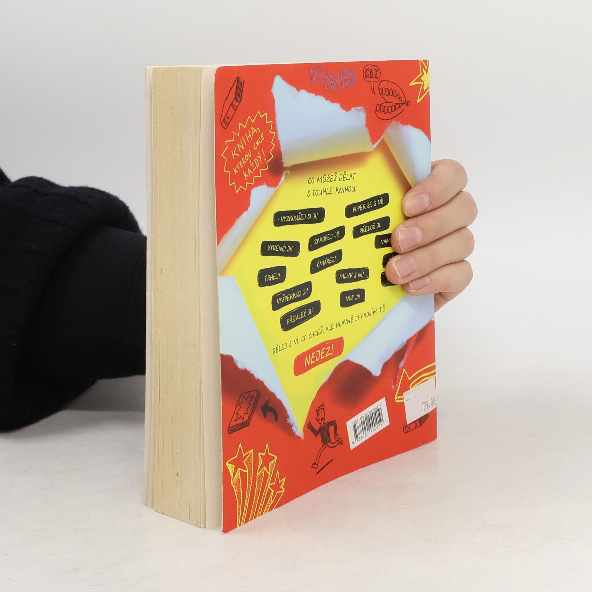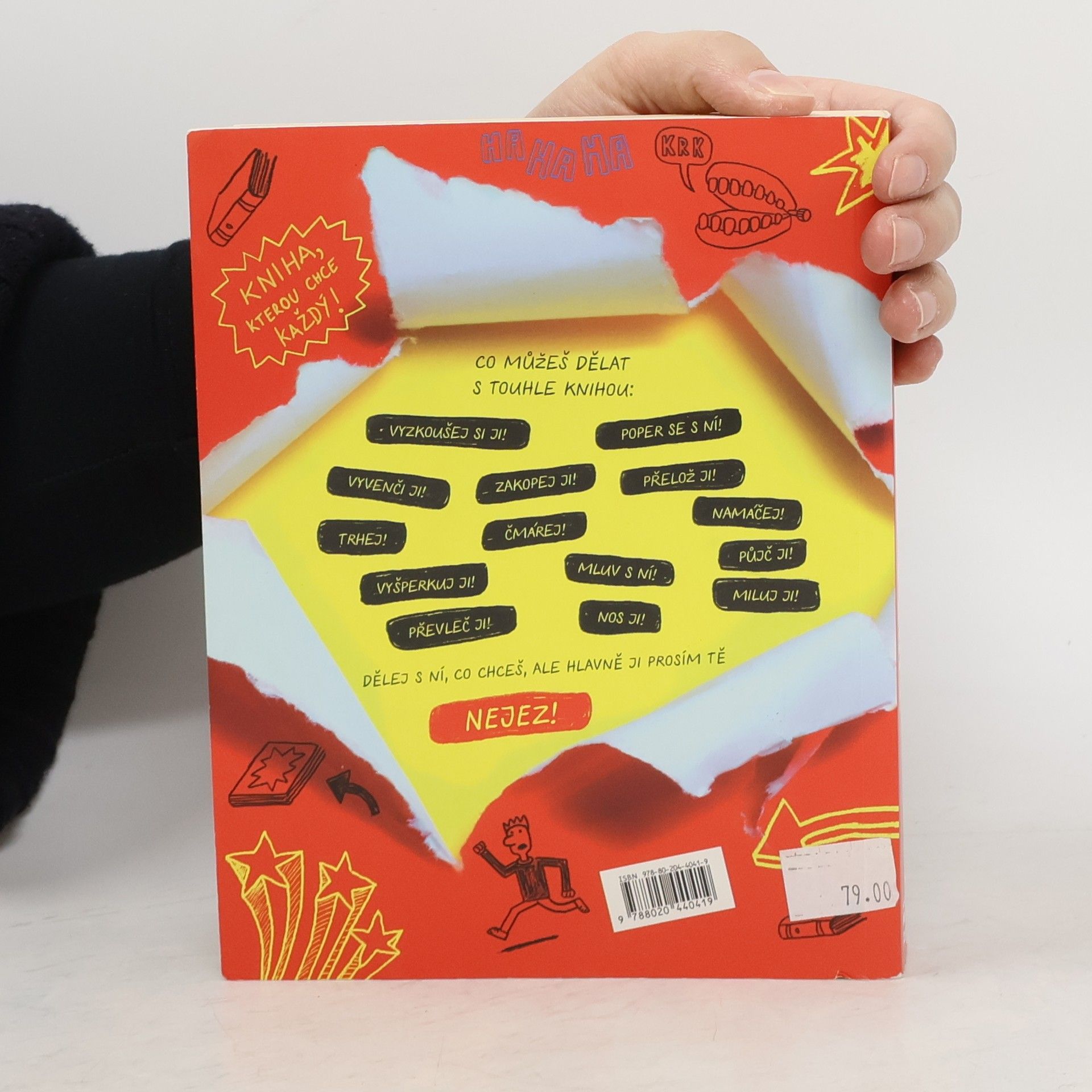 Je to kniha nekniha. V čem to spočívá? Každá stránka totiž vybízí k nějaké naprosto originální a bláznivé aktivitě. Čtenář je zároveň i tvůrcem. A pořádně se při tom vyřádí. Terapie? Proč ne? Anebo taky prostě jenom zábava. Co všechno se s touhle knížkou a v ní dá dělat? Nakreslit autoportrét poslepu. Balancovat s ní na rameni. Přejet ji bicyklem. Čmárat, lepit, stříhat a gumovat. Prolézt stránkou skrz naskrz. Vzít knížku na procházku. Pocákat ji barvou. Nakreslit do ní komiks. Někoho s ní napálit. Popsat ji tajnými vzkazy. Hlavně ji ale nejezte!