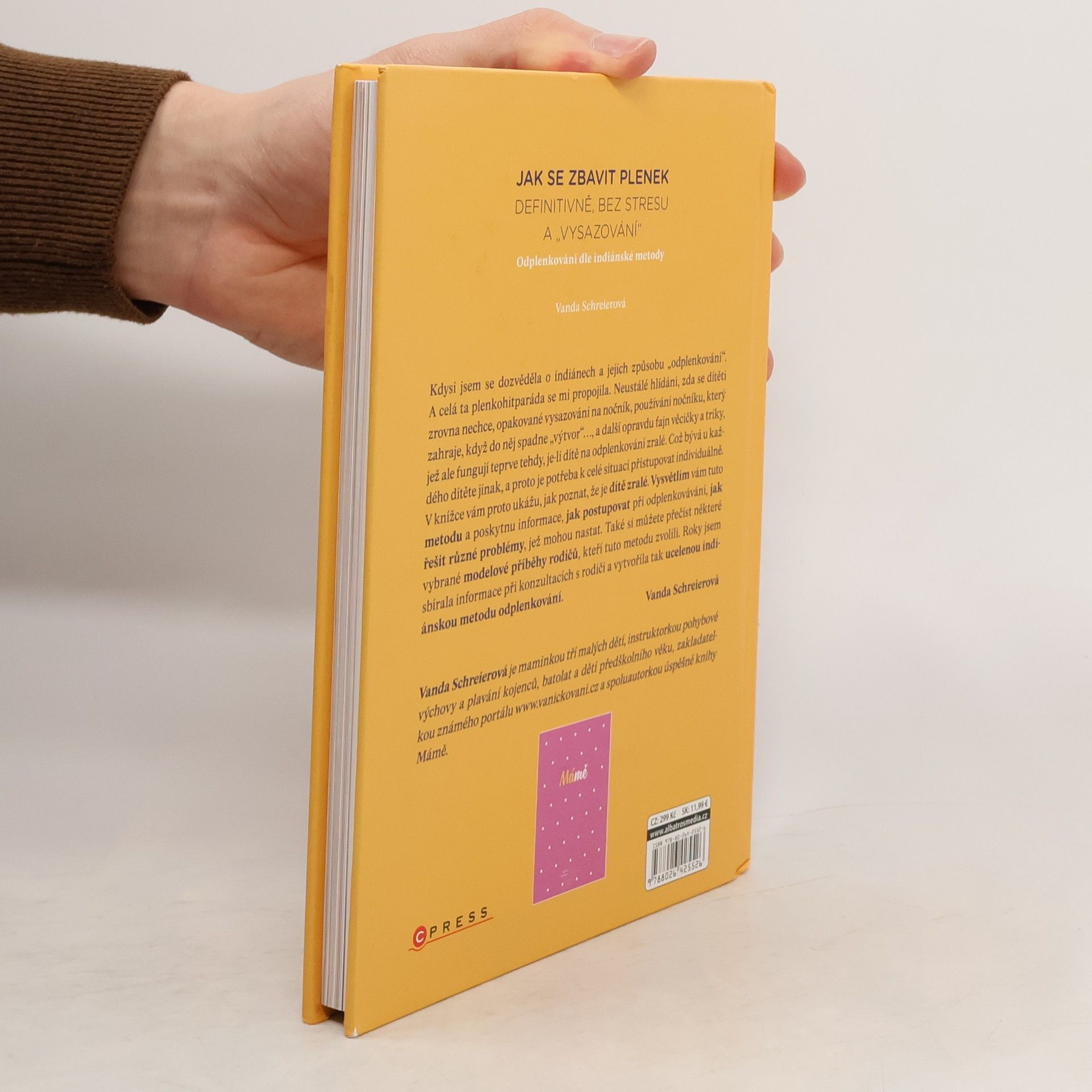 Definitivně, bez stresu a „vysazování“ – odplenkování dle indiánské metody. Slýcháte, že byste už měli zatočit s plenami? Že vy už jste byli v roce bez nich a vaše zlatíčko je má ještě teď, v roce a půl, nebo nedej bože ve dvou letech? Je vám taktně nebo netaktně naznačováno, že jste něco zanedbala? Nic jste neprošvihla, nebojte. Dříve společnost tlačila, soutěžila a ten, kdo poctivě nevysazoval na hrneček své ještě nesedící dítě, byl… No ono to vlastně bylo něco dost neslýchaného, a tak se cepovalo, vysazovalo a z vylučování se stala óda na dokonalou matku. Vždy učesanou, připravenou, s čistým miminkem a vyžehleným prádlem. Společnost jde kupředu a s tím i volnost člověka, jeho individualita, vzdělání i víra. Uf, už je to za námi. Pojďte si přečíst o tom, kdy je dítě skutečně schopné uvědomovat si potřebu vylučování a reagovat na ni. A co víc, vědomě uvolnit svěrače a vědět, co dělá. Jedině tehdy je dítě schopné se bez stresu a cepování zbavit plenek. A to trvale! Kniha představuje metodu, která funguje, protože je přirozená, a fungovala miliony let před námi, než přišly společenské konvence a tlak na dokonalé matky.