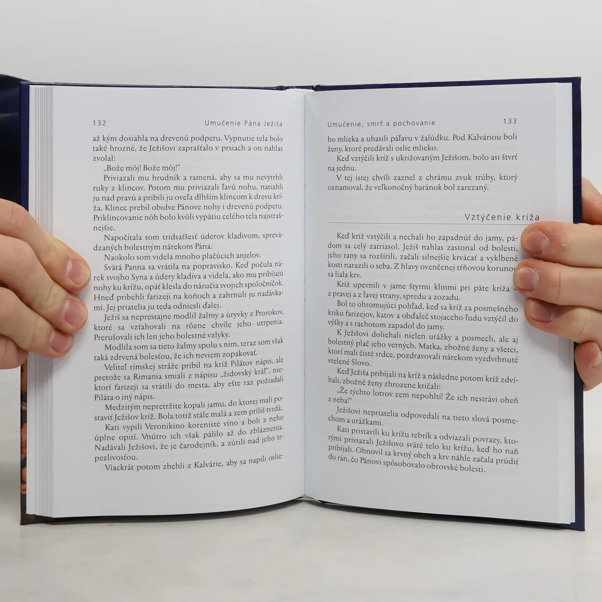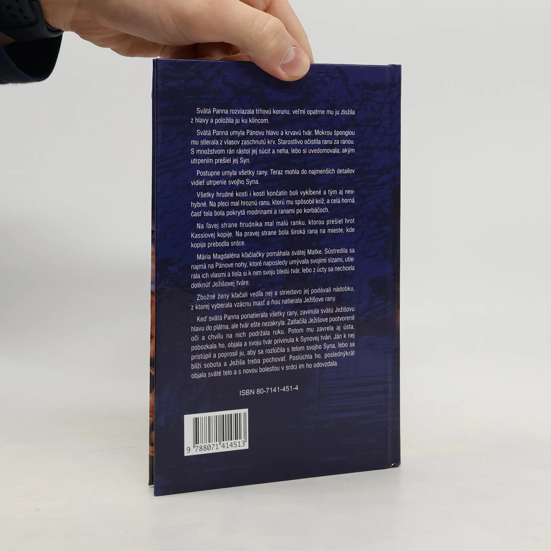 Svätá Panna opatrne zložila tŕňovú korunu z hlavy svojho Syna a umyla mu krvavú tvár. Súcitne čistila jeho rany, pričom si uvedomovala hrozné utrpenie, ktorým prešiel. Postupne umyla všetky rany a videla, ako sú jeho kosti vykĺbené a neohybné. Na pleci mal hroznú ranu od kríža, jeho horná časť tela bola pokrytá modrinami a ranami po korbáčoch. Na hrudníku mal ranu od Kassiovej kopije, ktorá prebodla srdce. Mária Magdaléna mu pomáhala, sústredila sa na Pánove nohy, ktoré umývala svojimi slzami a utierala ich vlasmi, nechcela sa dotknúť Ježišovej tváre. Zbožné ženy kľačali vedľa a podávali jej nádobku s masťou, ktorou natierala Synove rany. Keď svätá Panna ponatierala všetky rany, zavinula Ježišovu hlavu do plátna, ale tvár ešte nezakryla. Zatlačila mu pootvorené oči, zavrela ústa, pobozkala ho a objala, pričom si privinula tvár k jeho. Ján jej potom pripomenul, aby sa rozlúčila s telom svojho Syna, lebo sa blíži sobota a Ježiša treba pochovať. Poslúchla ho, naposledy objala sväté telo a s novou bolesťou v srdci im ho odovzdala.